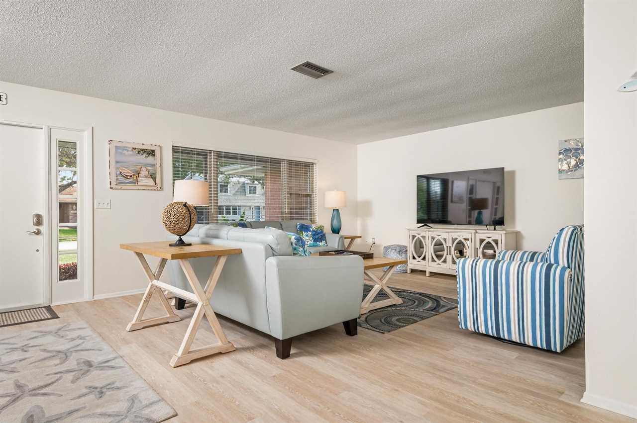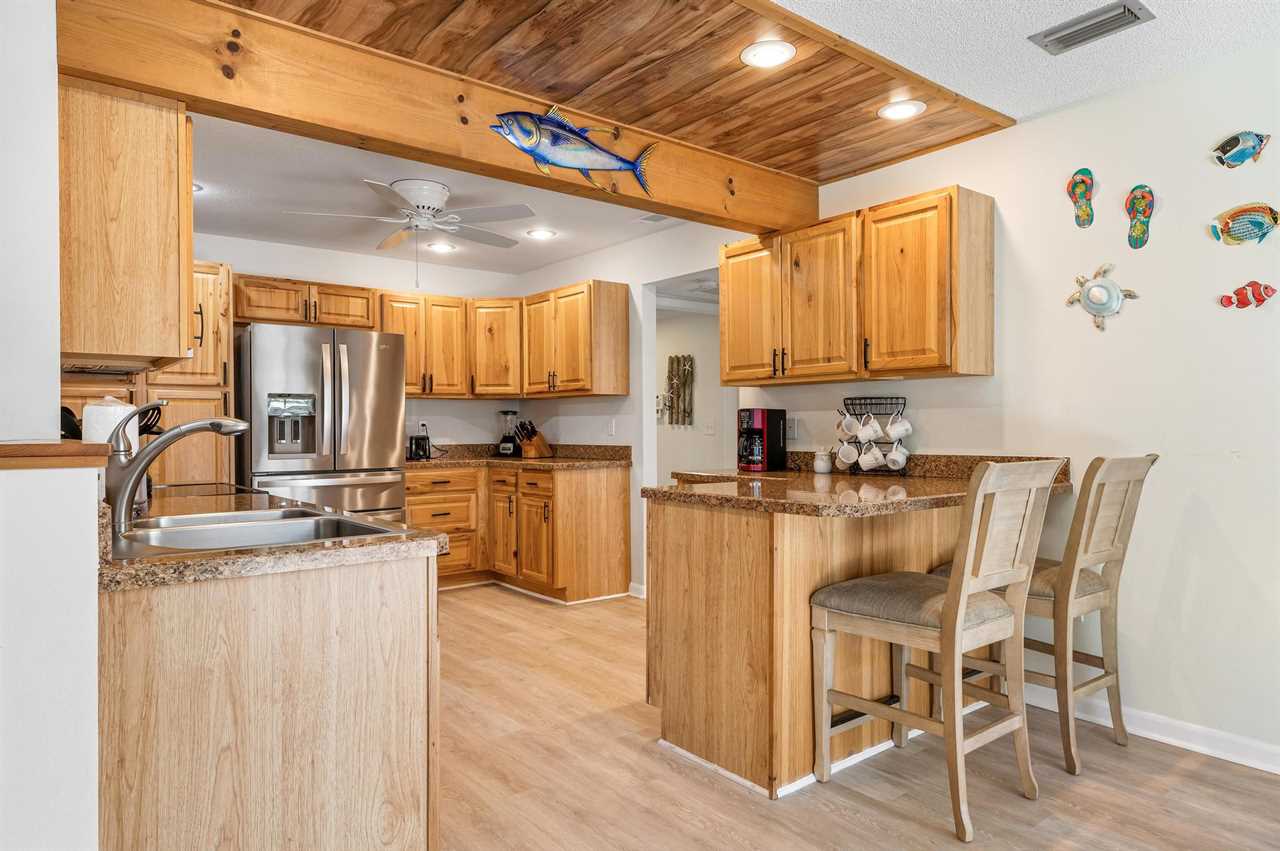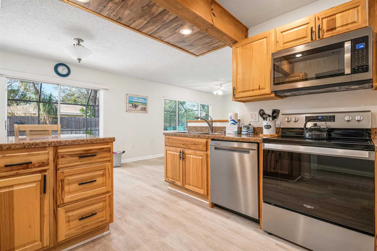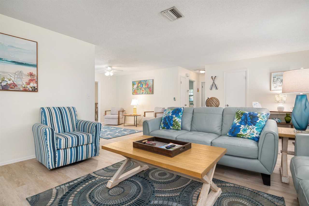 Pulling up to the property, you will be greeted by lush tropical flora and well-maintained landscaping that will make you feel like you are in paradise. When entering the home you will be greeted by a cozy living room with plenty of seating, including 2 leather couches, and a large smart TV. From here you can walk straight through to another seating area that leads to the kitchen and dining rooms. The kitchen offers stainless steel appliances for your use and also includes all the dishes, utensils, and cookware you would need to make all of your favorite meals from home. The dining room has a table that comfortably sits 8 and has plenty of natural light coming through the window behind it.