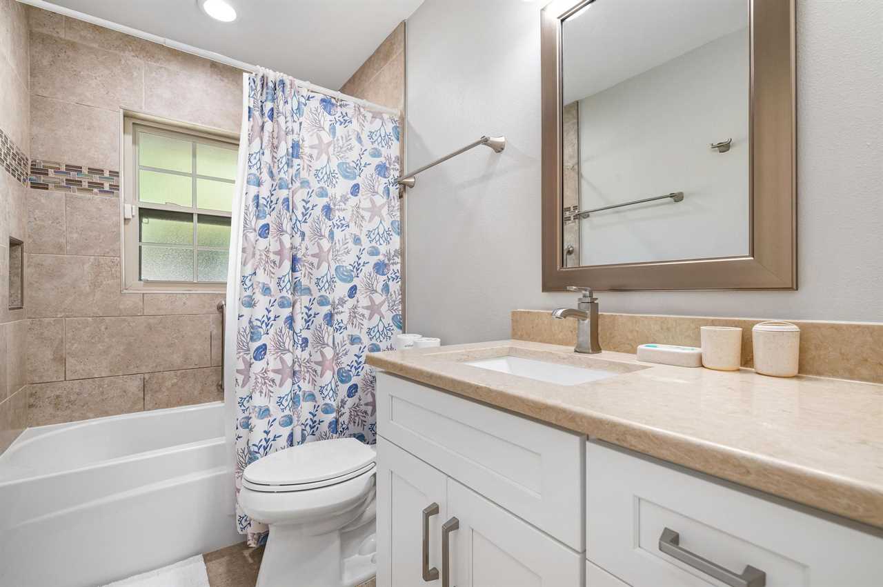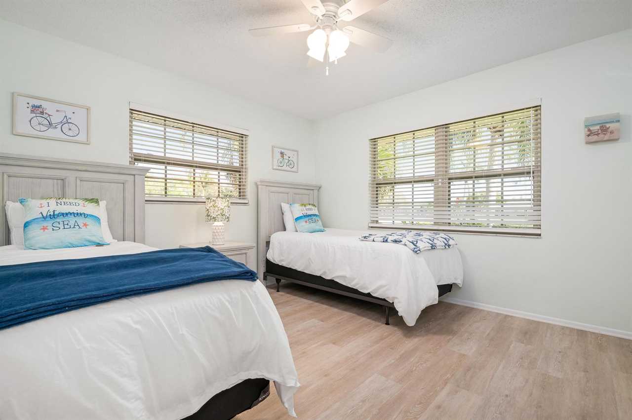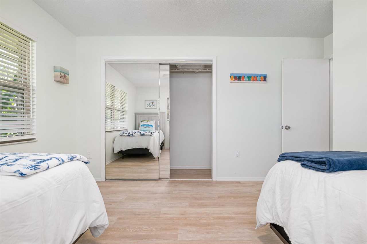 Trying to figure out sleeping arrangements? The master bedroom overlooks the pool and garden area. The room features a king-sized bed, a wall-mounted television, a walk-in closet, and an en-suite bathroom. The other guest rooms are located towards the front of the house and include one queen bedroom and another bedroom with two XL (extra long) twin beds. Both bedrooms have access to the hallway bathroom with a tub/shower combination. Office/Den - Full pullout sofa bed. This room also contains a desk if you need to do any work during your stay.