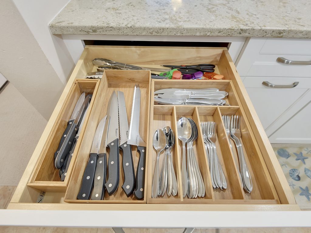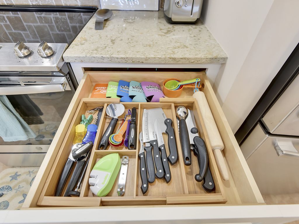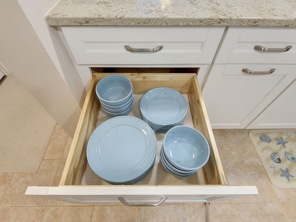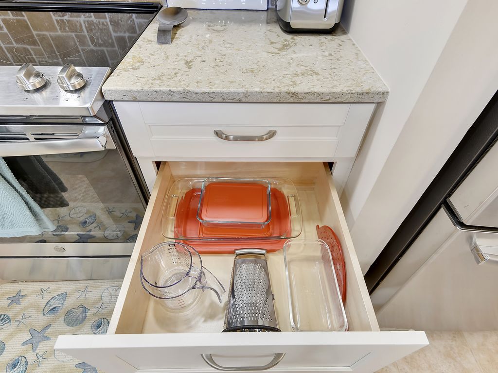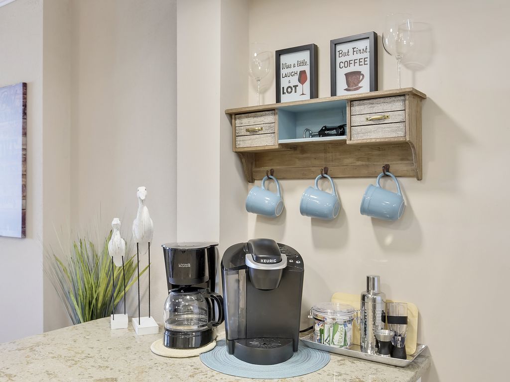 The well-stocked kitchen includes all new appliances (stove, refrigerator/ice maker, dishwasher, washer/dryer), a ceiling fan and garbage disposal, along with a Keurig and regular coffee maker, crock pot, toaster, blender (for those Margaritas!), pots, pans, dishes and utensils.