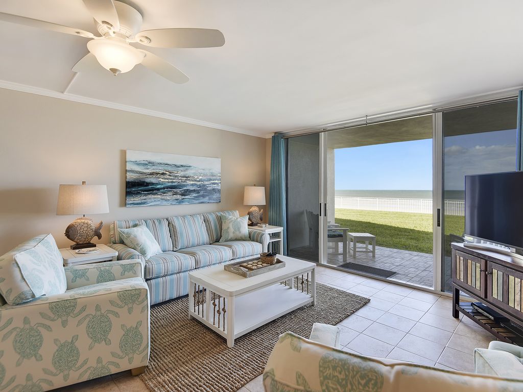 The living room features a 48in SMART (Netflix, Hulu, Prime movies) 4k HDMI TV and DVD player, along with a comfy couch and chairs that are perfect for taking in a view of the pristine Atlantic Ocean.