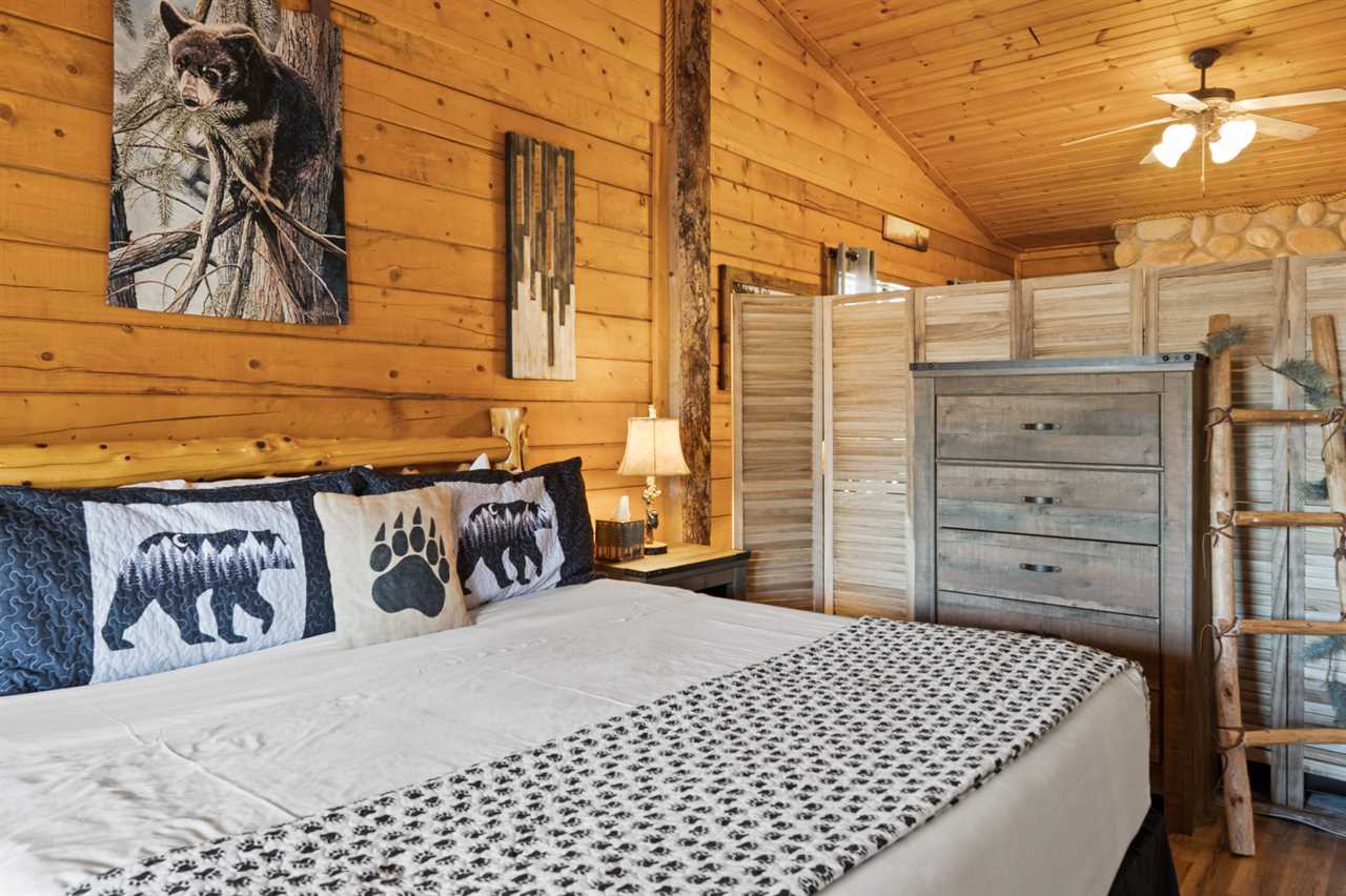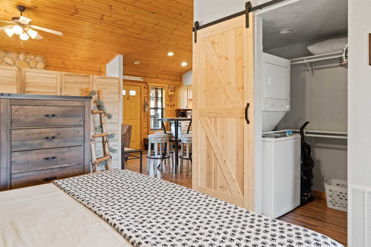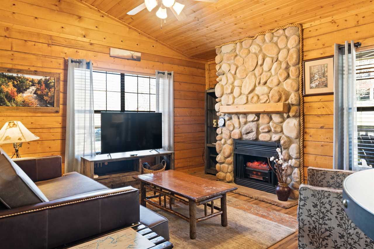 Welcome to your cozy and romantic studio-style cabin located in the heart of Branson, MO, just beside the Tanger Outlets and minutes away from the city's top shows and attractions. This cabin is the perfect spot for a private and relaxing getaway with your loved one. Upon entering the cabin, you will find a spacious and comfortable king-size bed, perfect for a great night's sleep after a day of exploring the city. The cabin also features a seasonal gas fireplace, perfect for snuggling up during the colder months. The full kitchen is equipped with everything you need to prepare a romantic meal for two, including a stove, oven, refrigerator, and microwave. You can enjoy your meal in the cozy dining area, or step outside onto your covered balcony to enjoy the fresh air and beautiful views. Cable TV and WiFi are available throughout the cabin, along with an in-unit washer and dryer. Guests also have access to a seasonal outdoor pool and can enjoy discounts on area shows, attractions, and rounds of golf at Thousand Hills.
