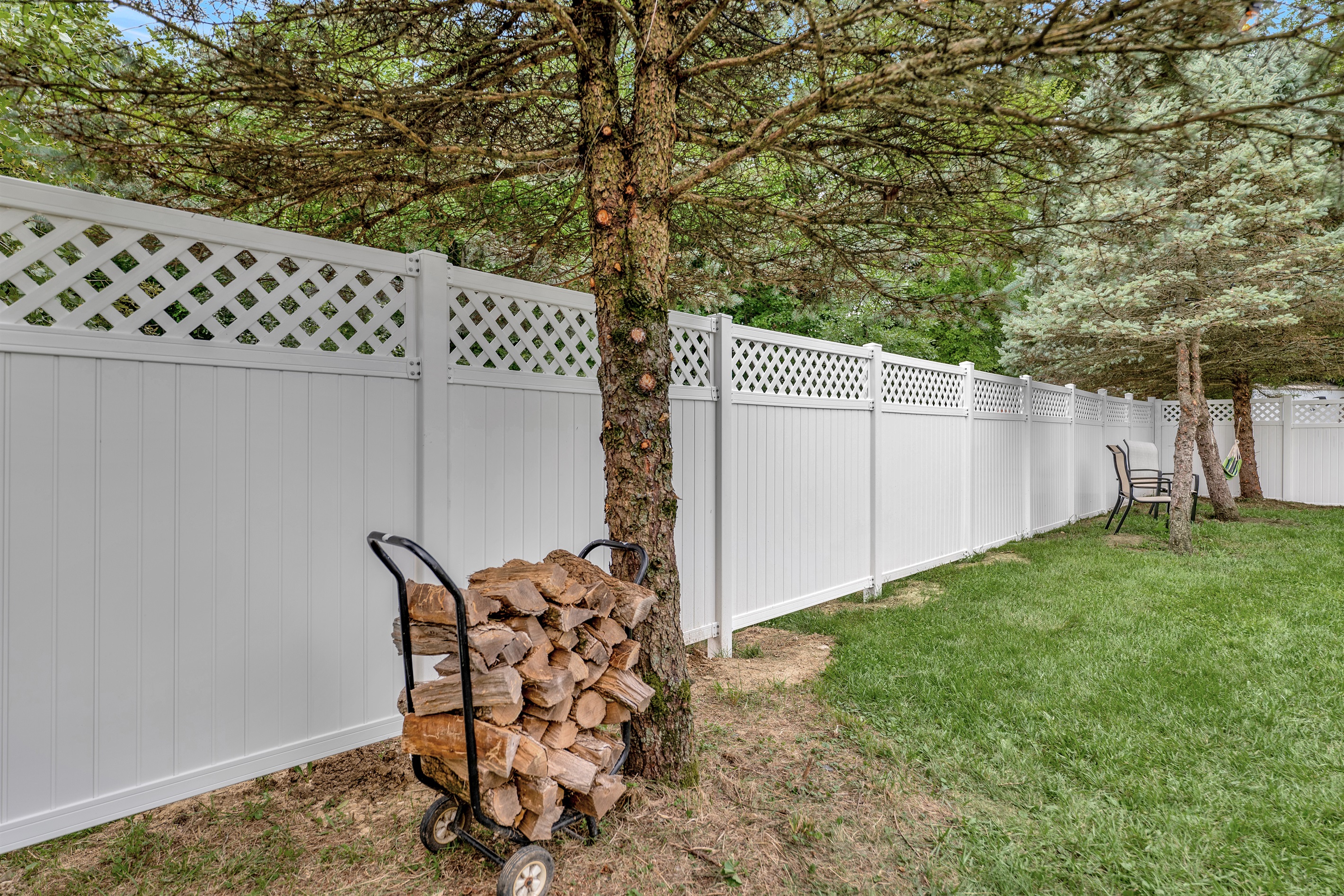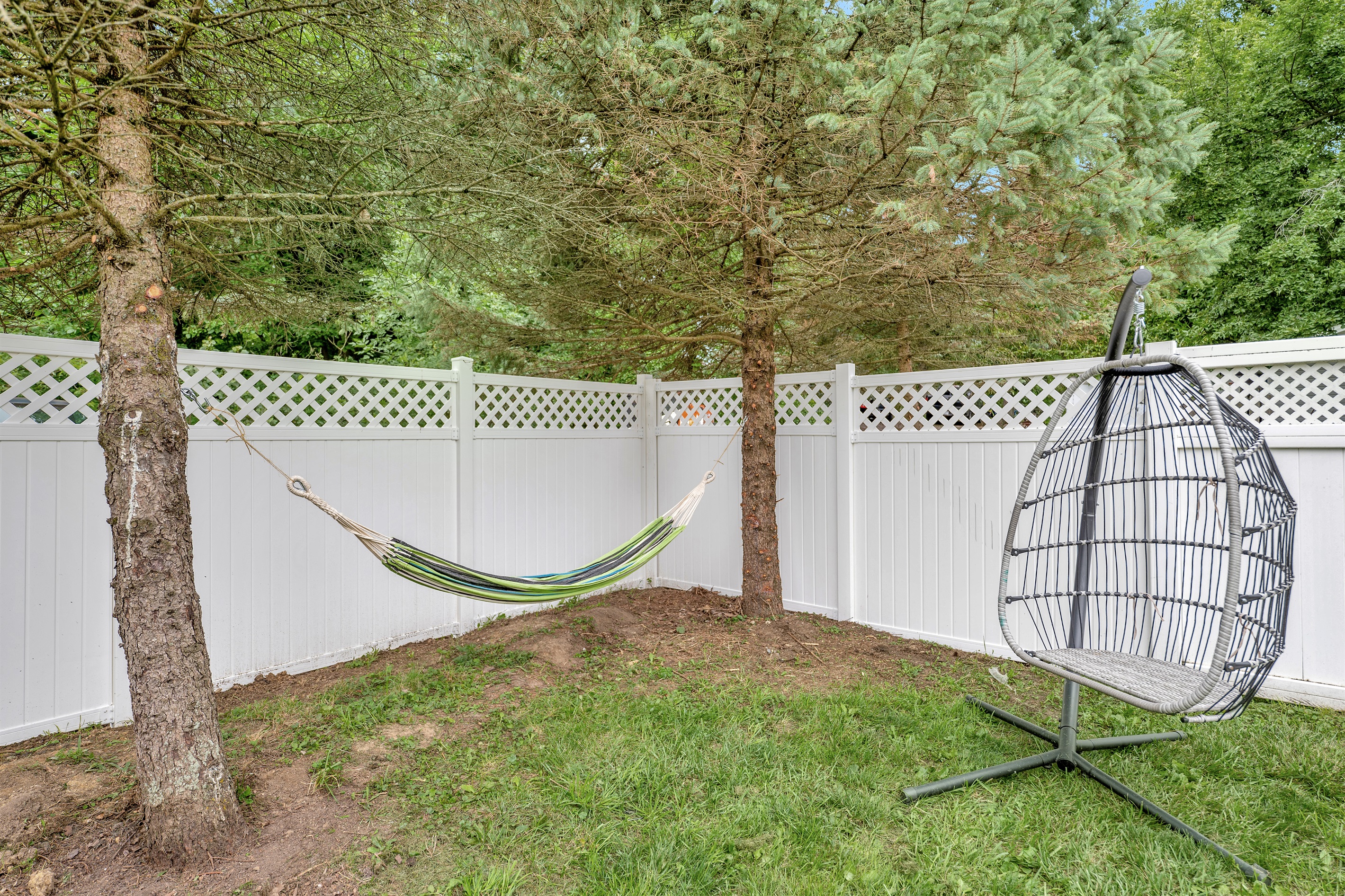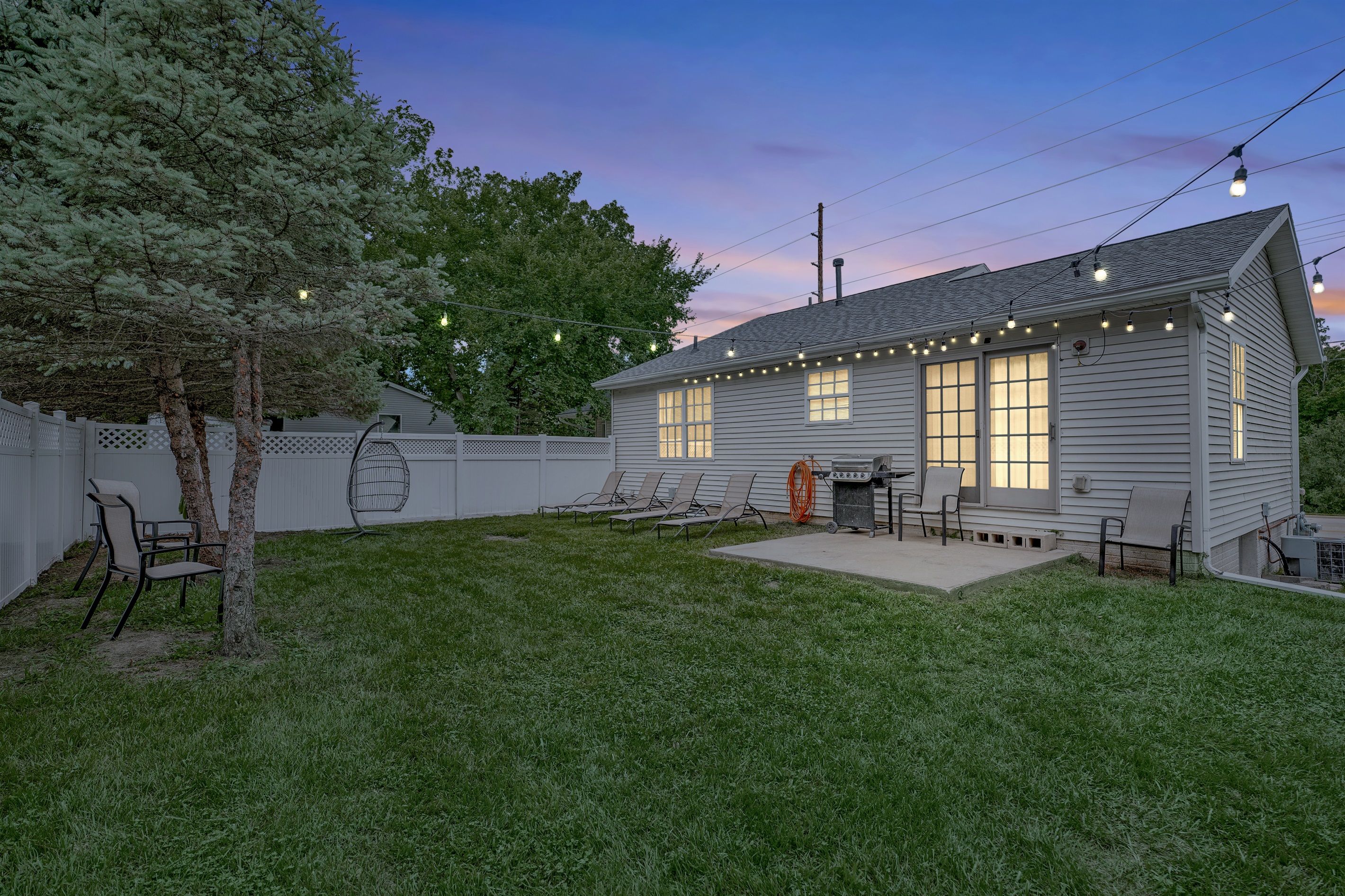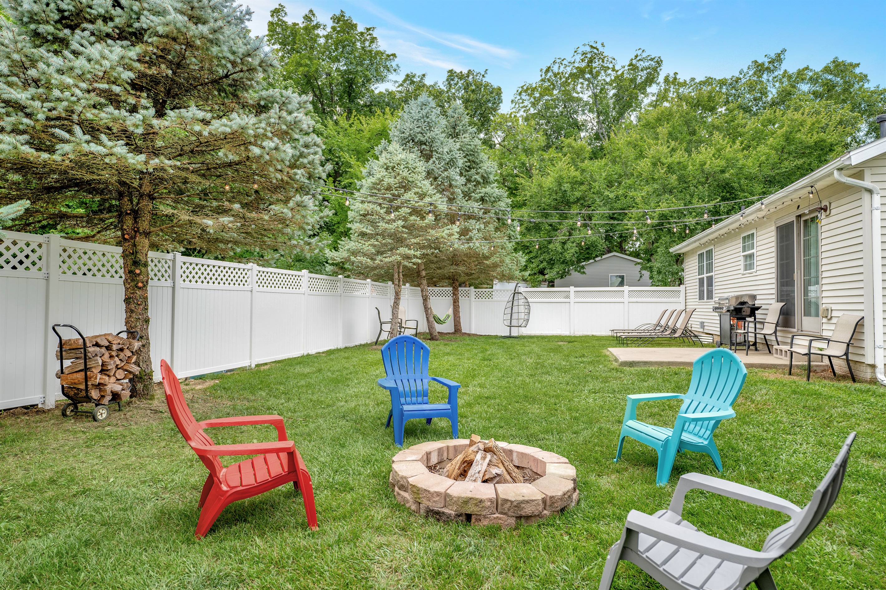 The backyard is well lit with string lights has ample seating, a fire pit, grill and more.