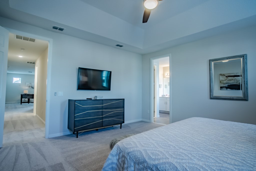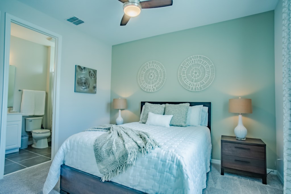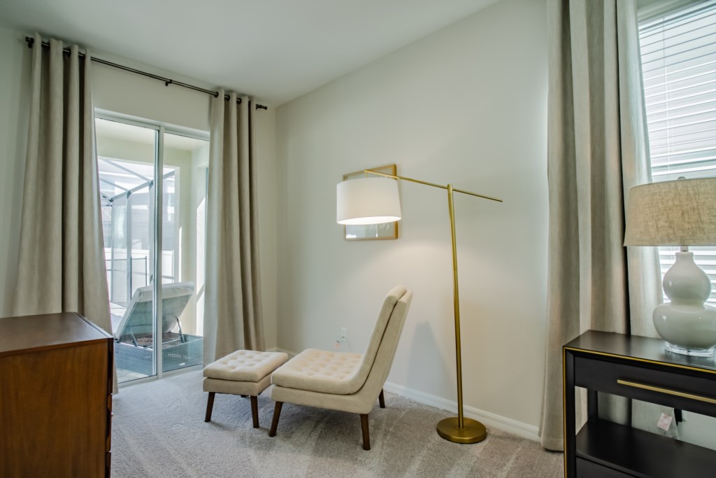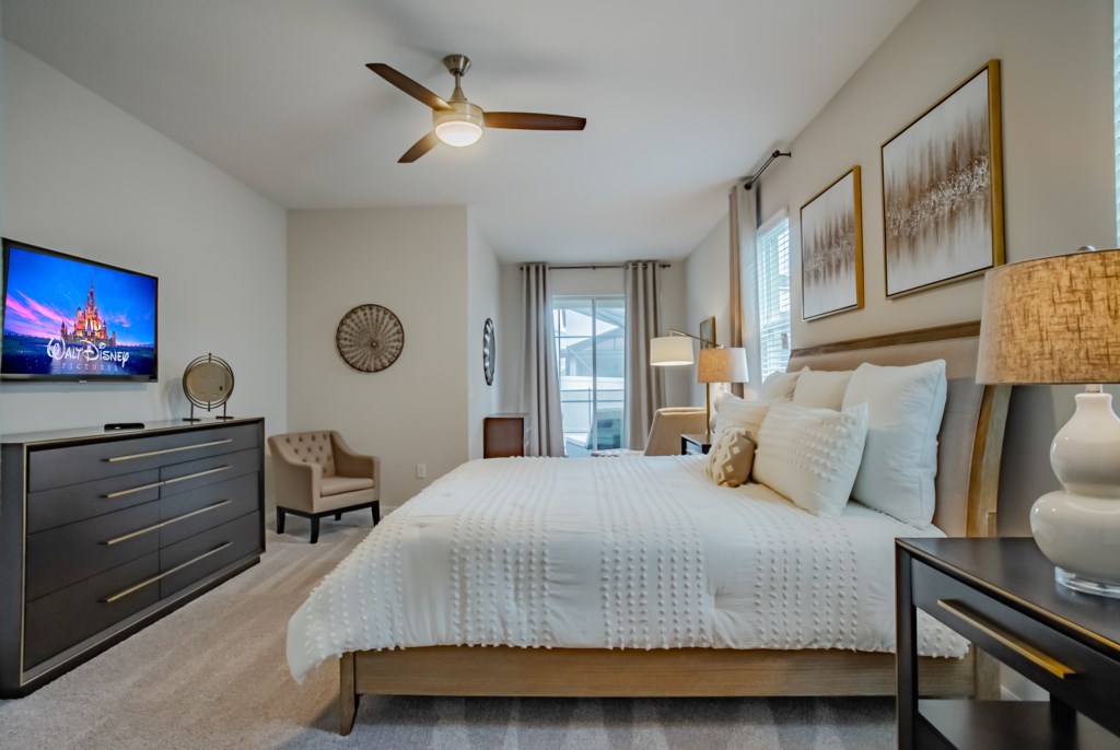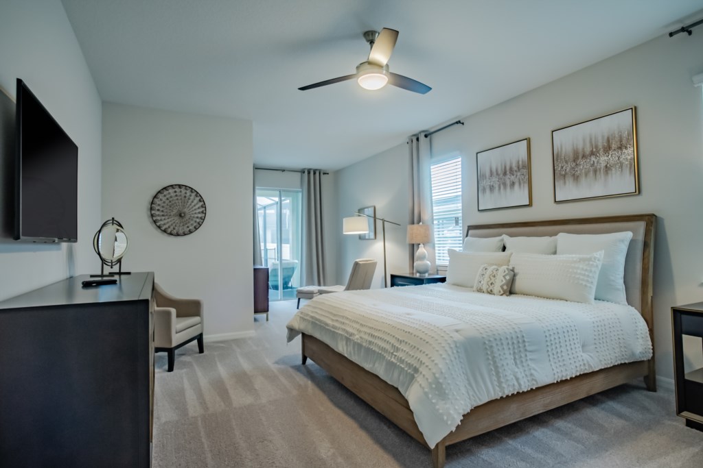 • Bedroom 2: 1 king bed with TV, private bathroom, and access to the pool area