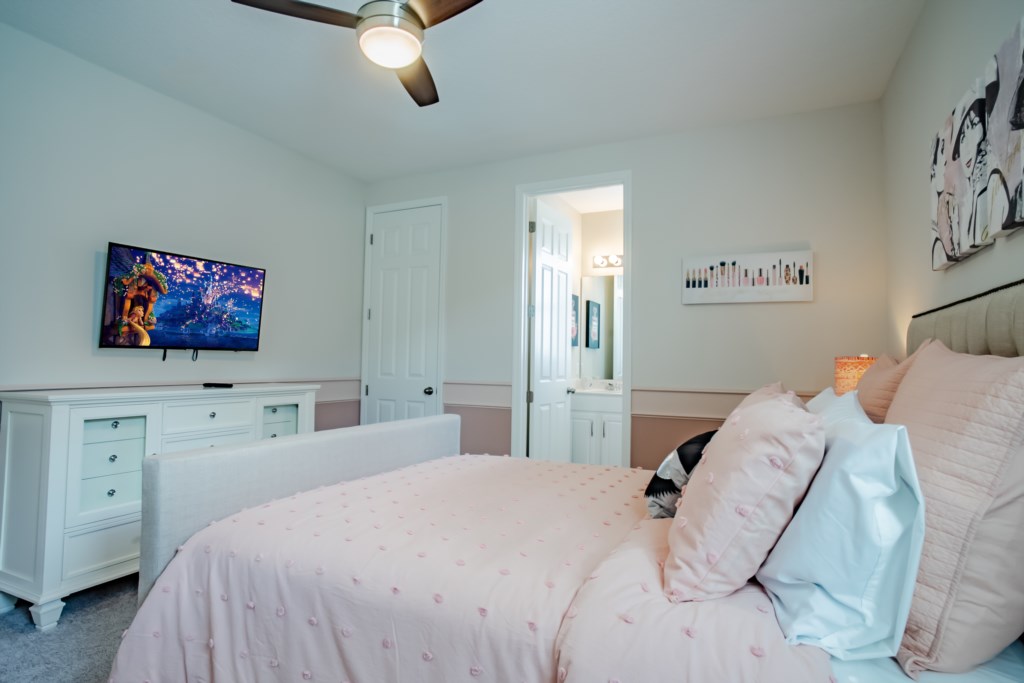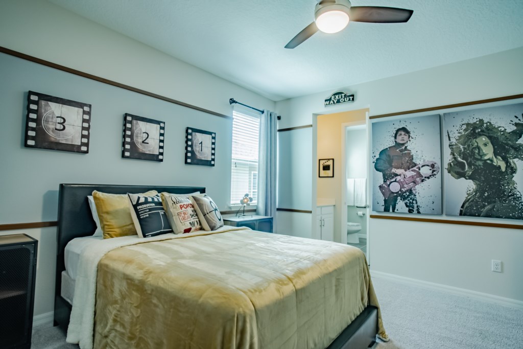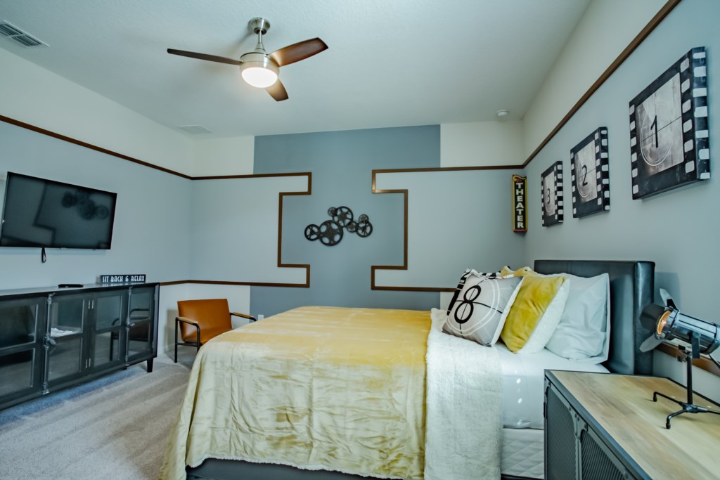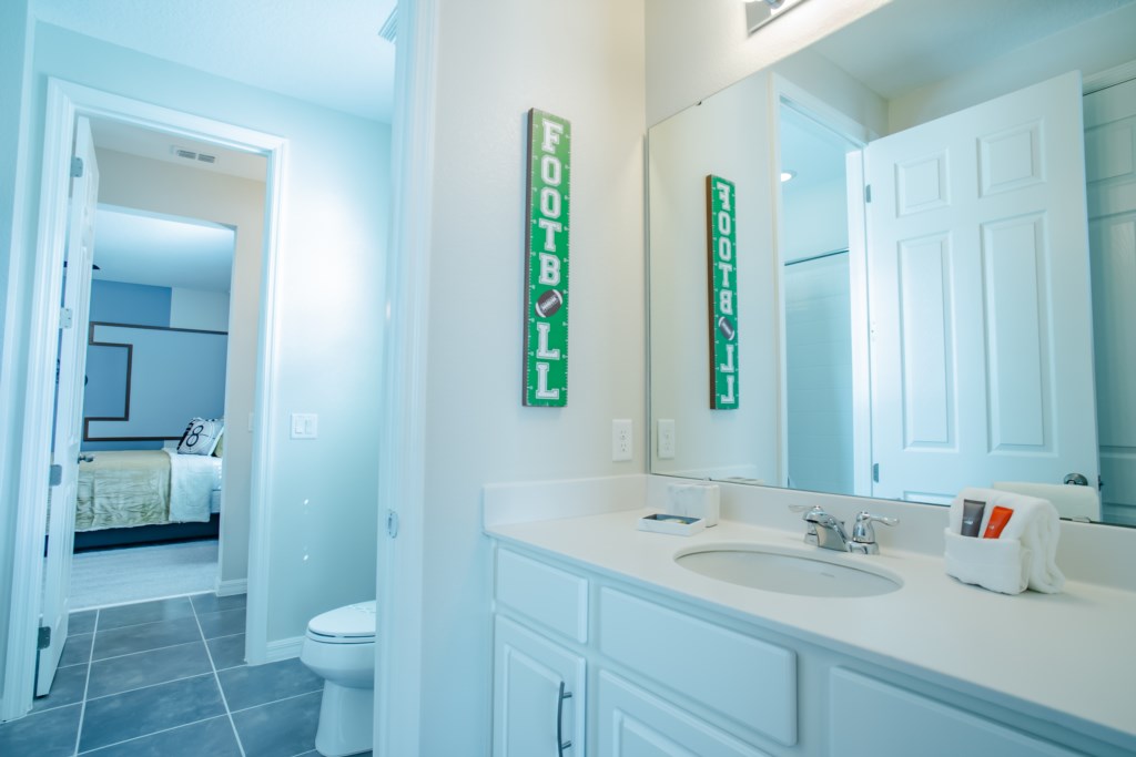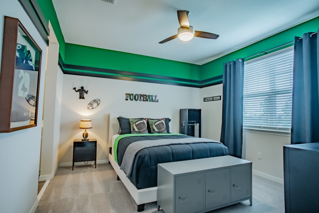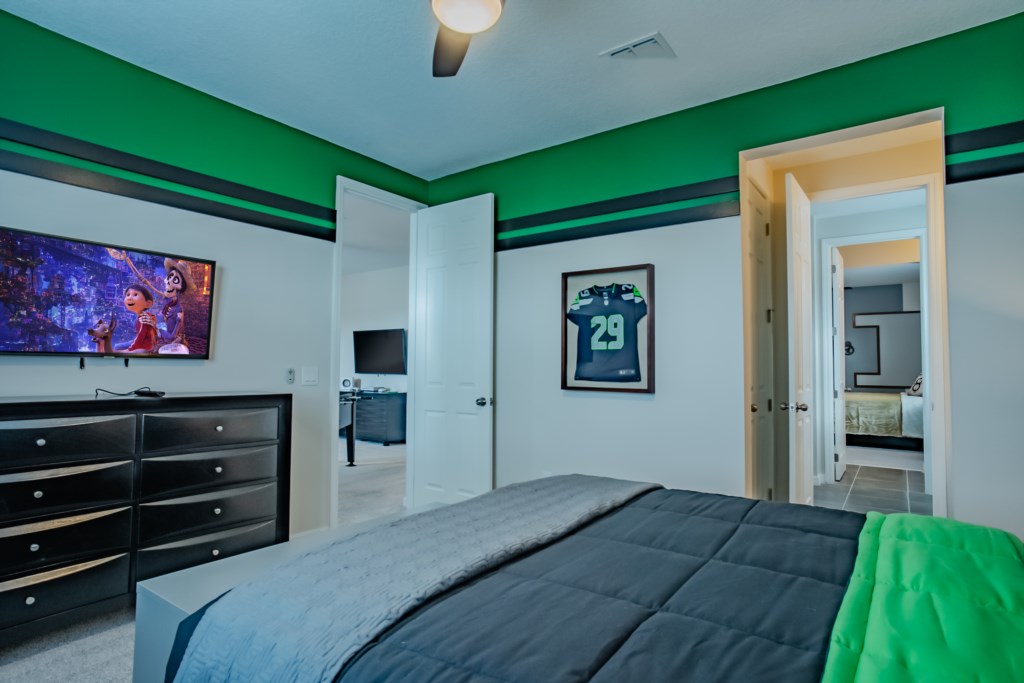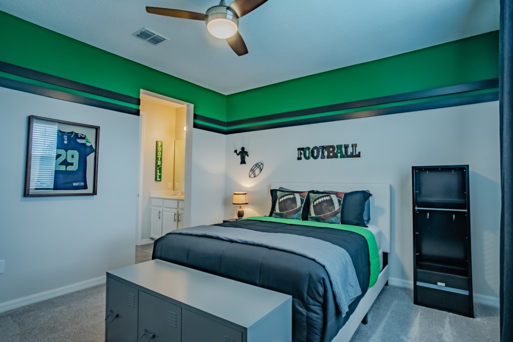 • Bedroom 4: 1 queen bed with TV, shares Jack and Jill bathroom with Bedroom 5, football-themed
