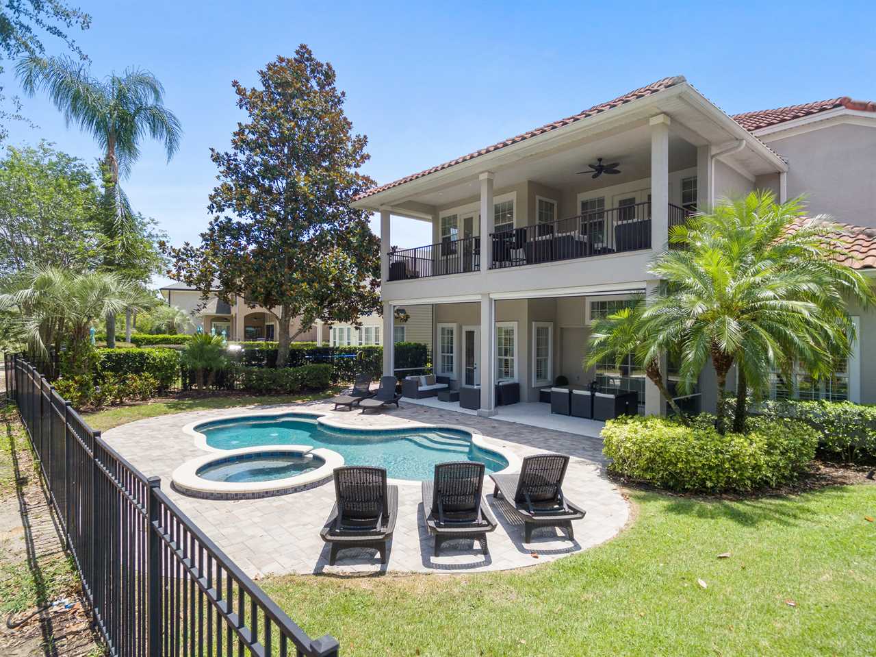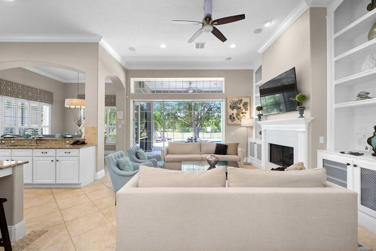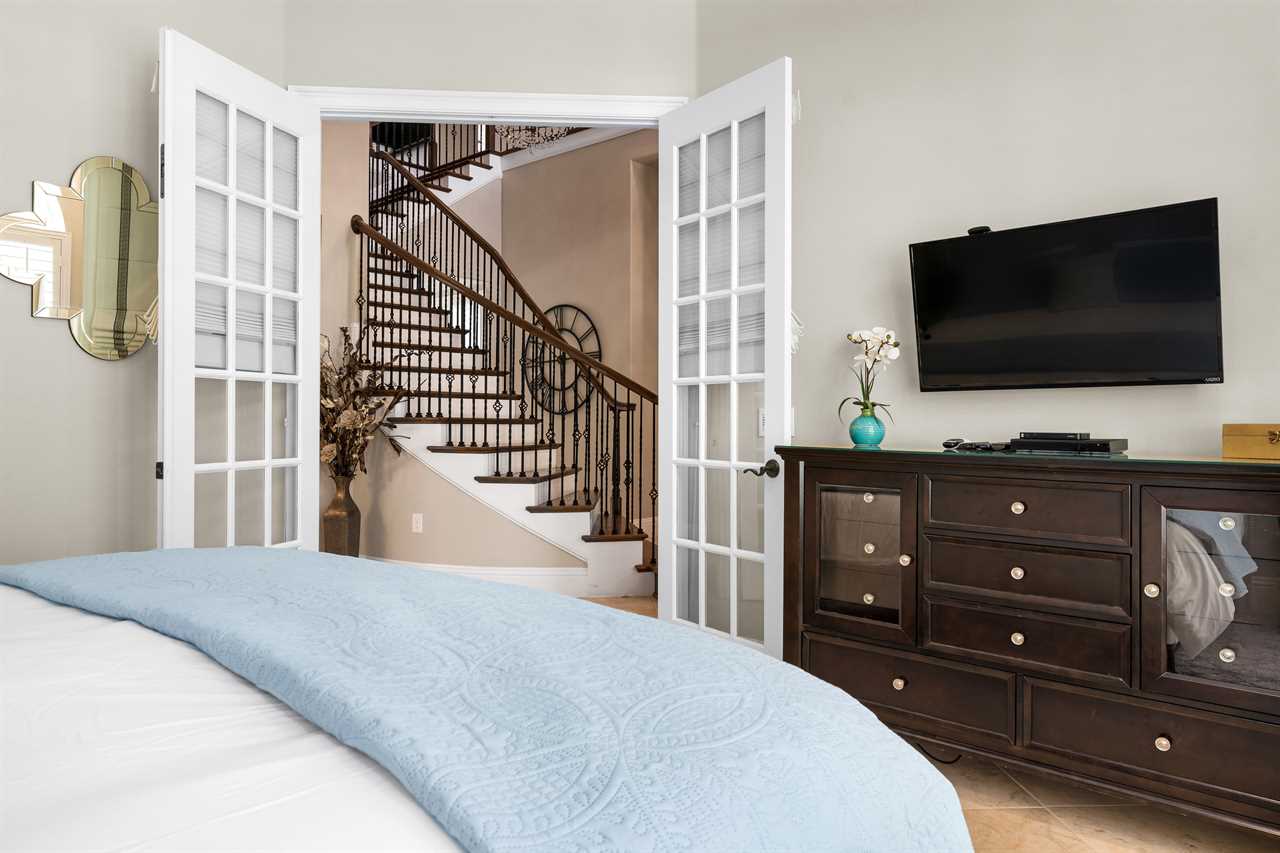 Step through the front door and you are greeted by a grand staircase that leads you up to the second floor. An elegant chandelier illuminates the grand foyer leading you back to an open floor plan allowing for easy entertainment. The living area is furnished with a large 70" Smart TV with Netflix (Guest must use own account), surround sound system, and sectional sofa. Adjoining is the exquisite kitchen equipped with granite countertops and state-of-the-art stainless steel appliances making this a chef's dream. The island is equipped with a bonus wine cooler! Off the kitchen is the dining area which also has a breakfast bar making ample seating for large family dinners. Completing the first floor is two King bedrooms. On the second floor, you will find two rooms with two Twin size beds (both with PlayStation 3 games consoles for the kids) and two more King master suites. Both have large wall-mounted TVs with Blu-Ray players. One of which has its own private balcony with outdoor seating.