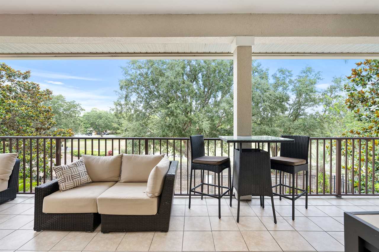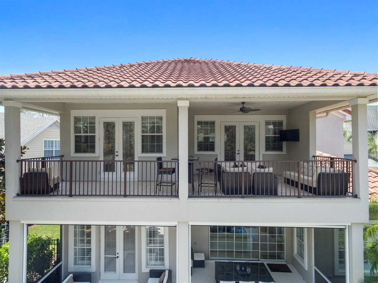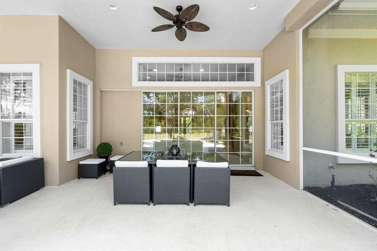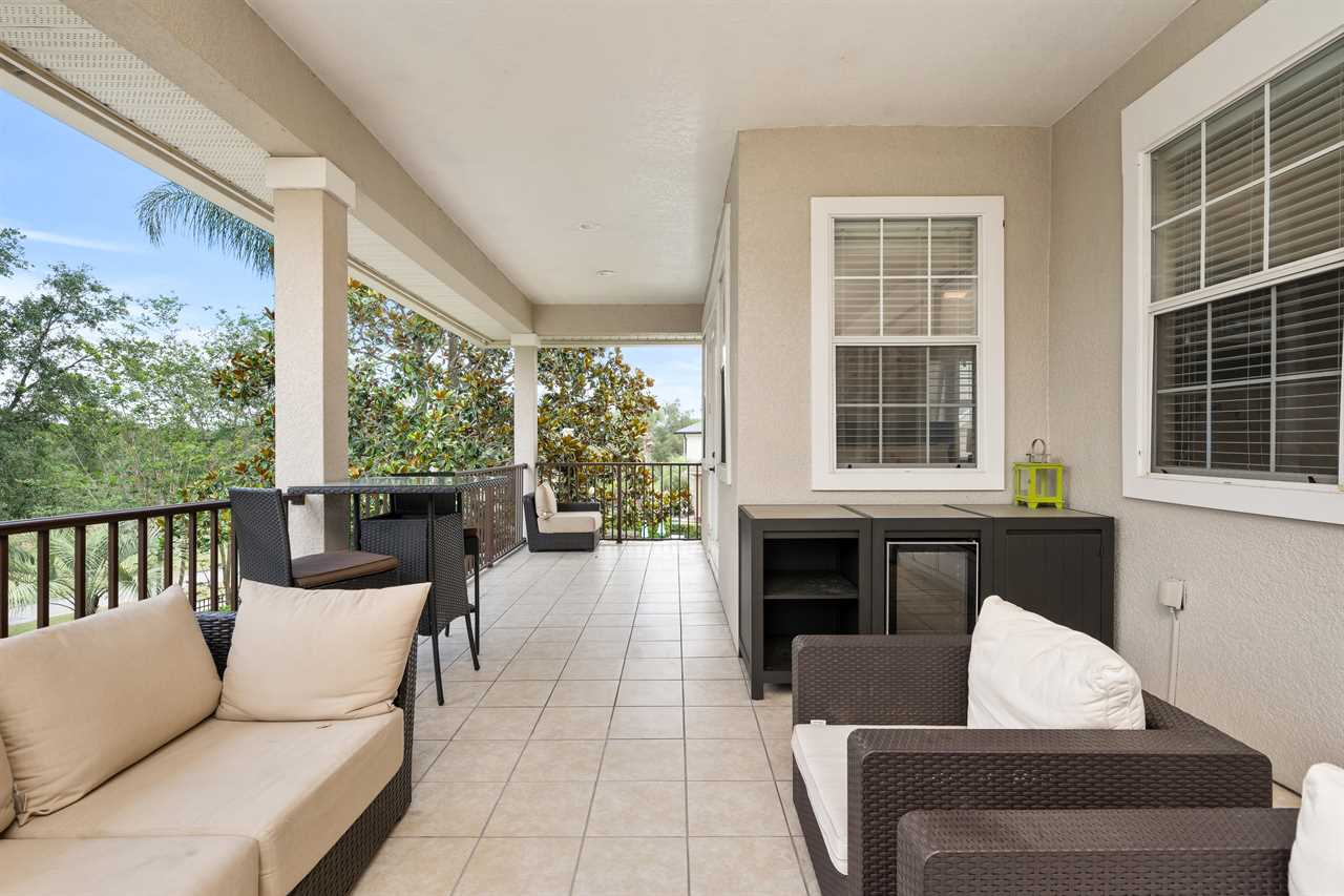The balcony facing the rear of the home overlooking the golf course and preserve boasts plenty of seating, including reclining chairs and a wall-mounted TV.