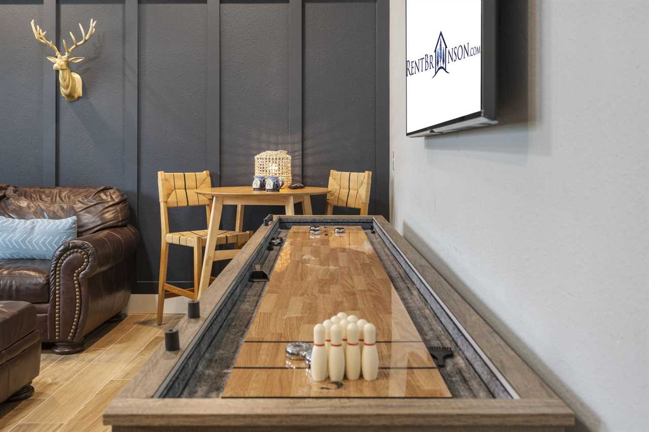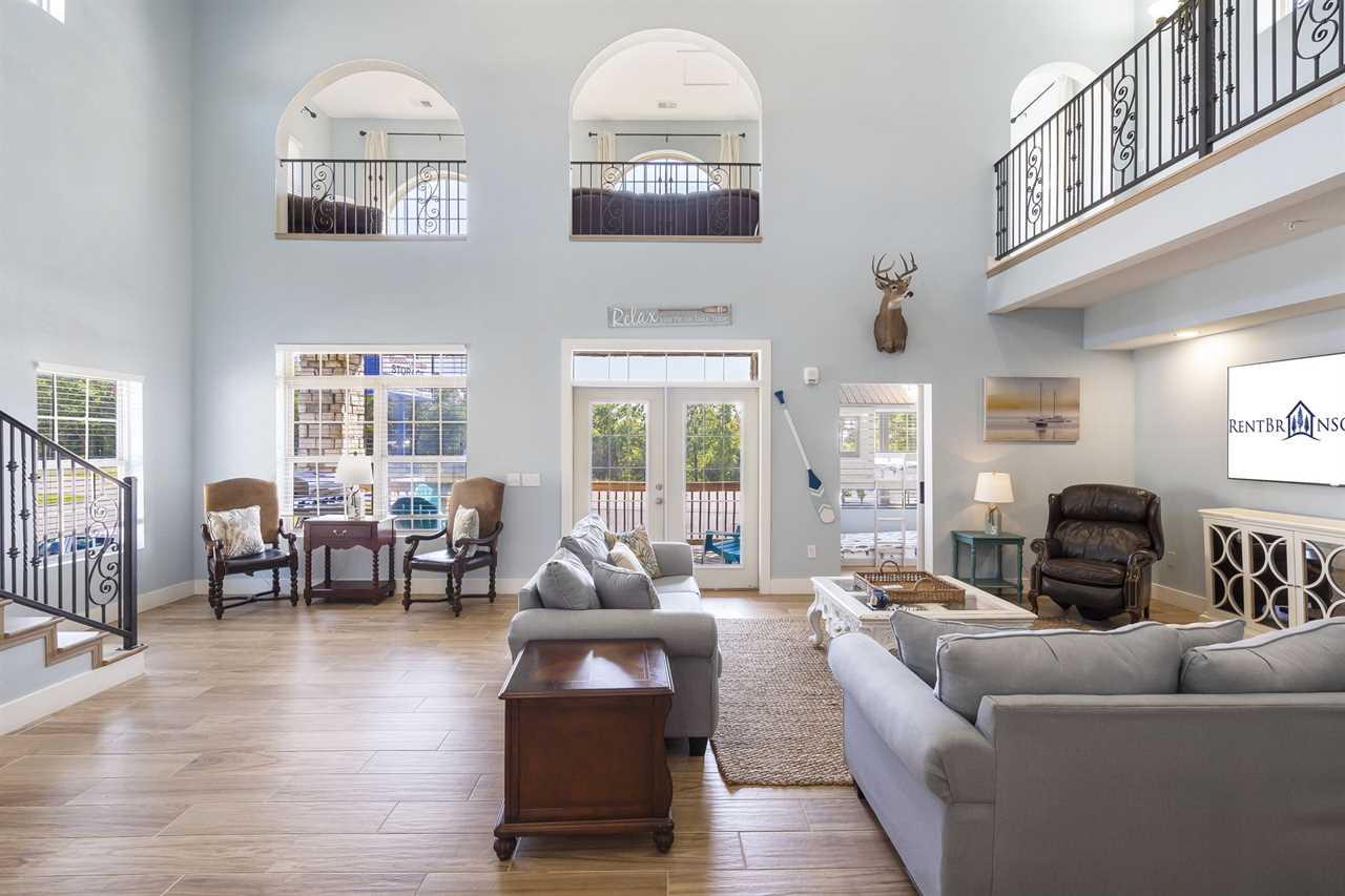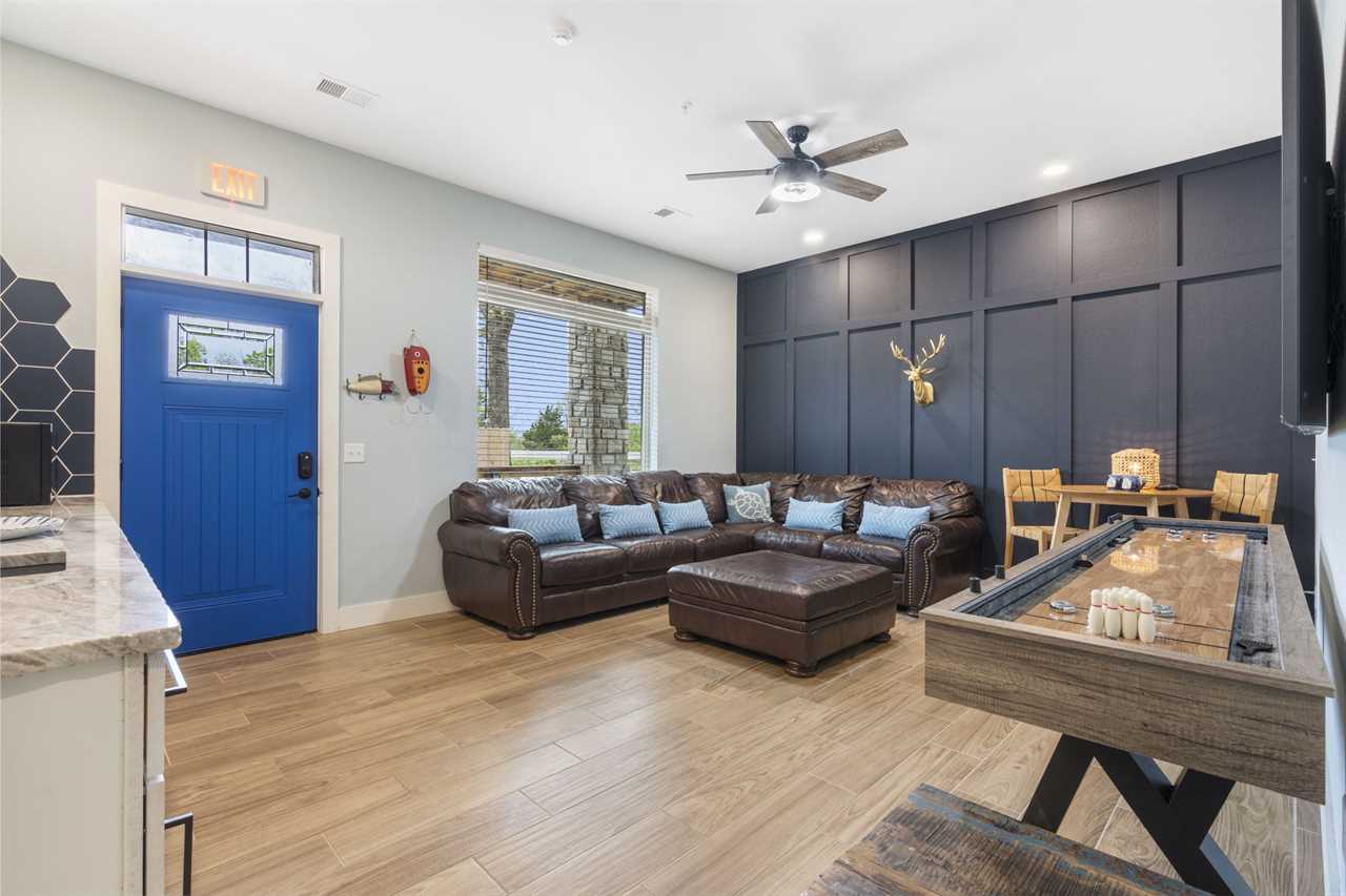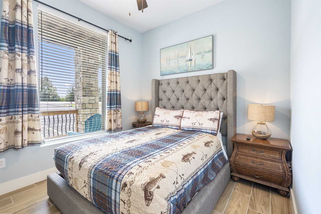 Arriving at State Park Marina Stern, you will have ample parking including space for a boat! Behind a privacy fence is your very own private hot tub! Upon entering the first floor, you are greeted by a kitchenette, ideal for keeping your favorite snacks within arm's reach. The oversized couch is perfect for an unforgettable movie night or enjoy a friendly game of shuffleboard. Retreat to the comfort of the bedrooms for a great night's sleep. This level boasts two queen-sized bedrooms, each with its own ensuite bathroom.