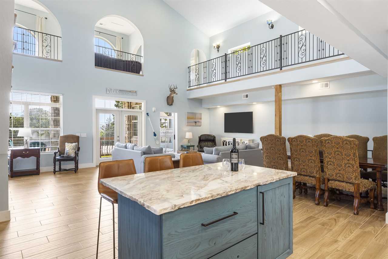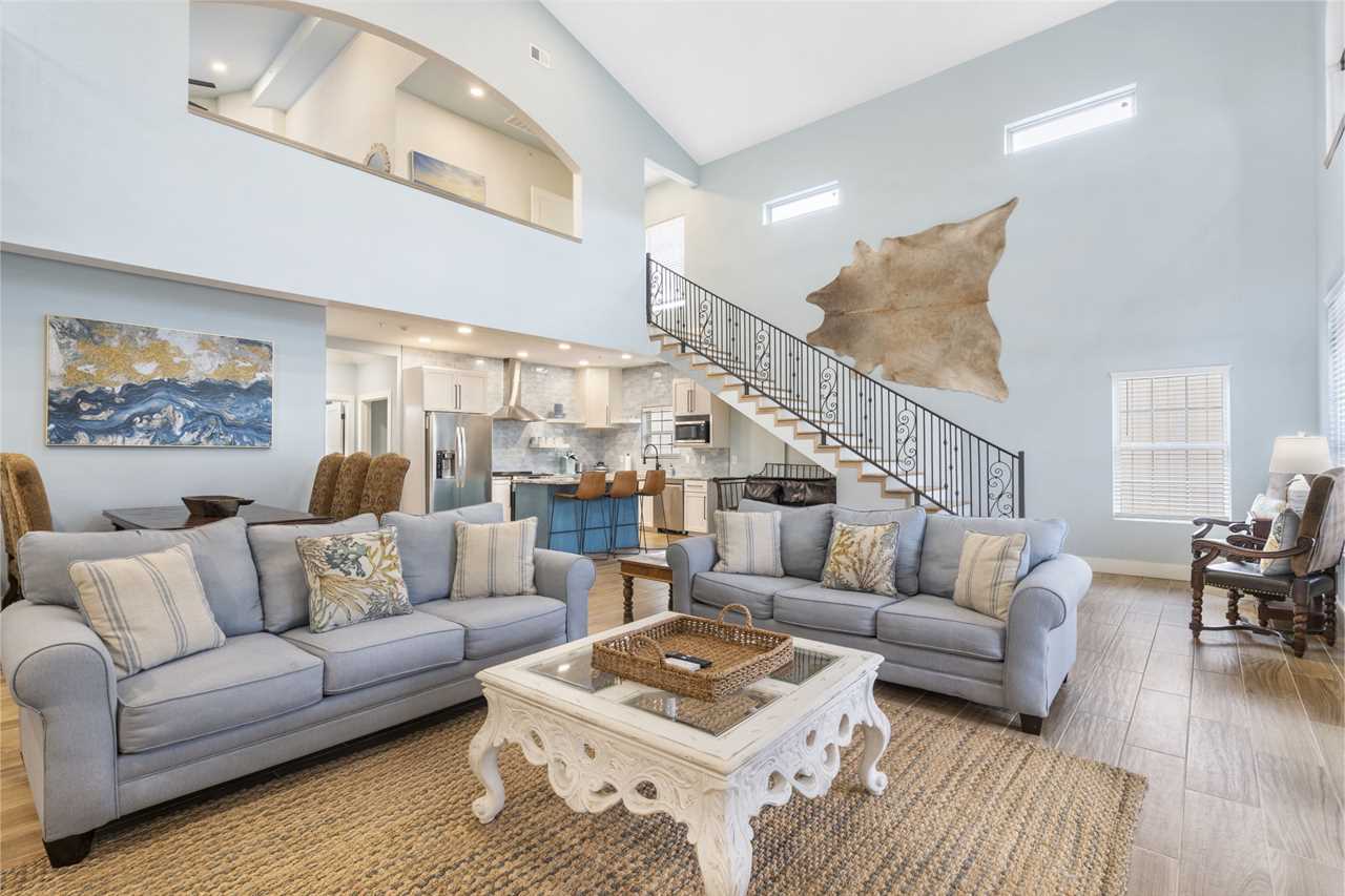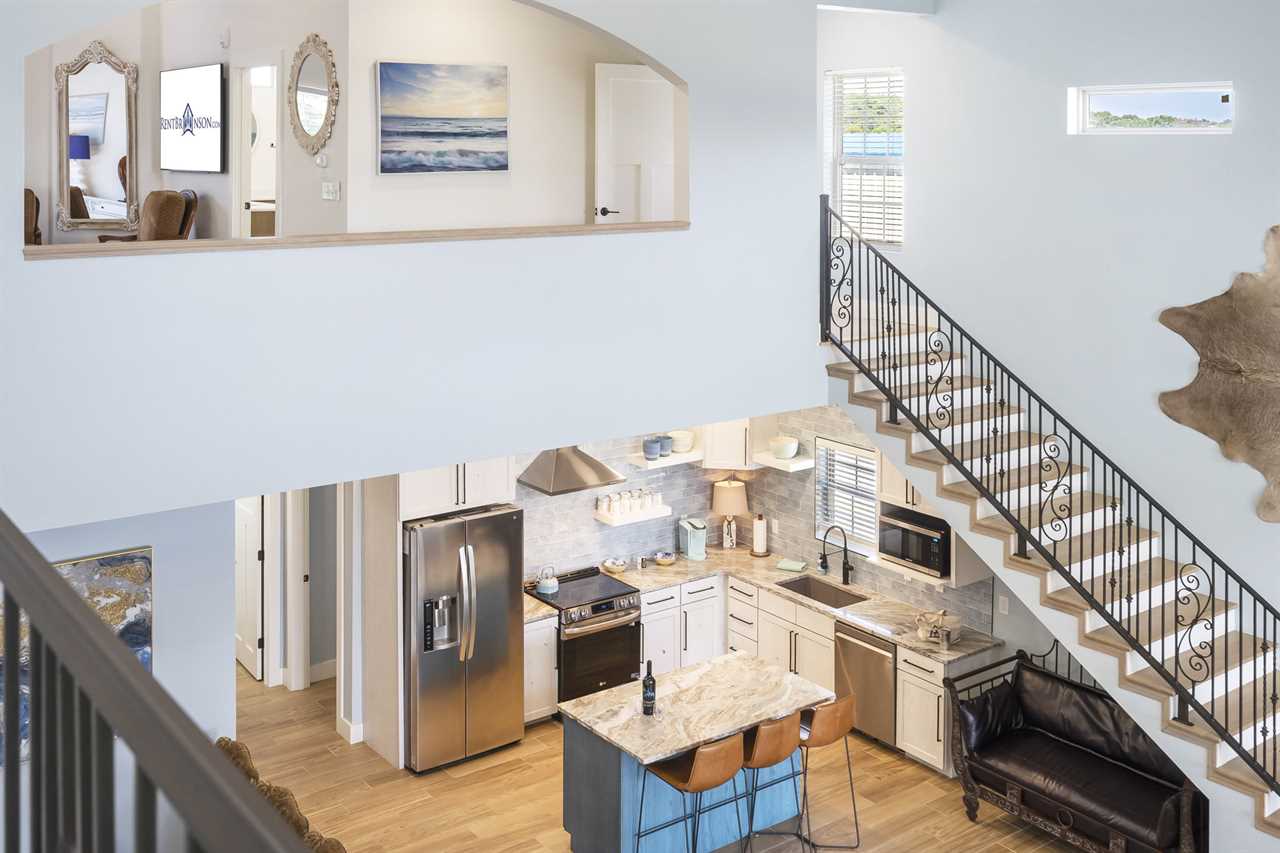 Up the stairs on the 2nd floor is a beautiful open-concept living space. Lounge in the living area for a family movie night or enjoying a good book in the natural light. The dining table is ready for you to enjoy a delicious meal – whether it be a hearty breakfast, quick lunch, or full-course dinner. Enjoy some fresh air on the balcony with your favorite beverage. Cook up a feast in the fully-equipped kitchen that awaits you! On this level you will find 2 king bedrooms, a bunk room with a twin-over-twin bunk, another twin-over-twin bunk, and a bathroom with a tiled shower.