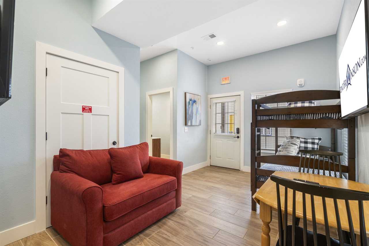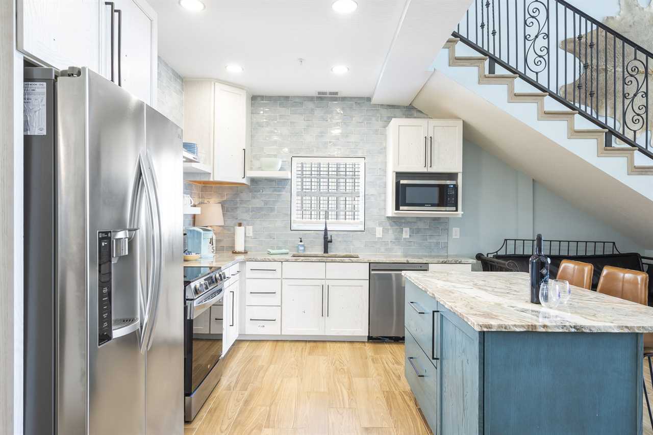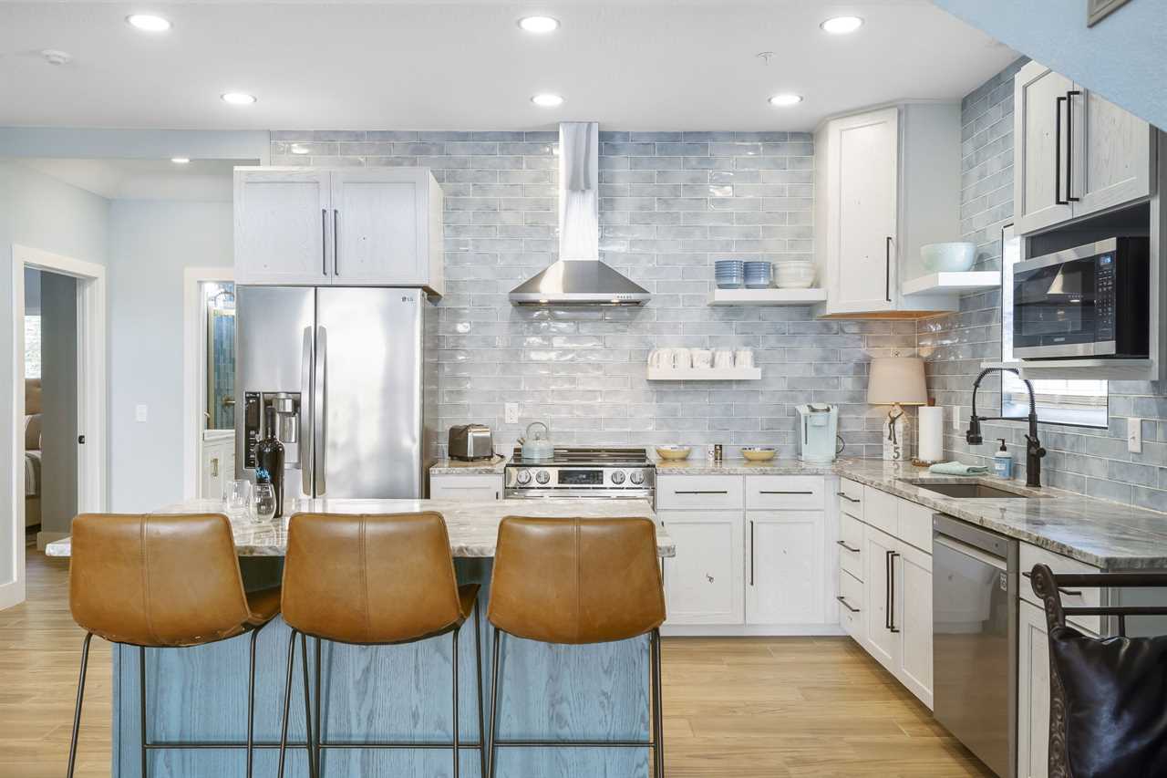 Up the stairs on the 2nd floor is a beautiful open-concept living space. Lounge in the living area for a family movie night or enjoying a good book in the natural light. The dining table is ready for you to enjoy a delicious meal – whether it be a hearty breakfast, quick lunch, or full-course dinner. Enjoy some fresh air on the balcony with your favorite beverage. Cook up a feast in the fully-equipped kitchen that awaits you! On this level you will find 2 king bedrooms, a bunk room with a twin-over-twin bunk, another twin-over-twin bunk, and a bathroom with a tiled shower.