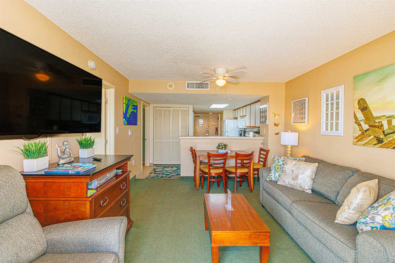 Entering into the living room, guests will find the most relaxing part of the condo! The floor plan is open and spacious, and it features a sofa that converts to a sleeper sofa, commercial blackout curtains, TV, and a dining table with chairs. The sliding glass doors allow our guests to get the most spectacular views that can be seen from the kitchen, living space, or the private balcony.