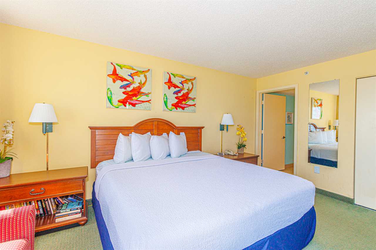 The master bedroom can be found right near the living area. This bedroom features 1 king bed, two night stands on either side of the bed, TV, dresser, accent chair, and access to the oceanfront private balcony from the sliding glass door in the bedroom. This space is perfect for 2 guests. This bedroom also features an ensuite bathroom. The bathroom features a tub/shower combo, vanity, sink, mirror, toilet, and a hair dryer.