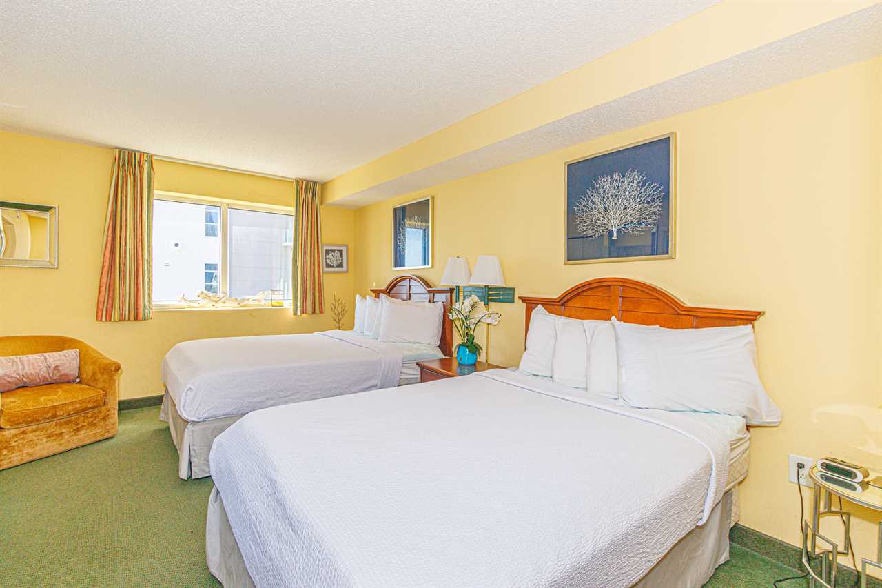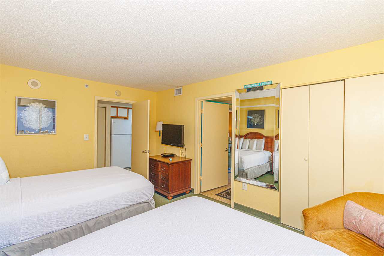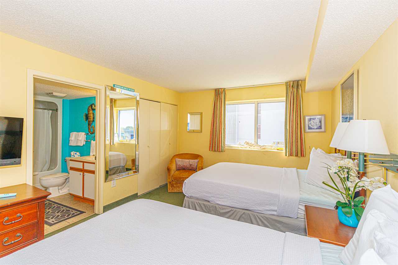 Guests will enter the condo into a hallway. The guest bedroom is located to the left as you walk into the unit. This bedroom features 2 full size beds, a night stand, TV, window for natural light, and access to the ensuite bathroom. The bathroom features a tub/shower combo, vanity, sink, mirror, toilet, and a hair dyer.
