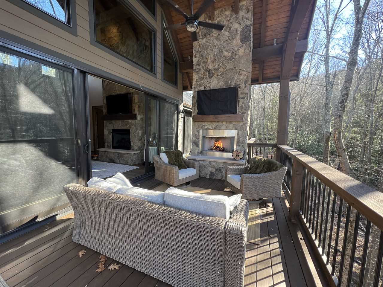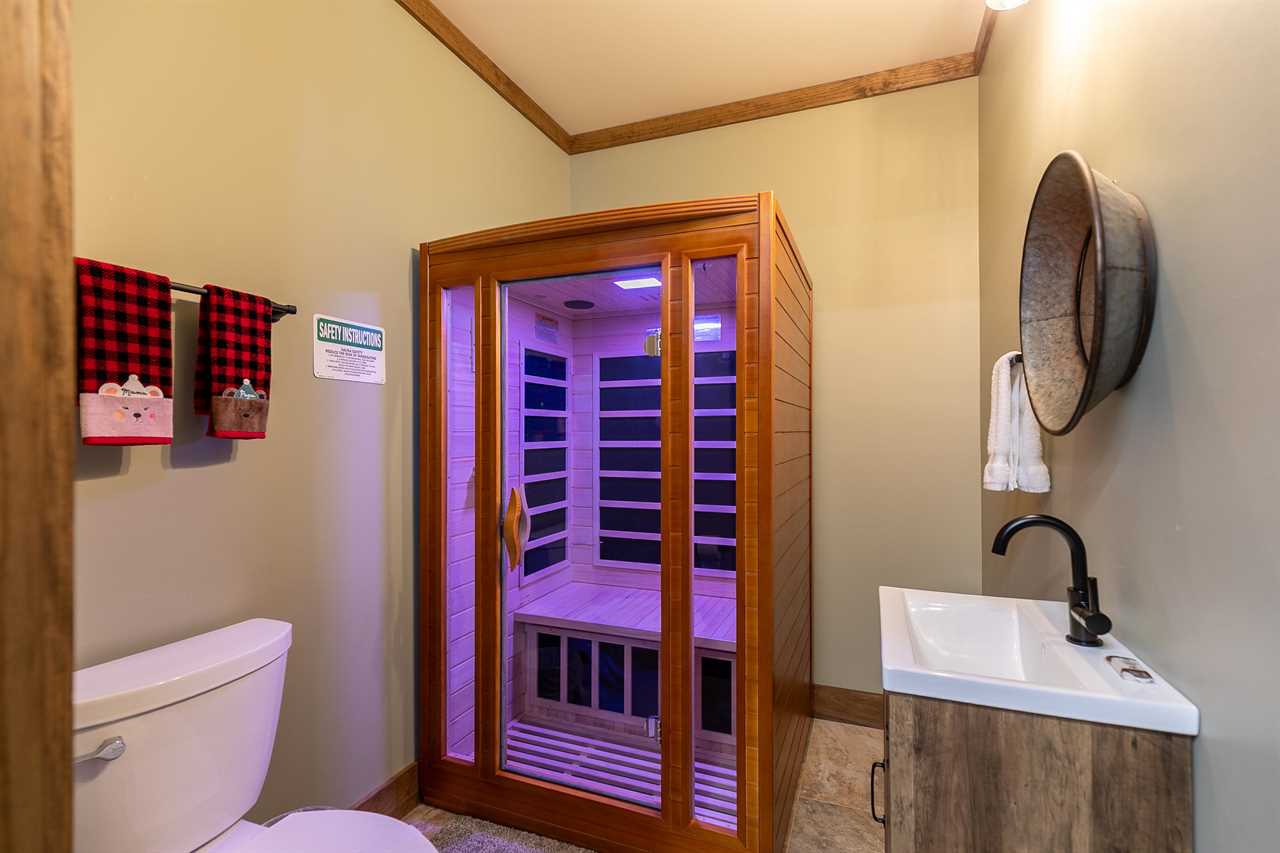 There is an awesome 50' wide outdoor deck that has a separate TV and wood burning fireplace stocked with FREE firewood for our guests. Whether you cuddle by the fire or watch some great football outside you can enjoy overlooking the 3 acres of beautiful trees, our little creek and pond. There is a gas grill to whip up some steaks or burgers. In addition to the main floor there is a separate entrance to a mudroom, ½ bath with SAUNA and full-size washer and dryer. There are electric boot warmers provided making sure those fun days in the chilly weather aren't ruined by cold feet!