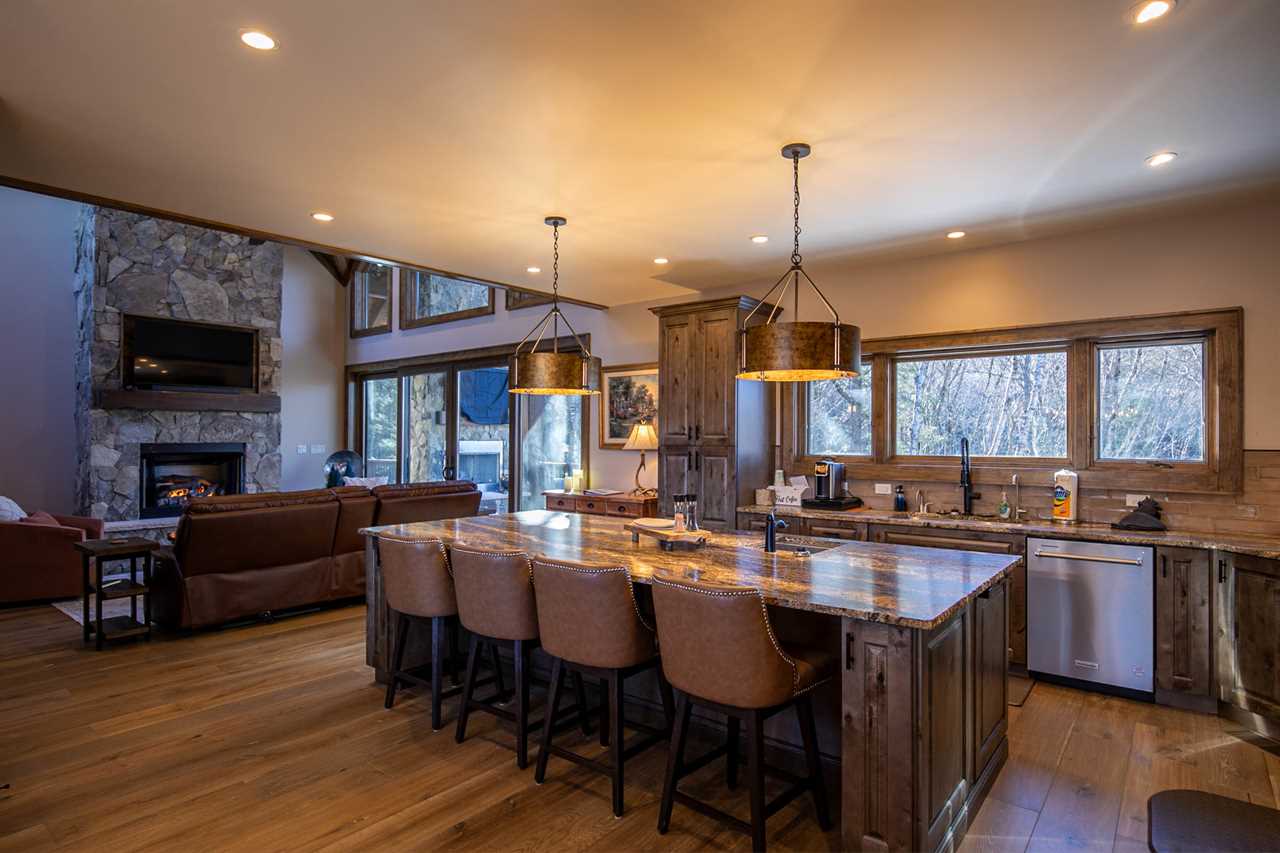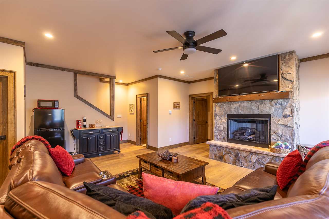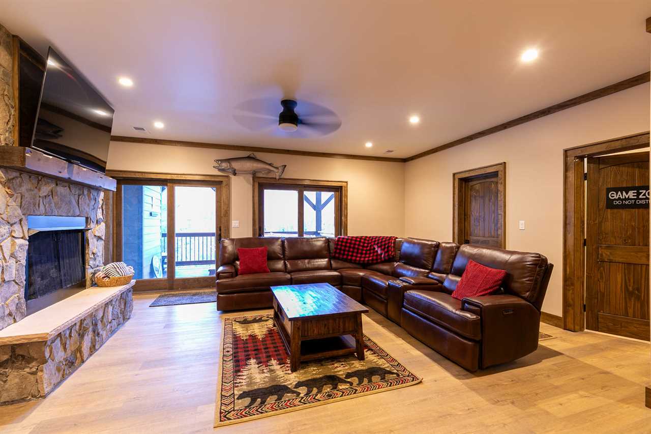 The main level has a spectacular gourmet kitchen completely stocked with everything you'll need including small appliances, plates, silverware, napkins and tablecloths for 12. The rustic dining table can be extended to provide extra seating and the oversized 10-foot granite island will be the center of your family gathering. There is a dramatic floor to ceiling gas fireplace in the living room right off the kitchen to enhance this cozy area. The power recliner sofa is guaranteed to reduce your stress!