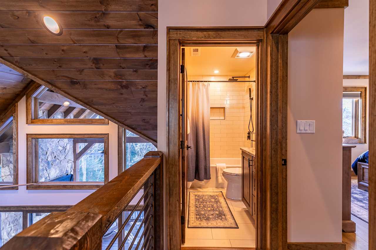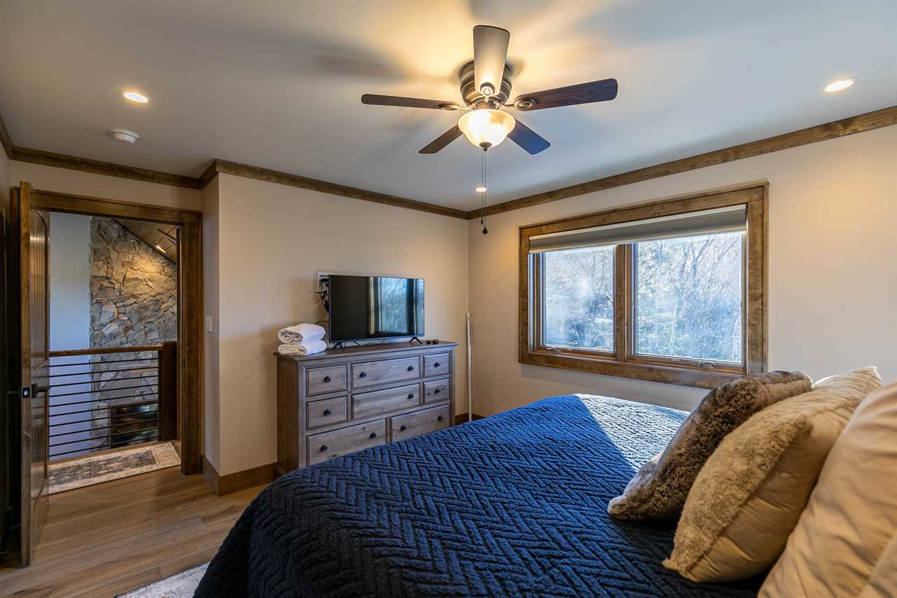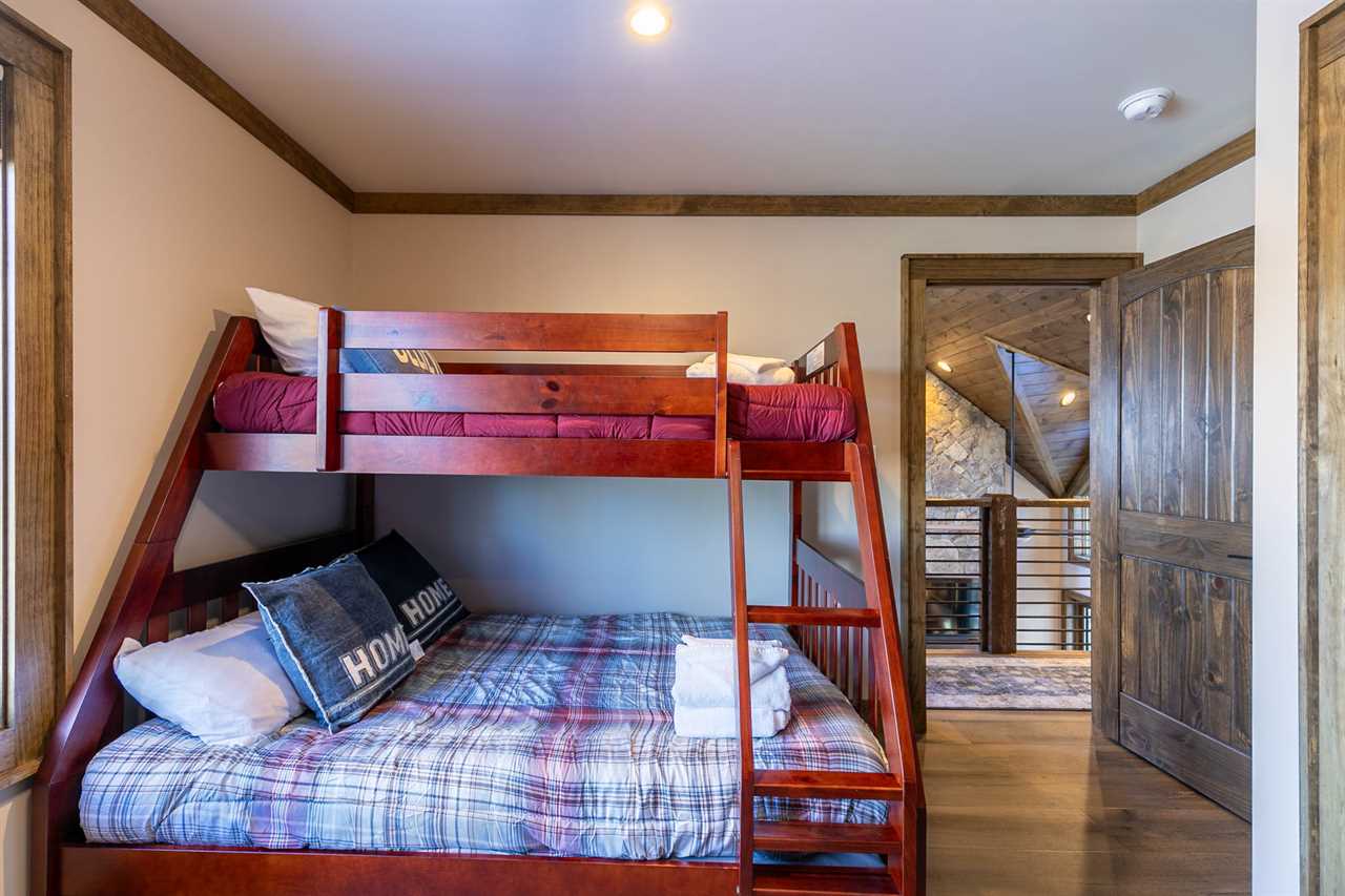 On the main level is bedroom #1, a King suite with a private bathroom including heated floors and private balcony. Bedroom #2 is a King Suite with a private bathroom on the lower level. #3 King size room is located on the upper level along with #4 the bunk room. There is a full bathroom on the upper level as well.