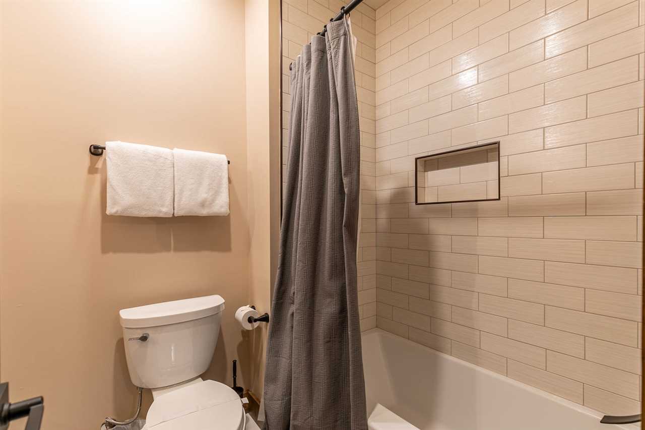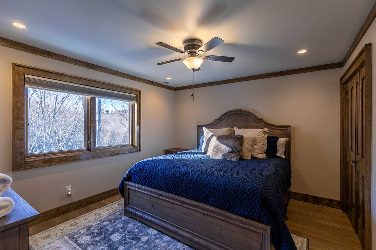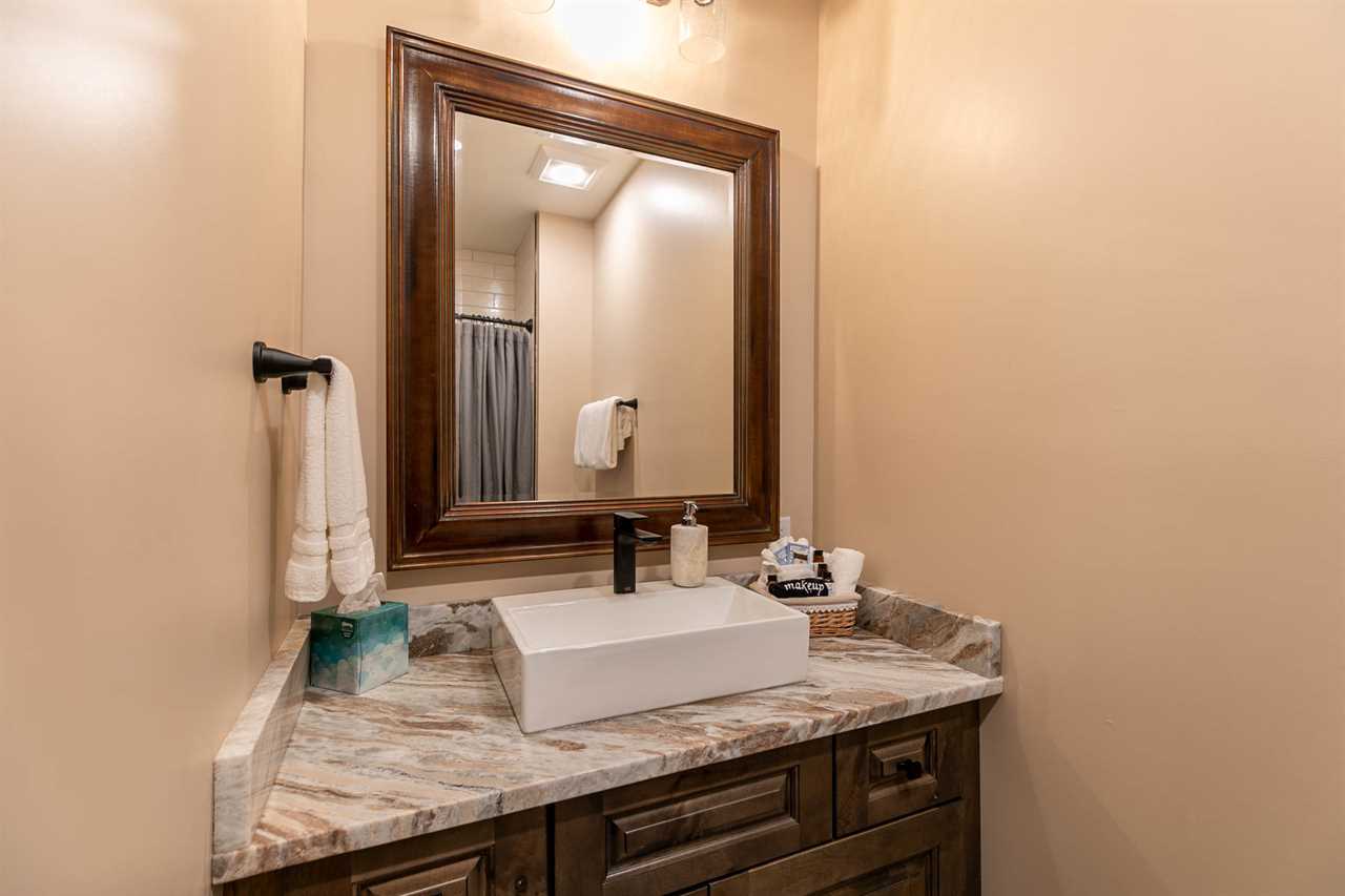 On the main level is bedroom #1, a King suite with a private bathroom including heated floors and private balcony. Bedroom #2 is a King Suite with a private bathroom on the lower level. #3 King size room is located on the upper level along with #4 the bunk room. There is a full bathroom on the upper level as well.