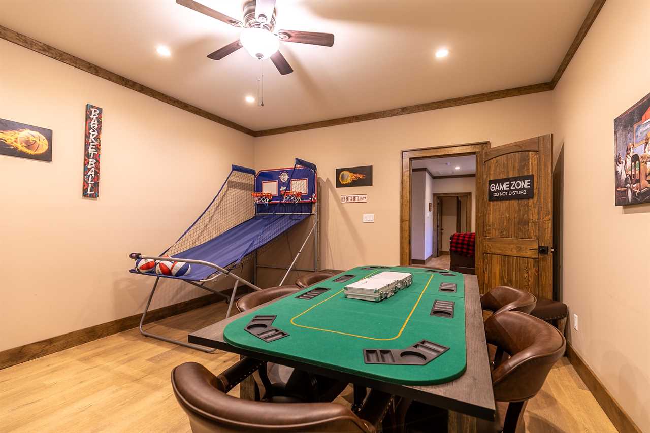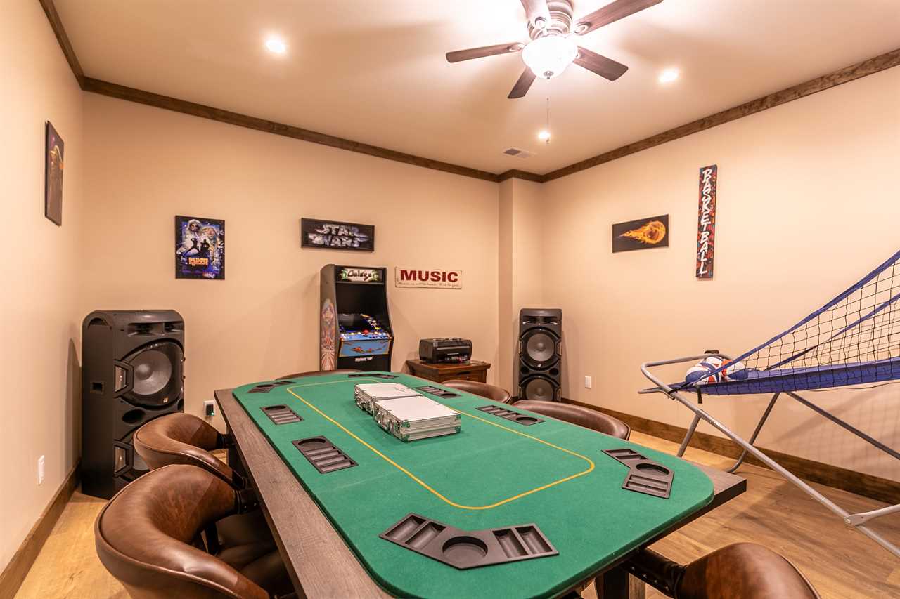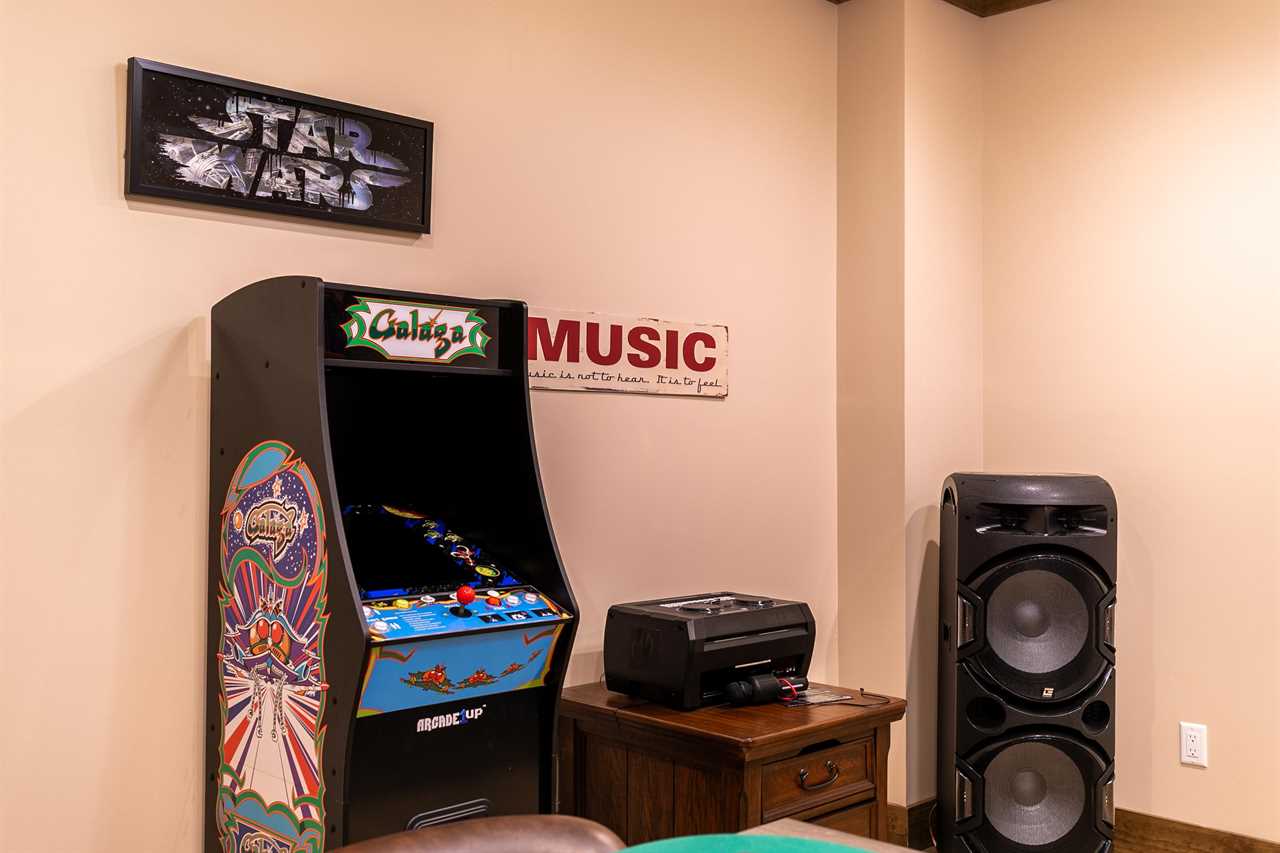 Lower level-Your family and friends will love the “Man Cave” with a huge power leather sectional sofa, a large 65”TV, fireplace and a 6-person poker/game table. There is a separate Arcade room featuring a double basketball game, a Pac-Man Multigame that has 17 different playing options. To add to the fun there is a Bluetooth “sound system” that has flashing disco lights and professional DJ speakers that is certain to keep the kids entertained for hours! Also located on the lower level adjacent to the Man Cave is an additional ½ bath. The 8-person luxury Hot tub is located on the lower floor balcony with blue tooth capability to play your favorite tunes.