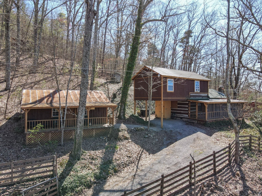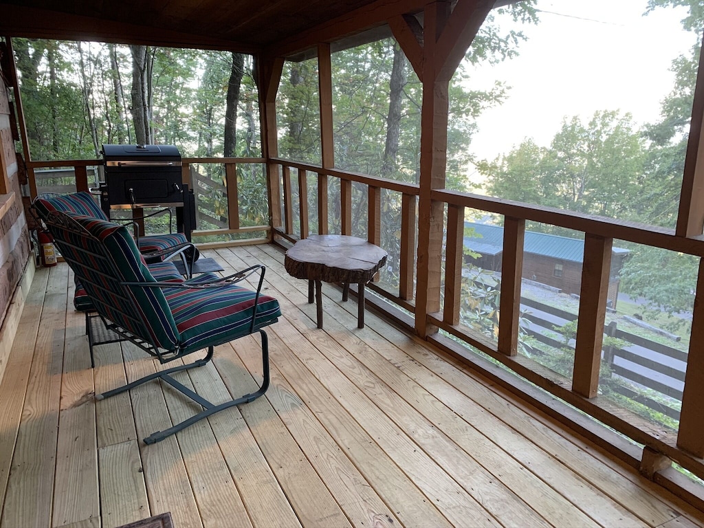 - Location: True log cabin at the top of Bluff Mountain with screened front porch and breathtaking views.