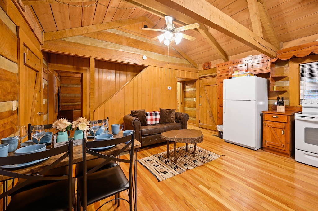 - Kitchen & sitting area with vaulted beam ceiling and fans