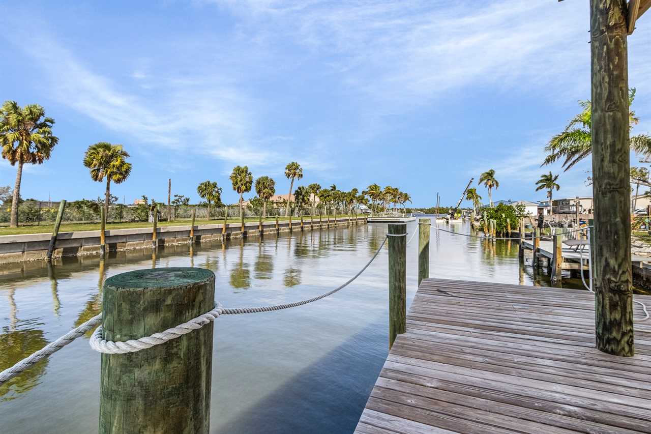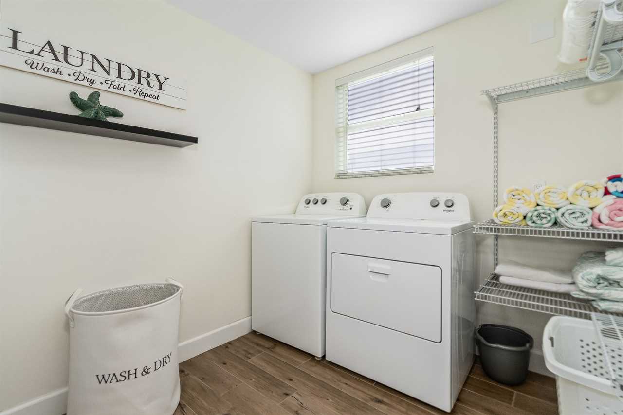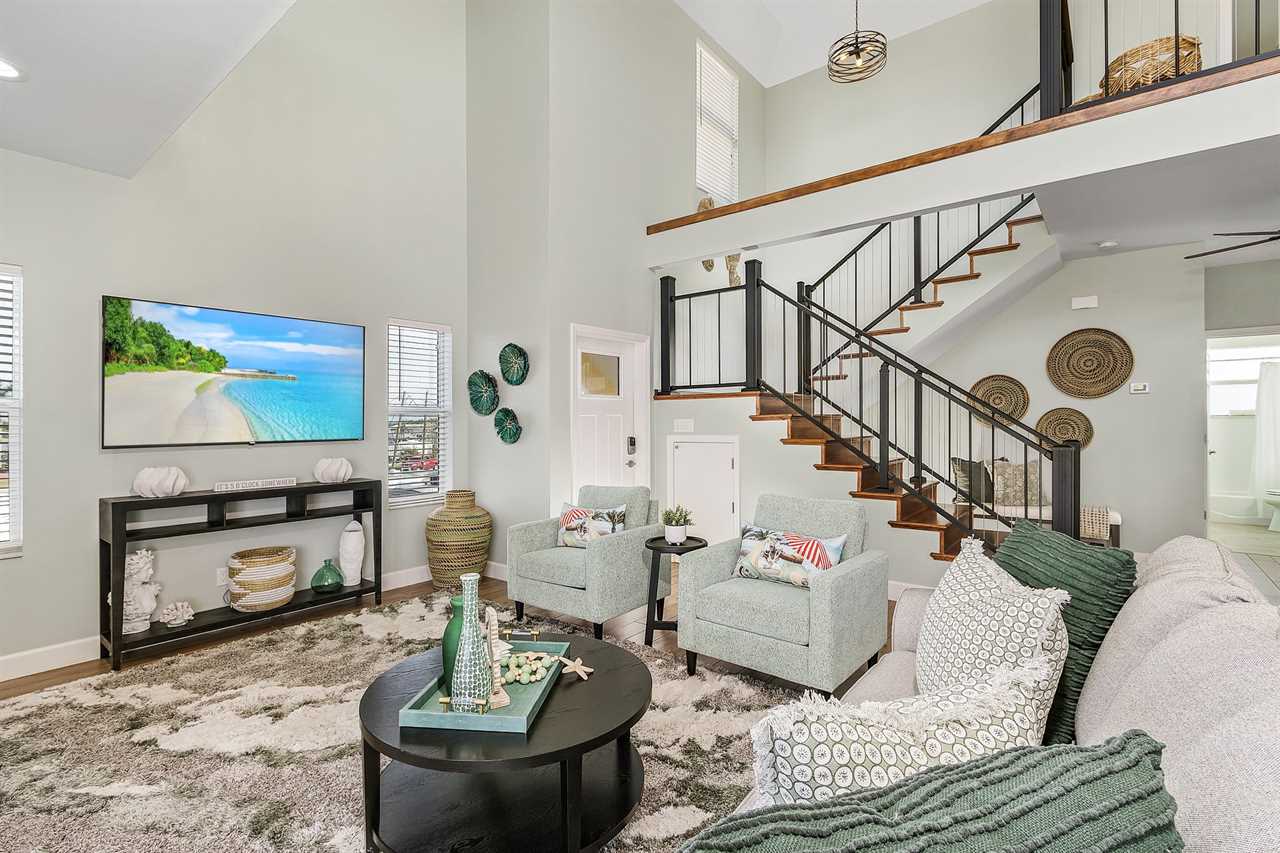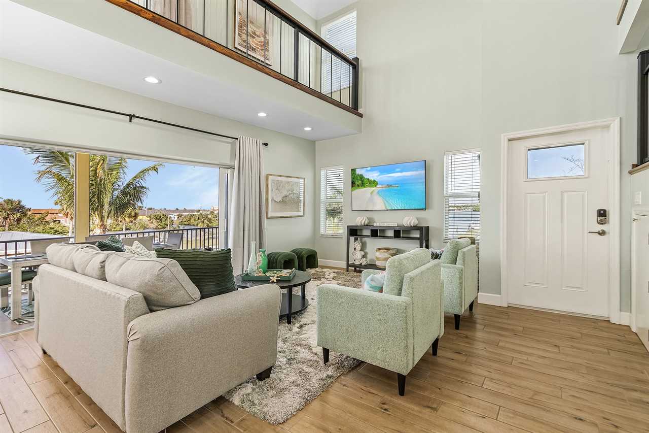 On arrival there is ample off-street parking and garages. Enter via stairs up to the second level then through the front door into the open plan dining, living and kitchen areas. There is beautiful wood tile flooring throughout and décor is beachy/nautical. The large eat-in kitchen is a chef's delight, equipped with all the necessary items to whip up full course meals or just toast and coffee in the morning. Just bring the food! It has a stainless-steel sink with disposal. There are plenty of cabinets and quartz countertop space. Appliances are all stainless-steel and include a side-by-side refrigerator/freezer with ice and water dispenser in the freezer door, dishwasher, glasstop range with self-cleaning and convection oven, built-in above-range microwave and a Keurig coffee maker. The kitchen has a large dining island which seats nine. This flows into the adjacent living area furnished with a queen-size sleeper sofa, two upholstered side chairs with cocktail table and coffee table on an area rug. There is also a credenza with a large wall-mounted flat screen TV. Sliding glass doors from the living area provide access to a screened in furnished balcony overlooking the canal and boat dock. Furnishings include a table with two high-boy chairs, two cushioned sofas and a coffee table. There are also stairs leading down to the pavered patio area below. Take a dip in our inviting heated pool and unwind in the relaxing spa combo, perfect for any time of year. The living area and kitchen ceilings go up to the second floor, and there is a mezzanine around the entire area. Adjacent to the kitchen is a laundry room and an extra refrigerator/freezer.