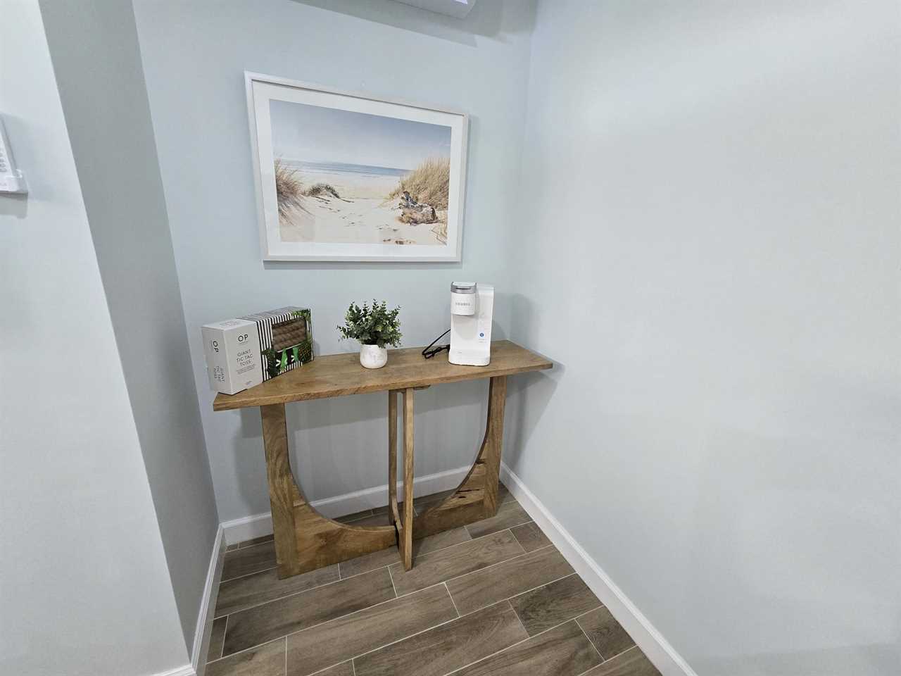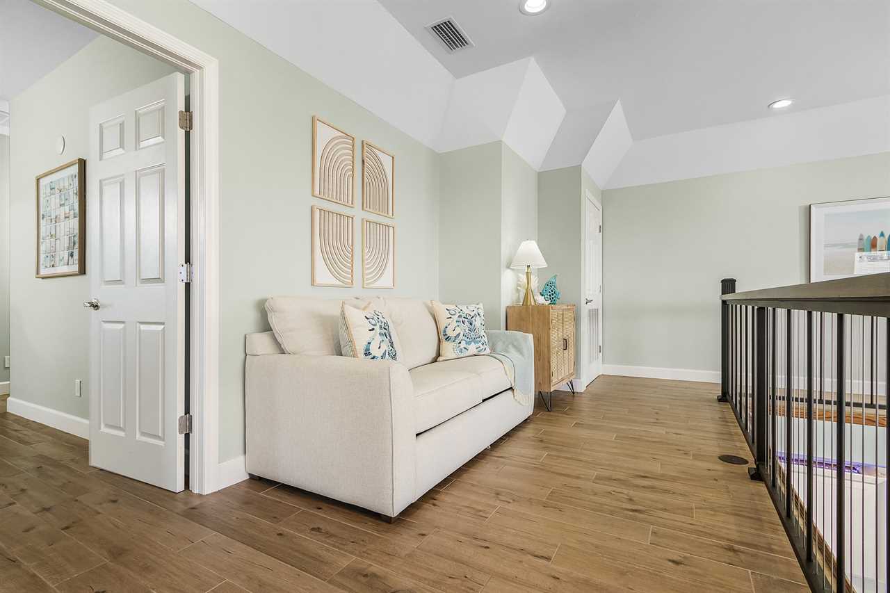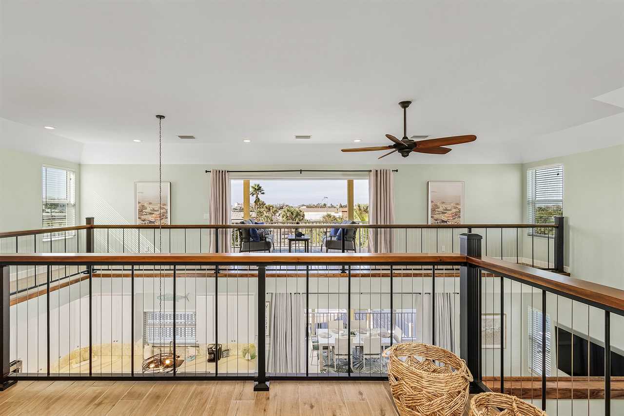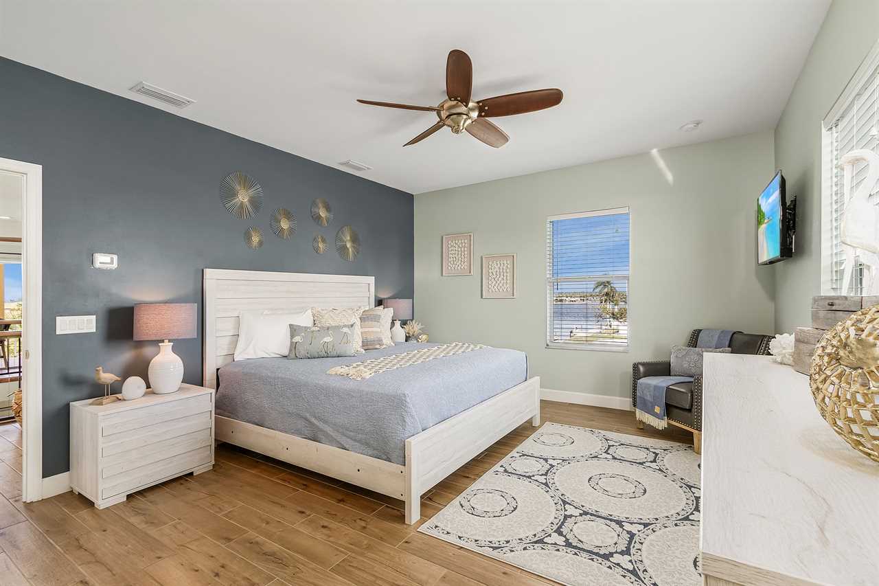 On arrival there is ample off-street parking and garages. Enter via stairs up to the second level then through the front door into the open plan dining, living and kitchen areas. There is beautiful wood tile flooring throughout and décor is beachy/nautical. The large eat-in kitchen is a chef's delight, equipped with all the necessary items to whip up full course meals or just toast and coffee in the morning. Just bring the food! It has a stainless-steel sink with disposal. There are plenty of cabinets and quartz countertop space. Appliances are all stainless-steel and include a side-by-side refrigerator/freezer with ice and water dispenser in the freezer door, dishwasher, glasstop range with self-cleaning and convection oven, built-in above-range microwave and a Keurig coffee maker. The kitchen has a large dining island which seats nine. This flows into the adjacent living area furnished with a queen-size sleeper sofa, two upholstered side chairs with cocktail table and coffee table on an area rug. There is also a credenza with a large wall-mounted flat screen TV. Sliding glass doors from the living area provide access to a screened in furnished balcony overlooking the canal and boat dock. Furnishings include a table with two high-boy chairs, two cushioned sofas and a coffee table. There are also stairs leading down to the pavered patio area below. Take a dip in our inviting heated pool and unwind in the relaxing spa combo, perfect for any time of year. The living area and kitchen ceilings go up to the second floor, and there is a mezzanine around the entire area. Adjacent to the kitchen is a laundry room and an extra refrigerator/freezer.