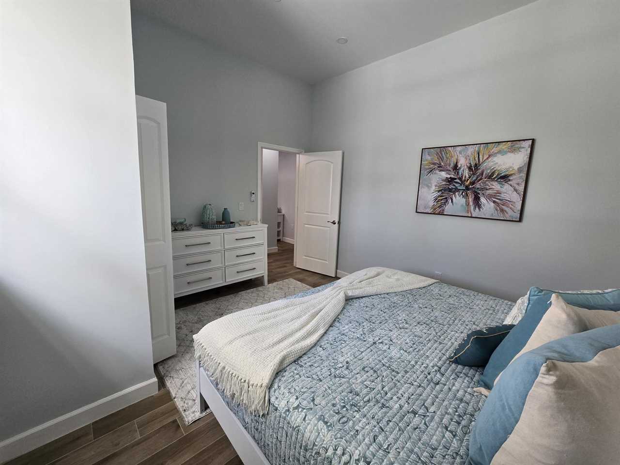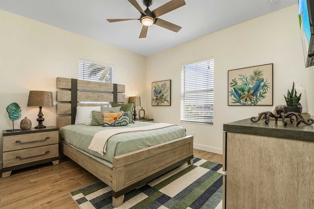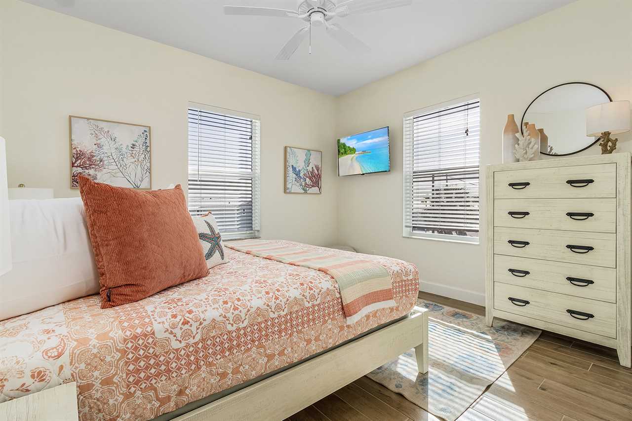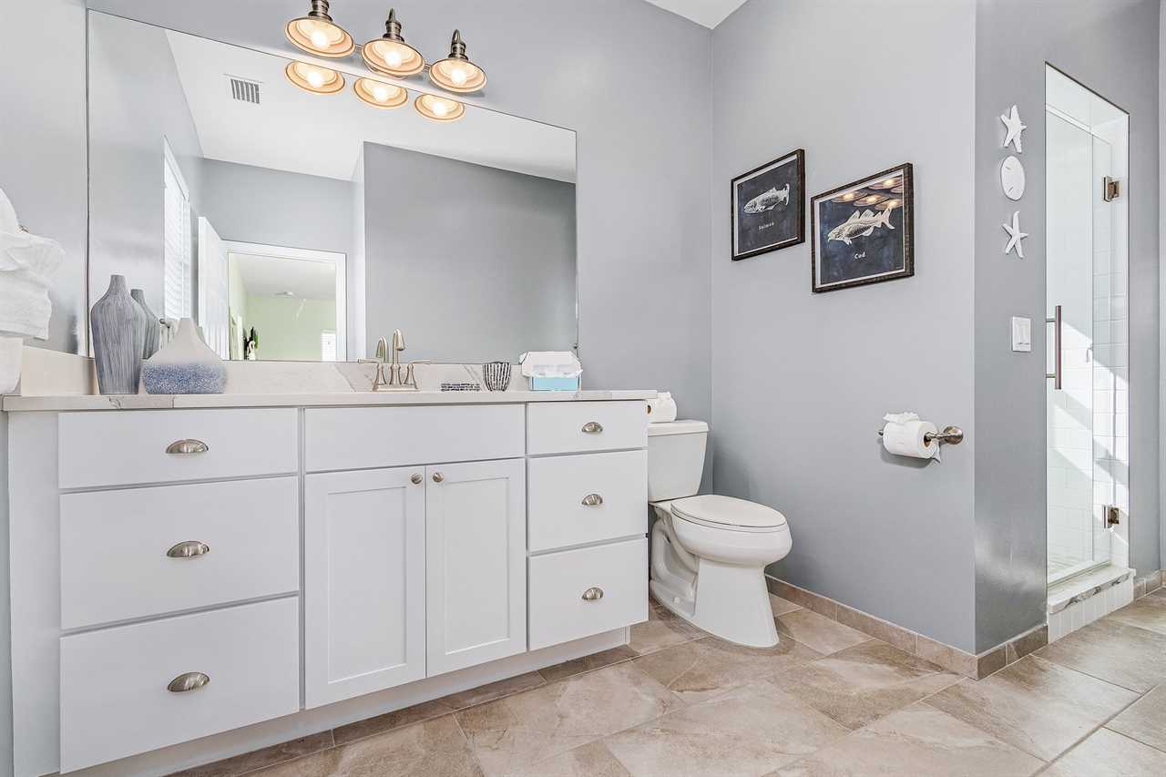 The master bedroom is upstairs and has a king-size bed, night stands and lamps, a tall dresser with mirror and wall-mounted flat screen TV. There is a huge walk-in closet. The en suite bathroom has a quartz vanity with lavatory and storage space beneath, wall mirror, commode and a nicely tiled walk-in shower with glass door. Downstairs the first guest bedroom has a queen-size bed, night stands, ample closet space and double dresser with wall mirror. The second guest bedroom has a queen-size bed, night stands, ample closet space, a 5-drawer chest and a wall-mounted flat screen TV. The guest bathroom has a quartz-top vanity with lavatory and storage space beneath, commode, and a nicely tiled combination tub/shower.
