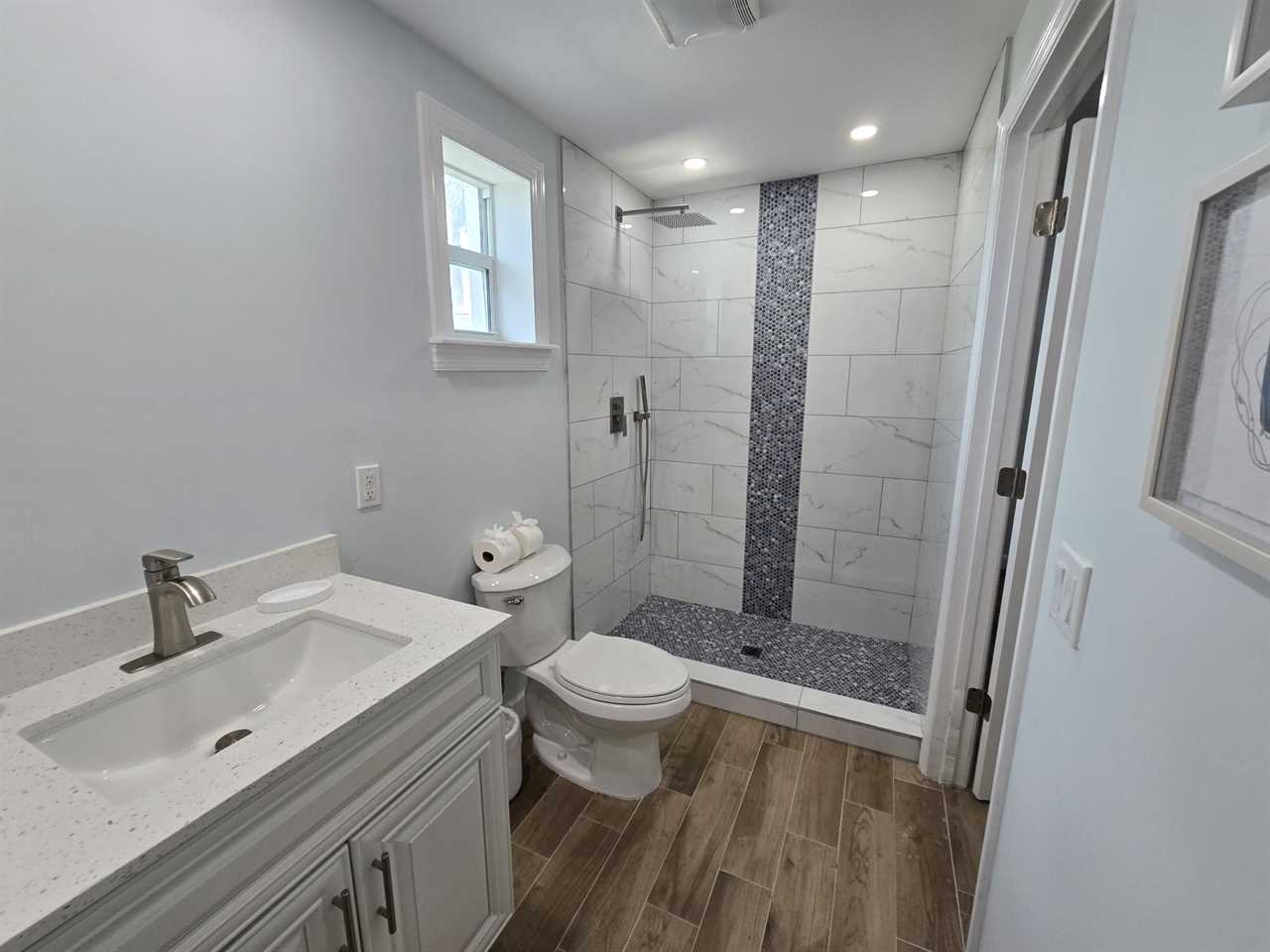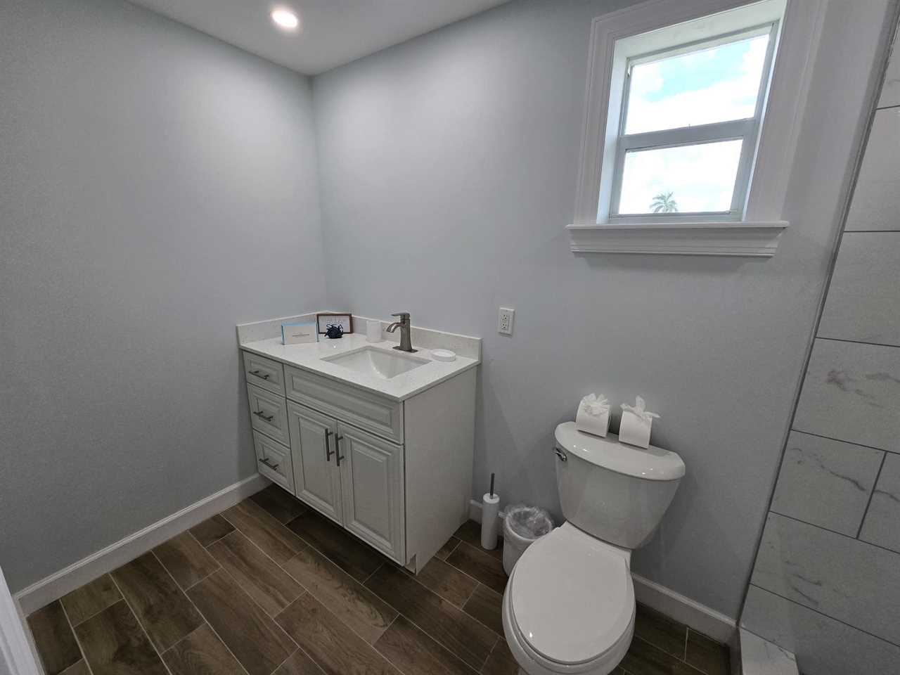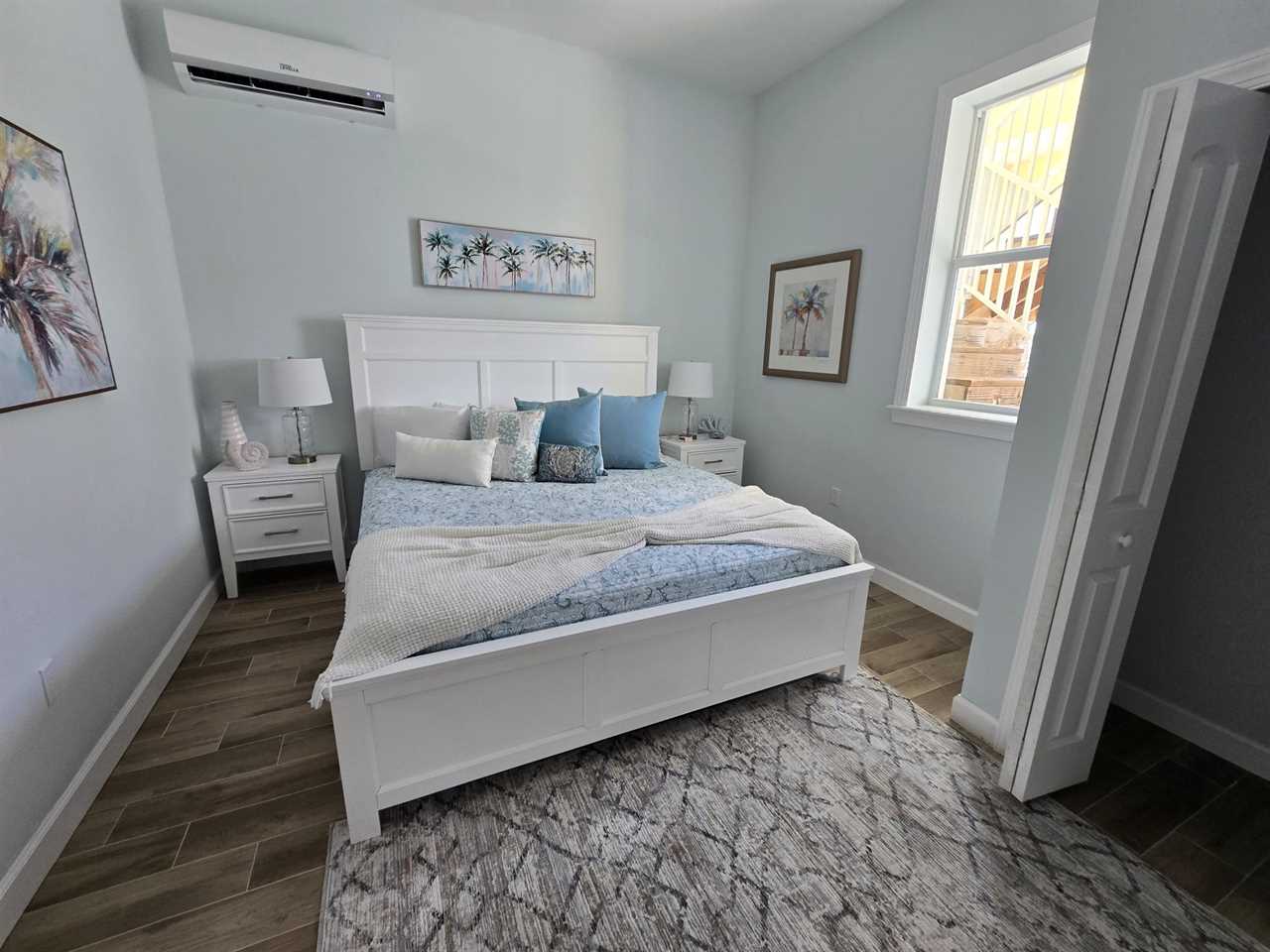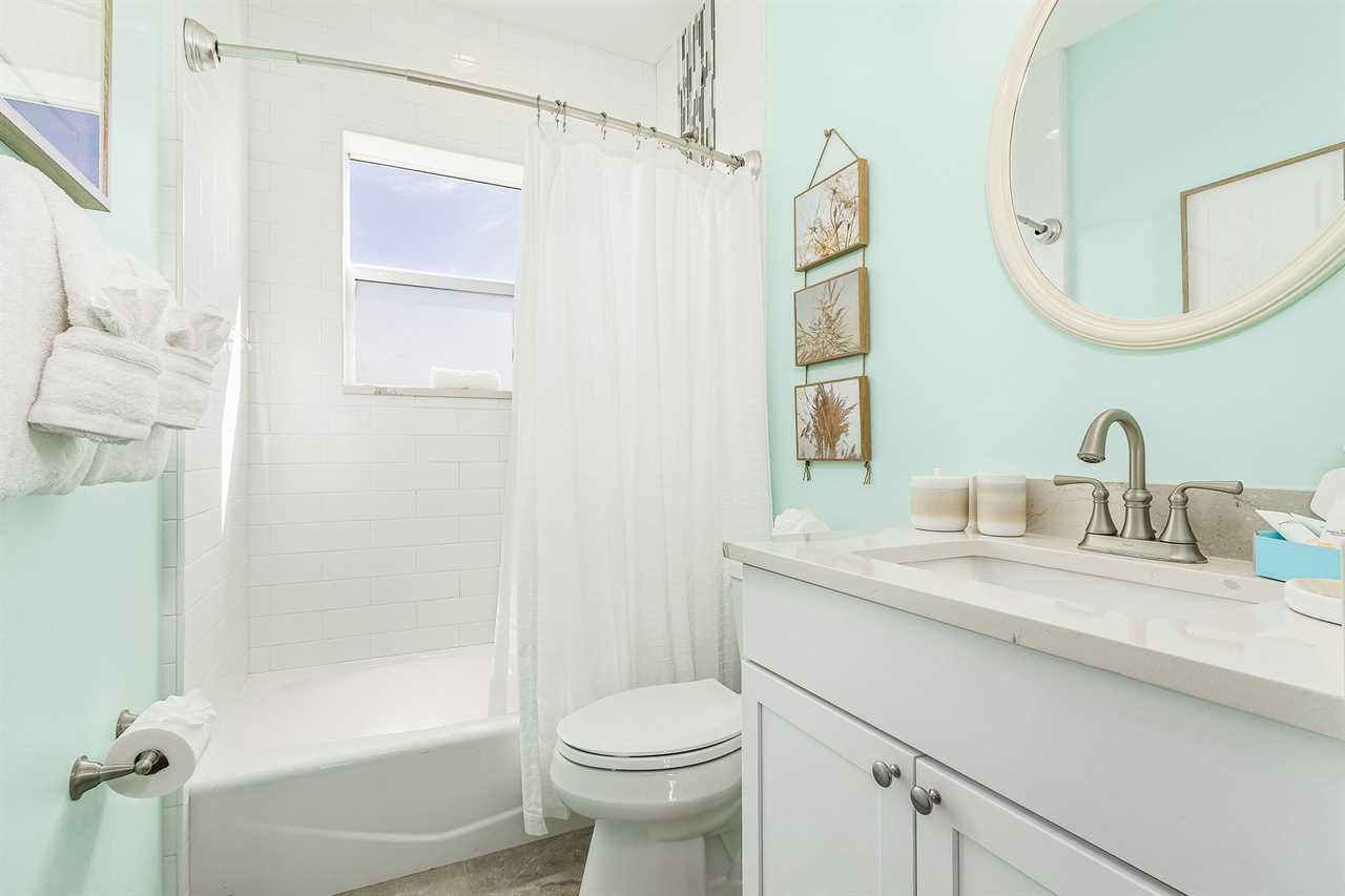 The master bedroom is upstairs and has a king-size bed, night stands and lamps, a tall dresser with mirror and wall-mounted flat screen TV. There is a huge walk-in closet. The en suite bathroom has a quartz vanity with lavatory and storage space beneath, wall mirror, commode and a nicely tiled walk-in shower with glass door. Downstairs the first guest bedroom has a queen-size bed, night stands, ample closet space and double dresser with wall mirror. The second guest bedroom has a queen-size bed, night stands, ample closet space, a 5-drawer chest and a wall-mounted flat screen TV. The guest bathroom has a quartz-top vanity with lavatory and storage space beneath, commode, and a nicely tiled combination tub/shower.