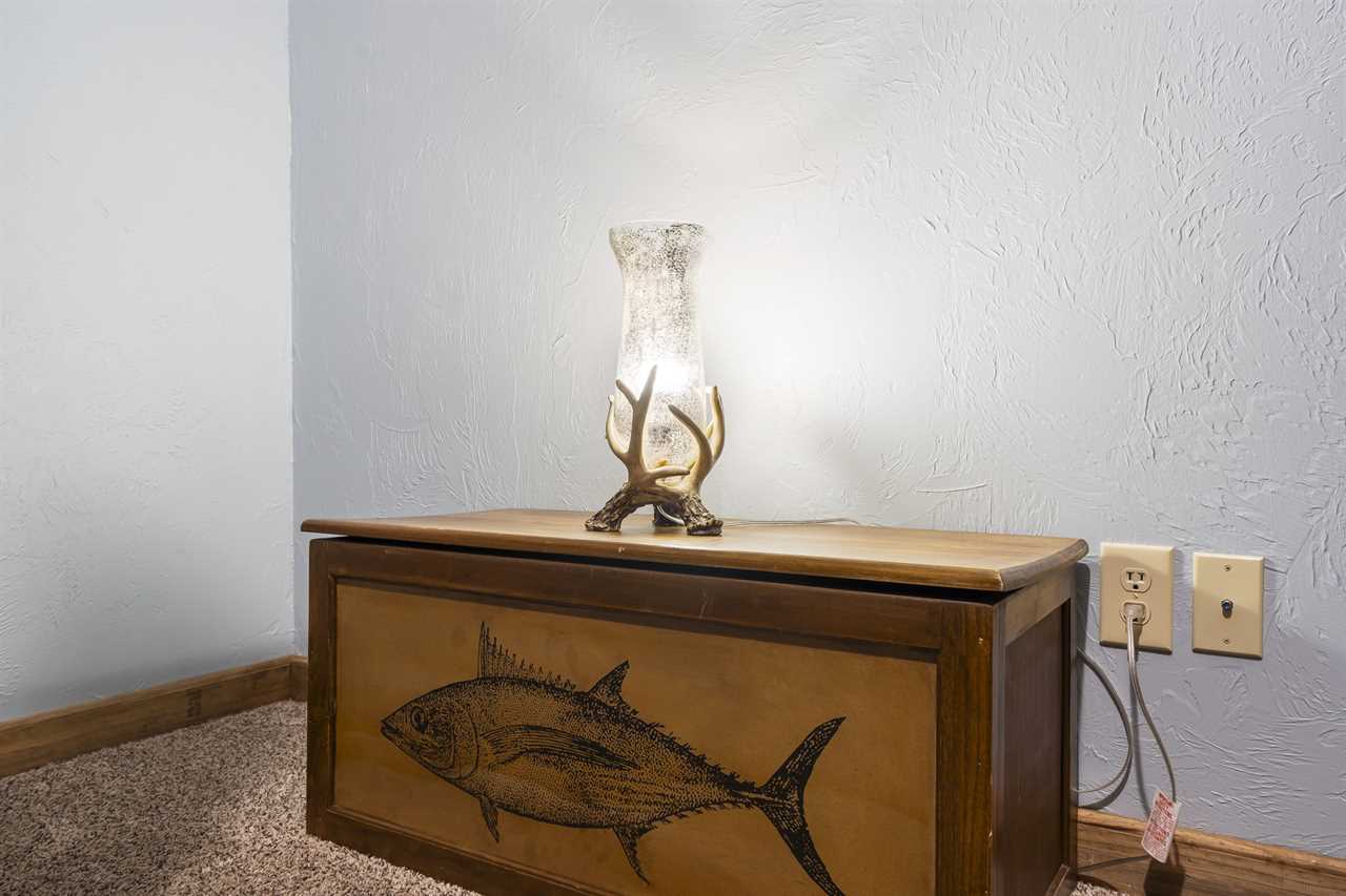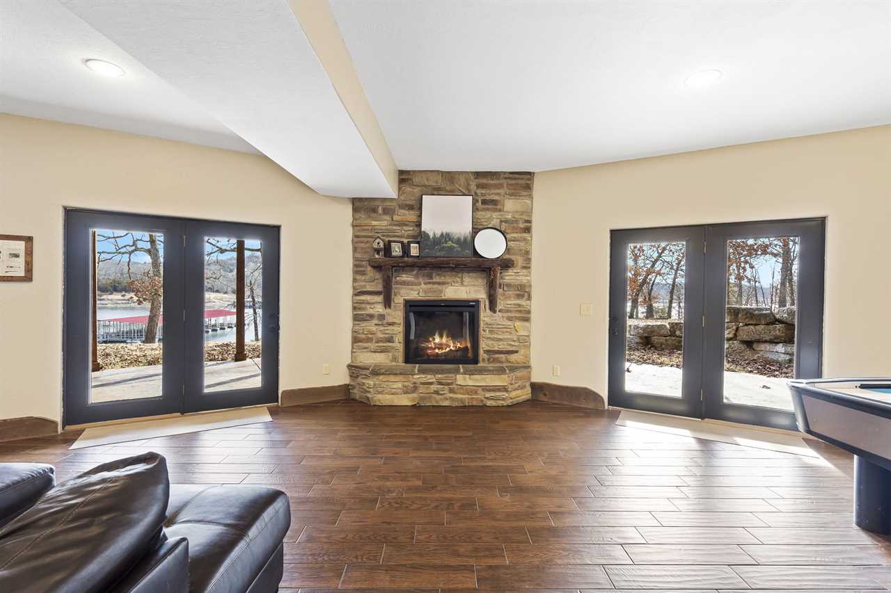 Venture downstairs to discover a second living area, complete with another fireplace and an air hockey table. This space offers a different ambiance, perfect for socializing, gaming, or simply kicking back. Step outside onto the lower patio, just a short walk away from the lake, providing a tranquil spot to enjoy nature's beauty.