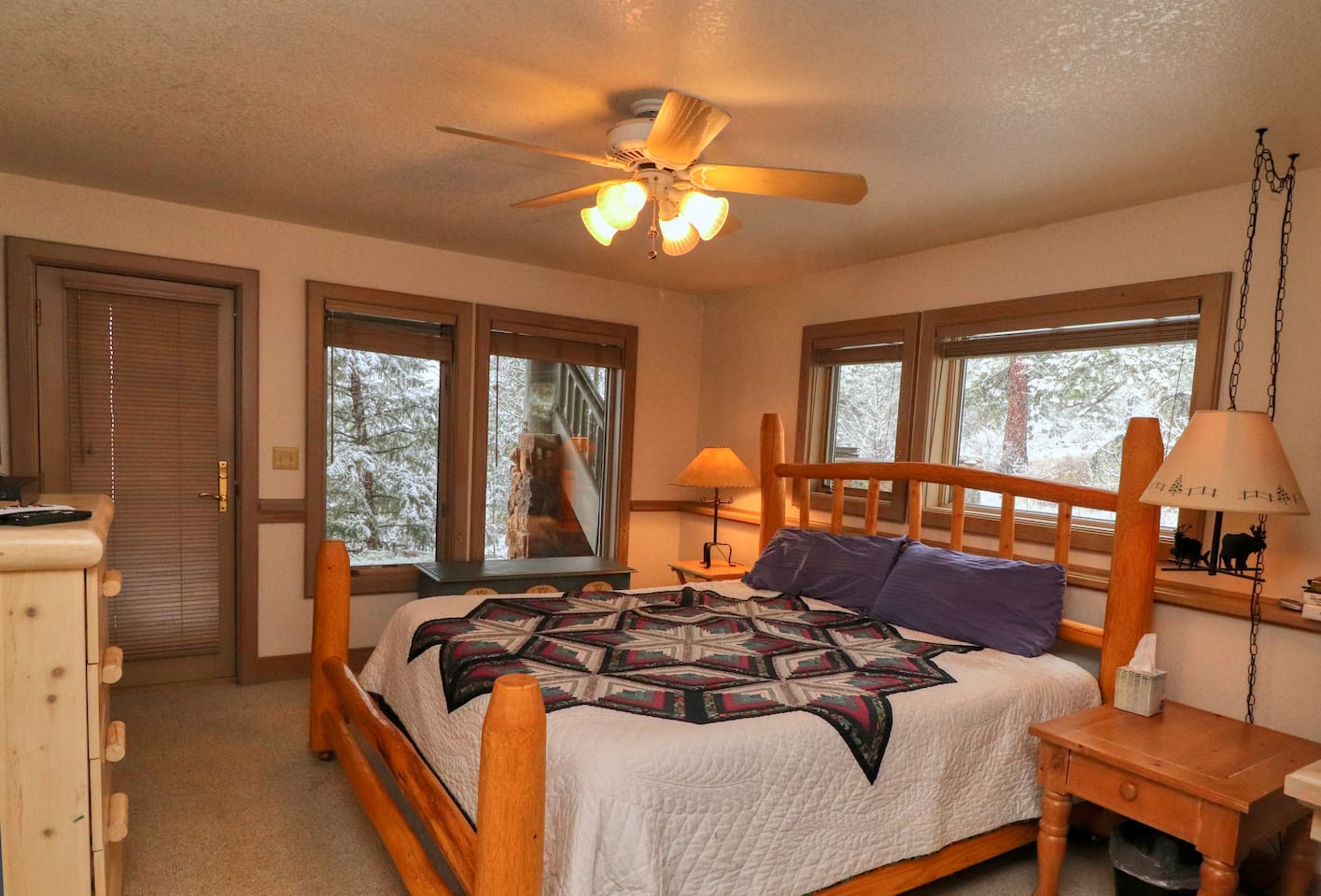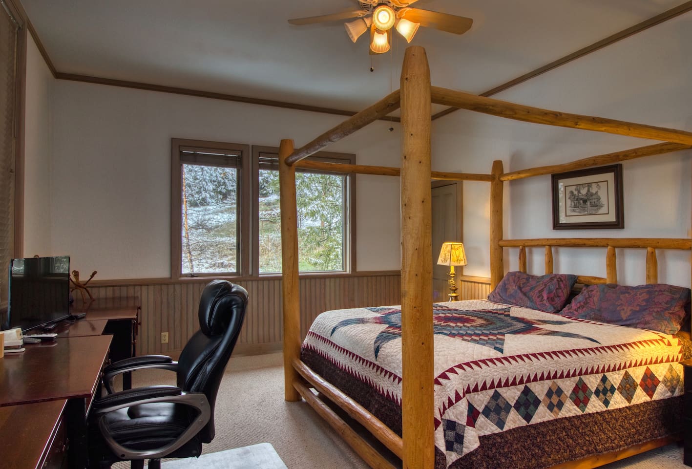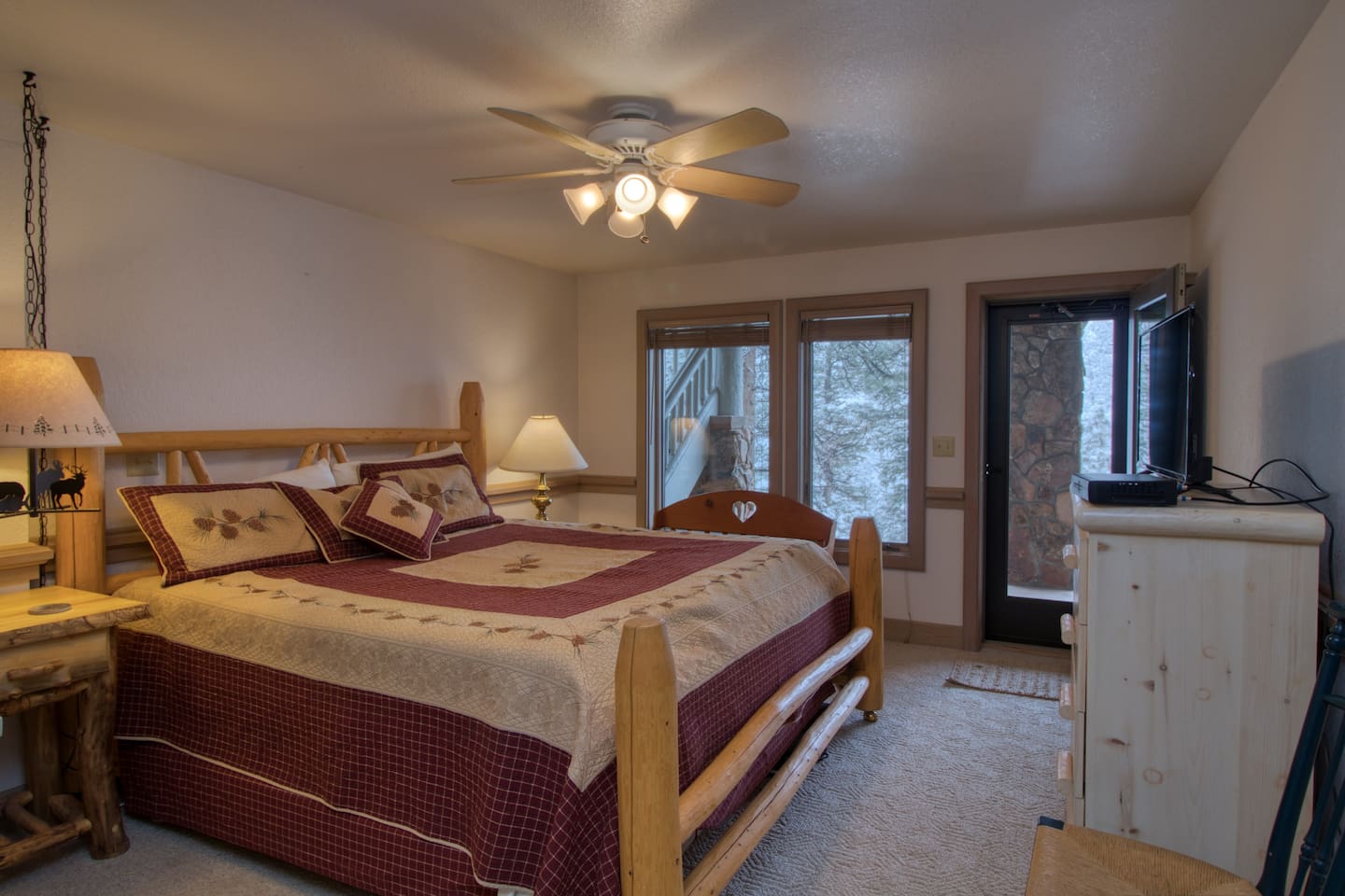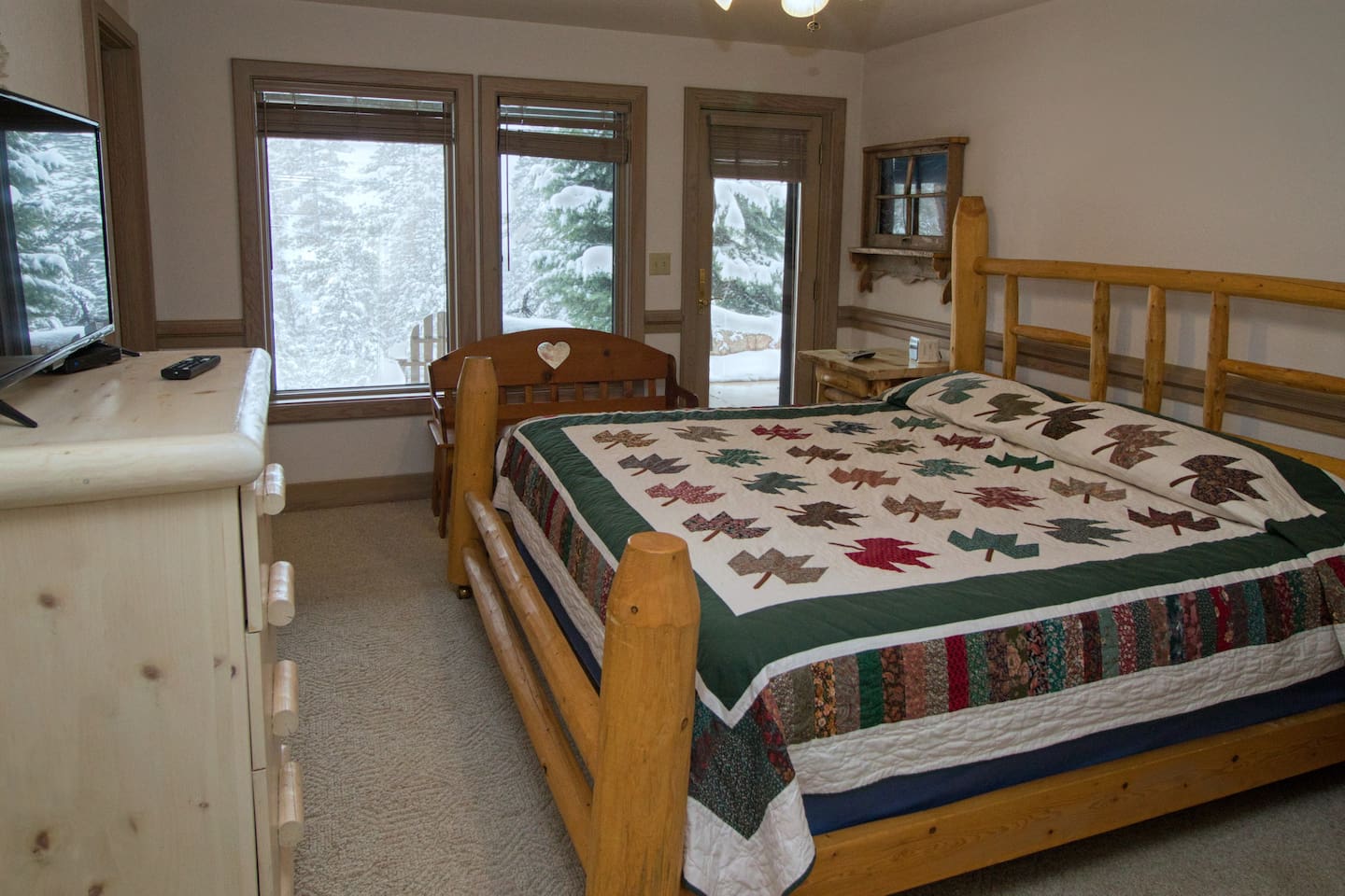 MASTER BED/BATH is on the main level. King-size log bed. Desk. TV. Walk-in closet. The bathroom has a big walk-in shower with rails and a shower seat available. Or soak in the jetted tub.