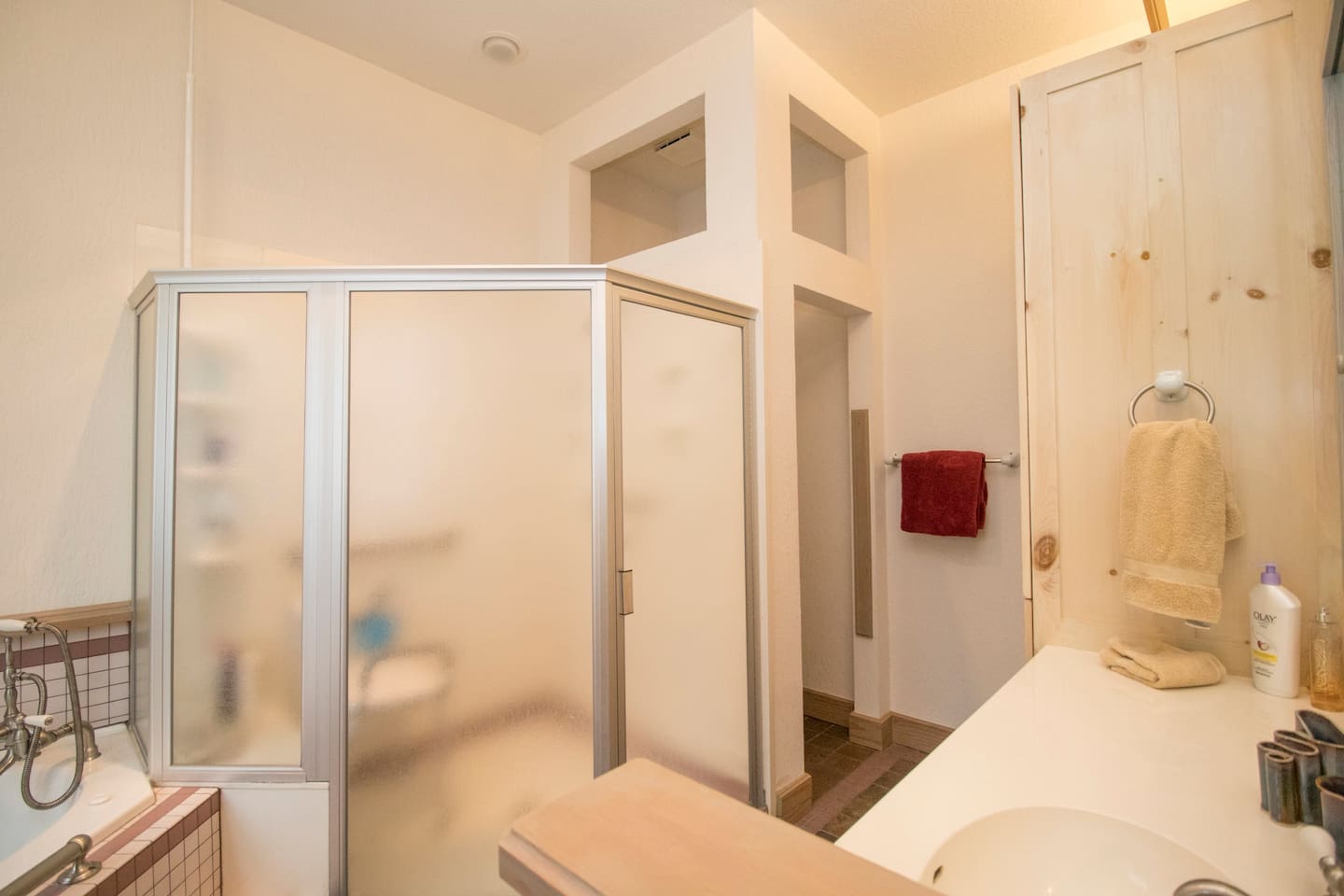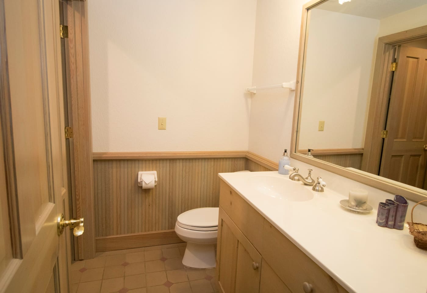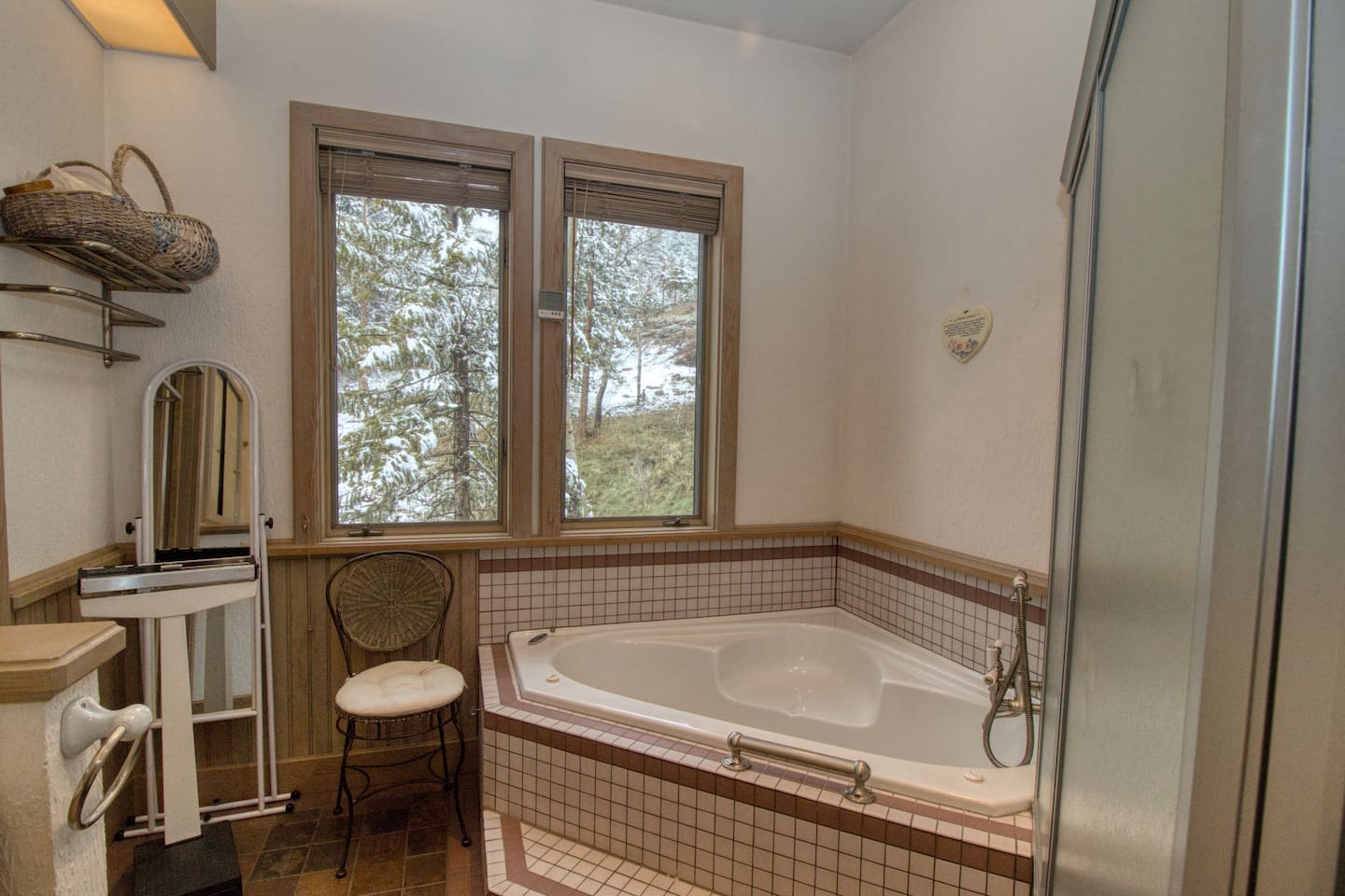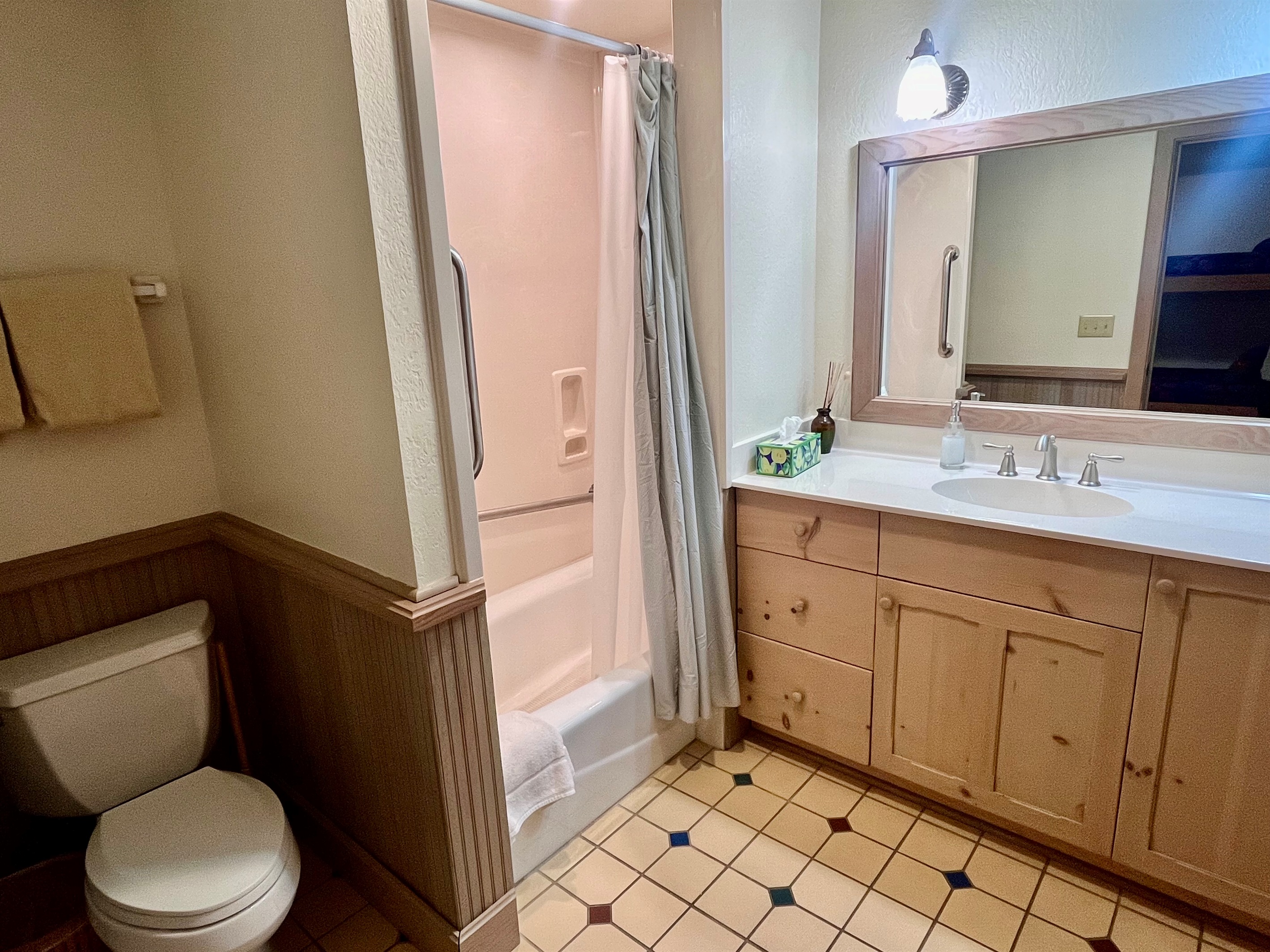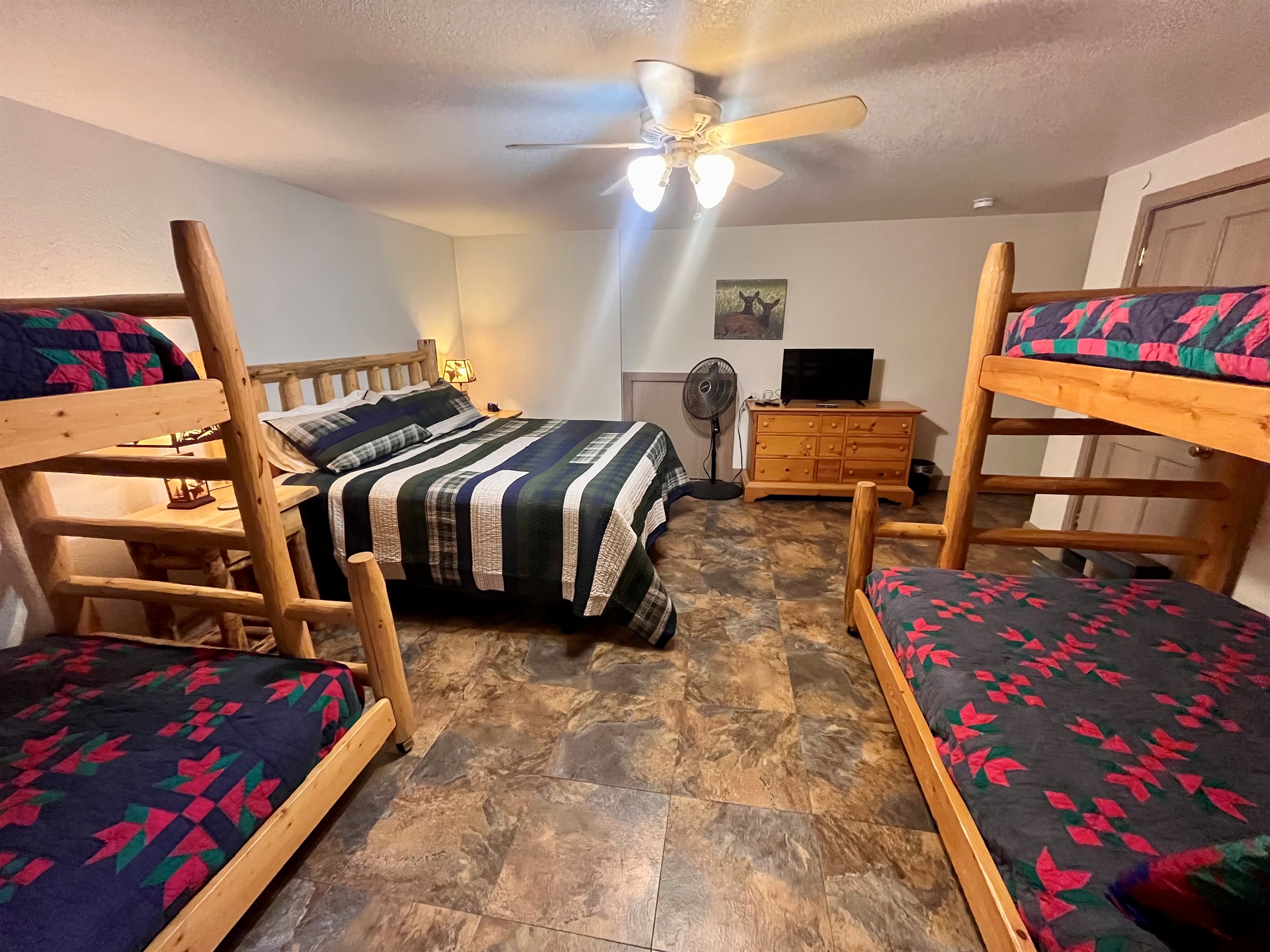 MASTER BED/BATH is on the main level. King-size log bed. Desk. TV. Walk-in closet. The bathroom has a big walk-in shower with rails and a shower seat available. Or soak in the jetted tub.