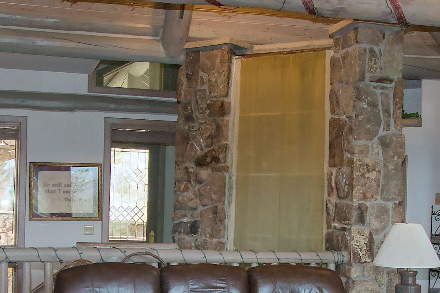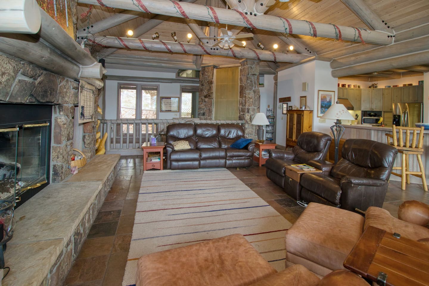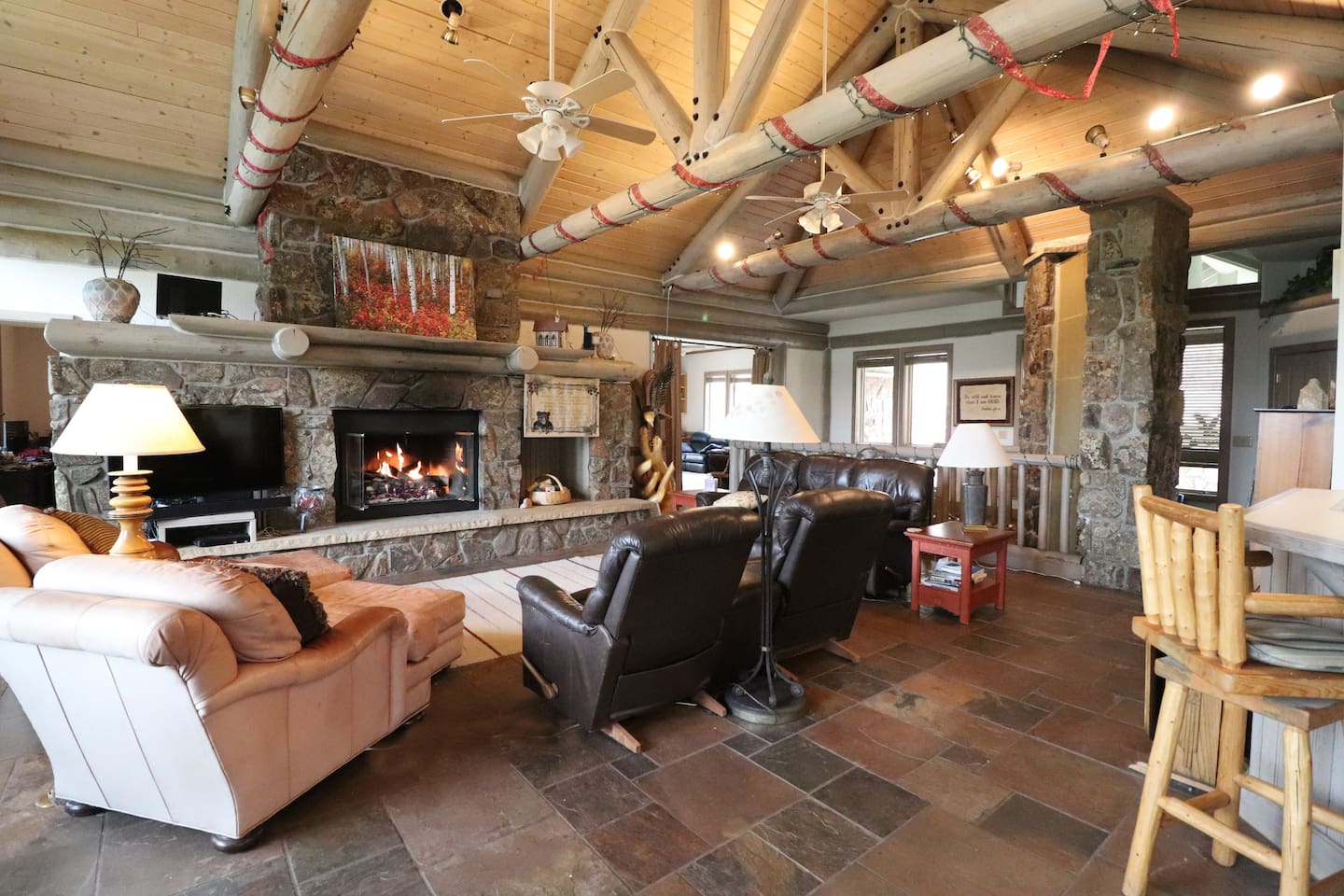 Soaring stone gas fireplace.