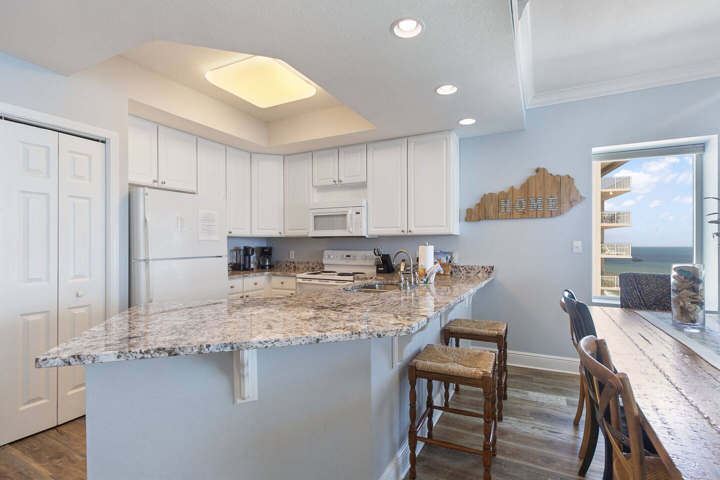 Step into a world of opulence where every detail has been carefully curated. The unit boasts a wealth of upgrades, from new furniture and granite countertops to stylish decor and smart TVs. Convenience meets elegance with in-unit laundry facilities. The open-concept living space features an 8-person farmhouse table and 2 barstools, creating a perfect setting for shared meals. The oversized balcony beckons you to unwind and soak in the stunning vistas of the Gulf, facing east for breathtaking sunrises.