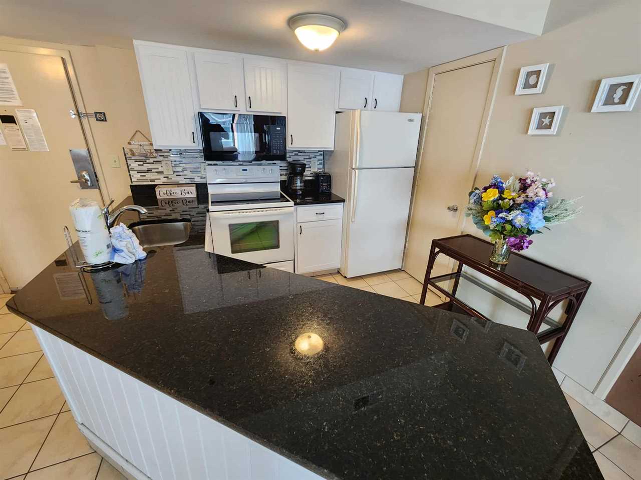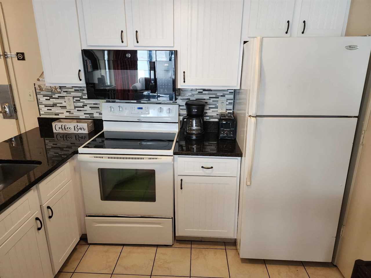 The kitchen is located just off from the living area. The kitchen features full-size appliances, fridge, freezer, stove, oven, dishwasher, mounted microwave, coffee maker plentiful cabinet space for storage, kitchen sink, and so much more. We provide all basic cookware, kitchen utensils, pots, pans, cutlery, glassware, dishes, etc.