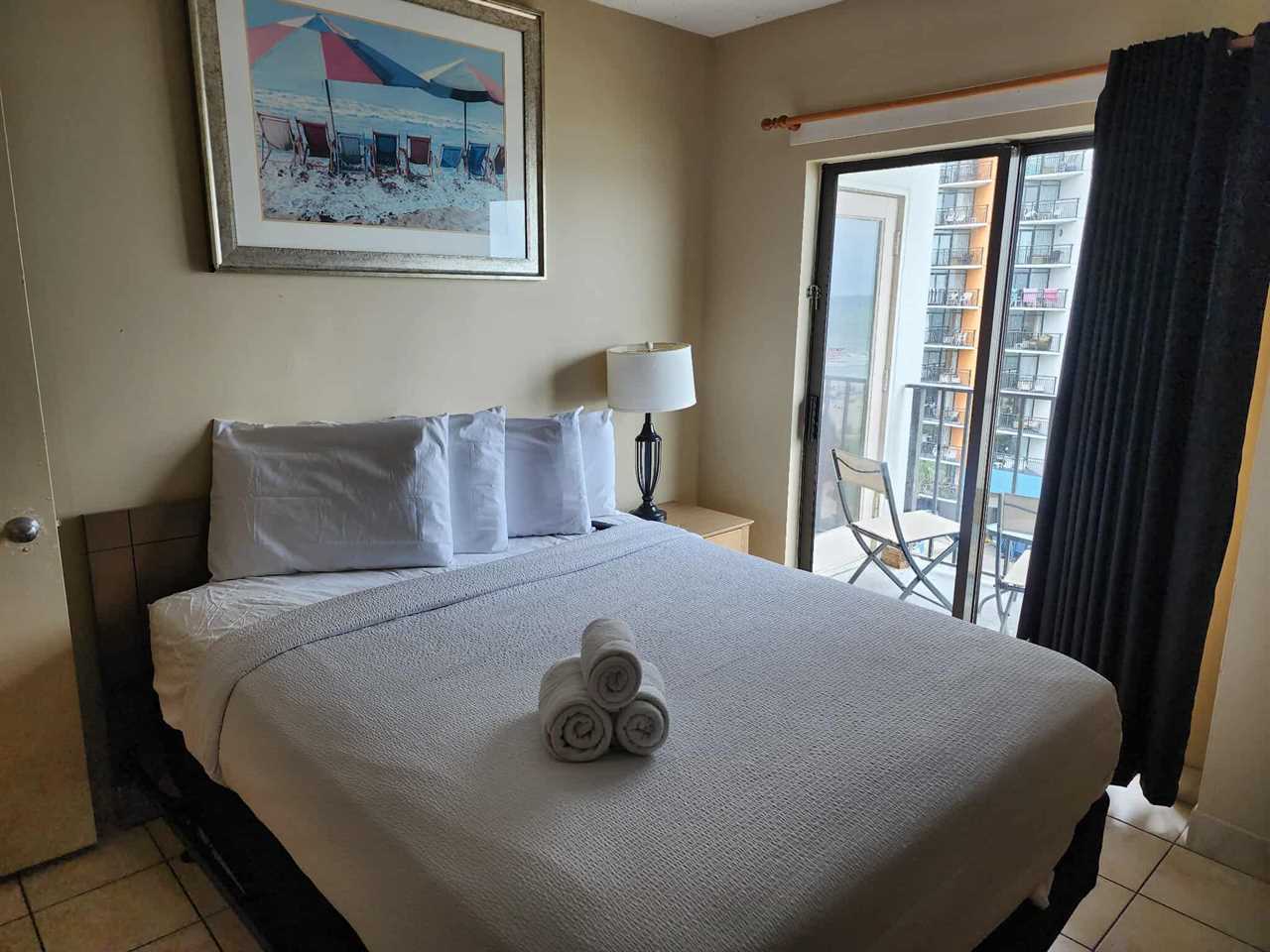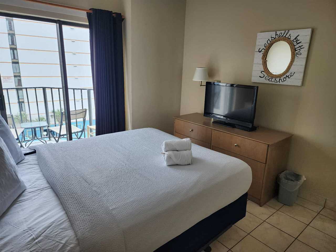 Upon arrival, guests will enter into the kitchen and living room area. Unlike many 1-bedroom rentals in town, you do not have to walk through the bedroom to get in and out of the condo! Directly to the right is where the bedroom and full bathroom is located. The bedroom features a queen size bed, nightstand, dresser, flat screen TV, and access to the private ocean view balcony!