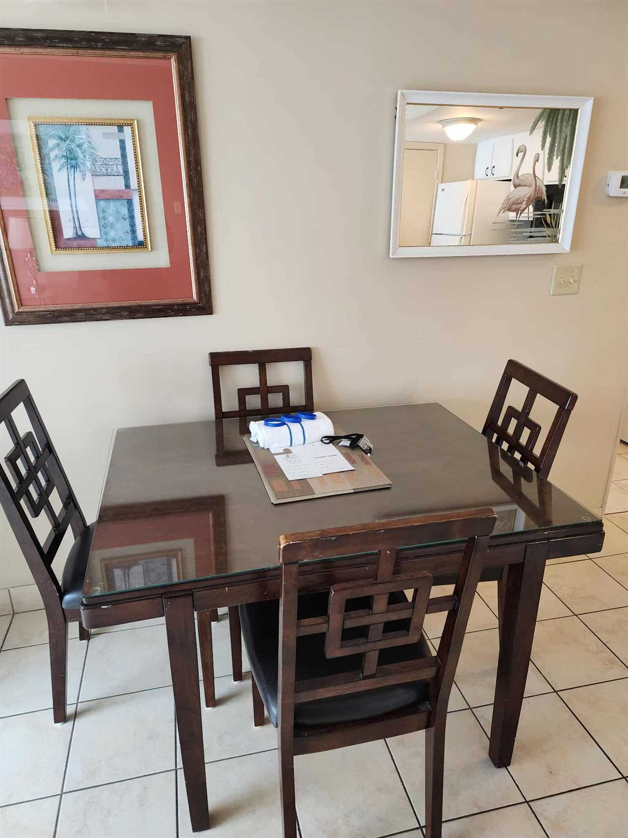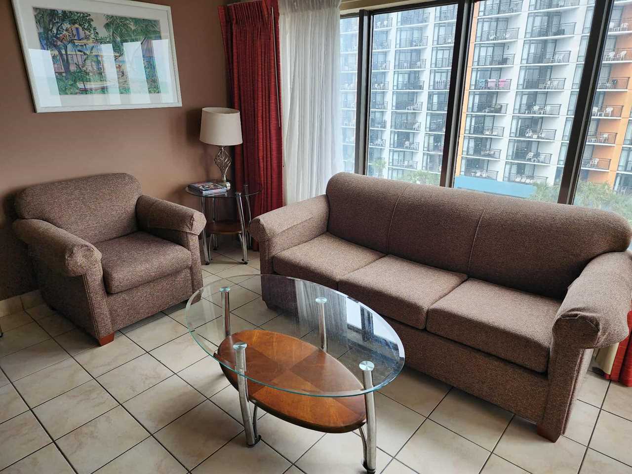 Entering into the living room, guests will find the most relaxing part of the entire condo! The living room is open and spacious and features endless views of the ocean. The 5th floor offers such great views; not too high, not too low! The living room offers a dining table and chairs, queen-sized sleeper sofa, accent chairs, end tables, TV stand with large wall mounted TV above, and access to the ocean view balcony.