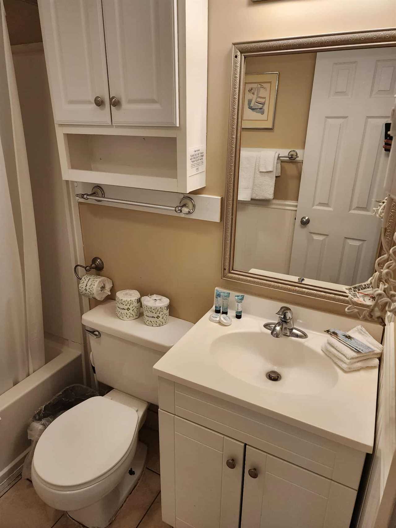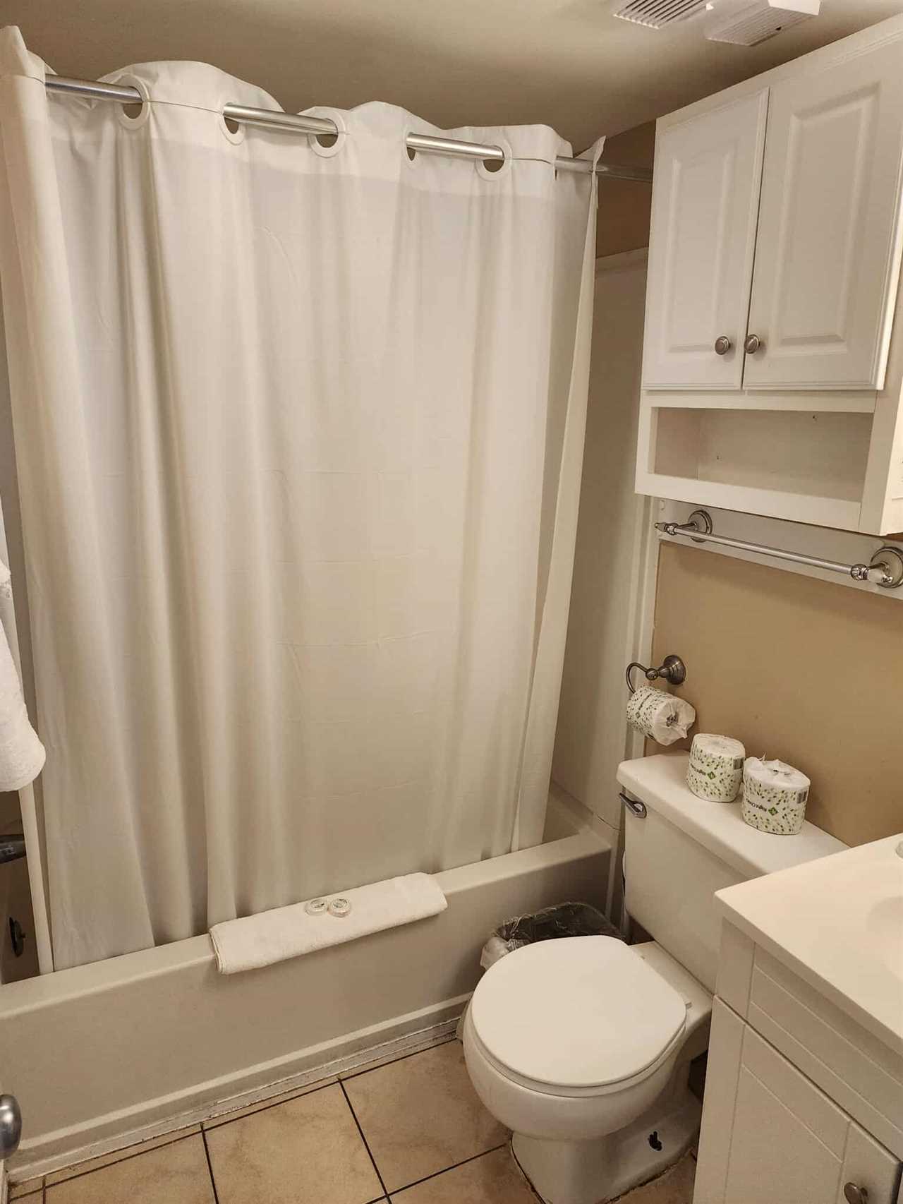Directly across the hall from this bedroom guests will find the bathroom. This bathroom features a tub/shower combo, vanity with sink, mirror, toilet, and storage above the toilet.