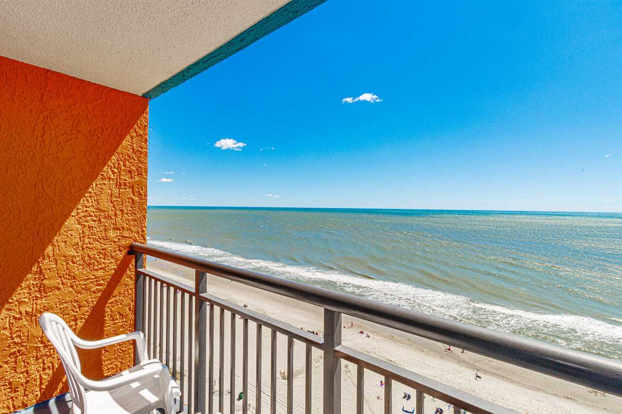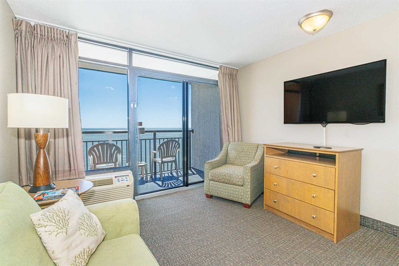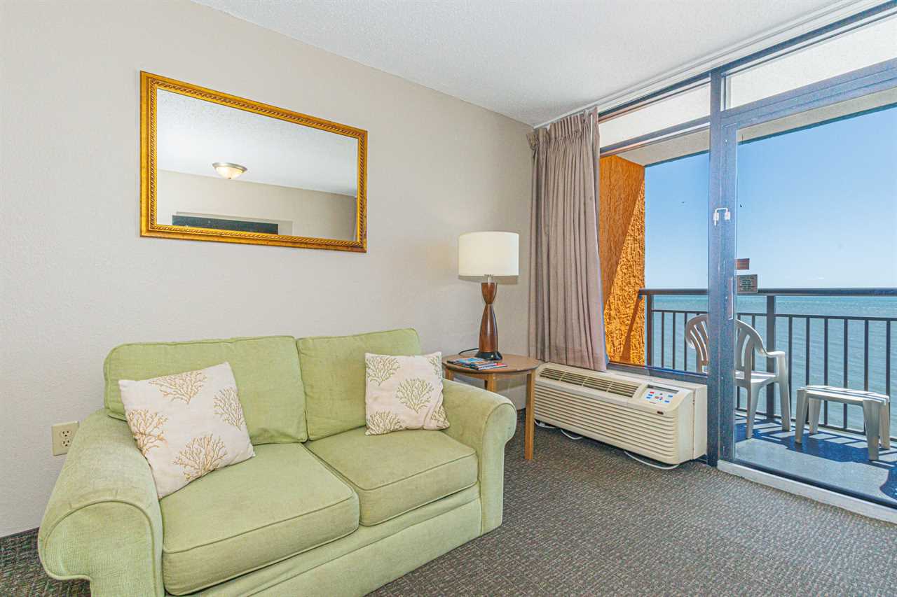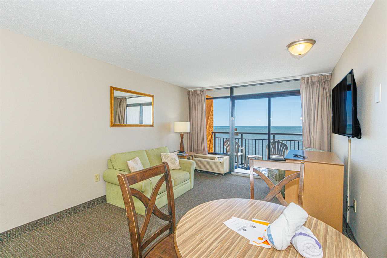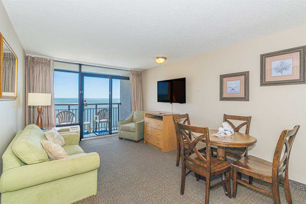 The search for your next vacation stops here! Check out this 15th floor, oceanfront condo at the Landmark Resort in Myrtle Beach. This 1-bedroom suite is fully furnished with 2 full beds, 1 full size murphy bed, and will comfortably accommodate 6 guests. This condo offers a spacious living space with a love seat, TV, a small dining table with chairs, and beautiful oceanfront views from the private balcony right off the living area.