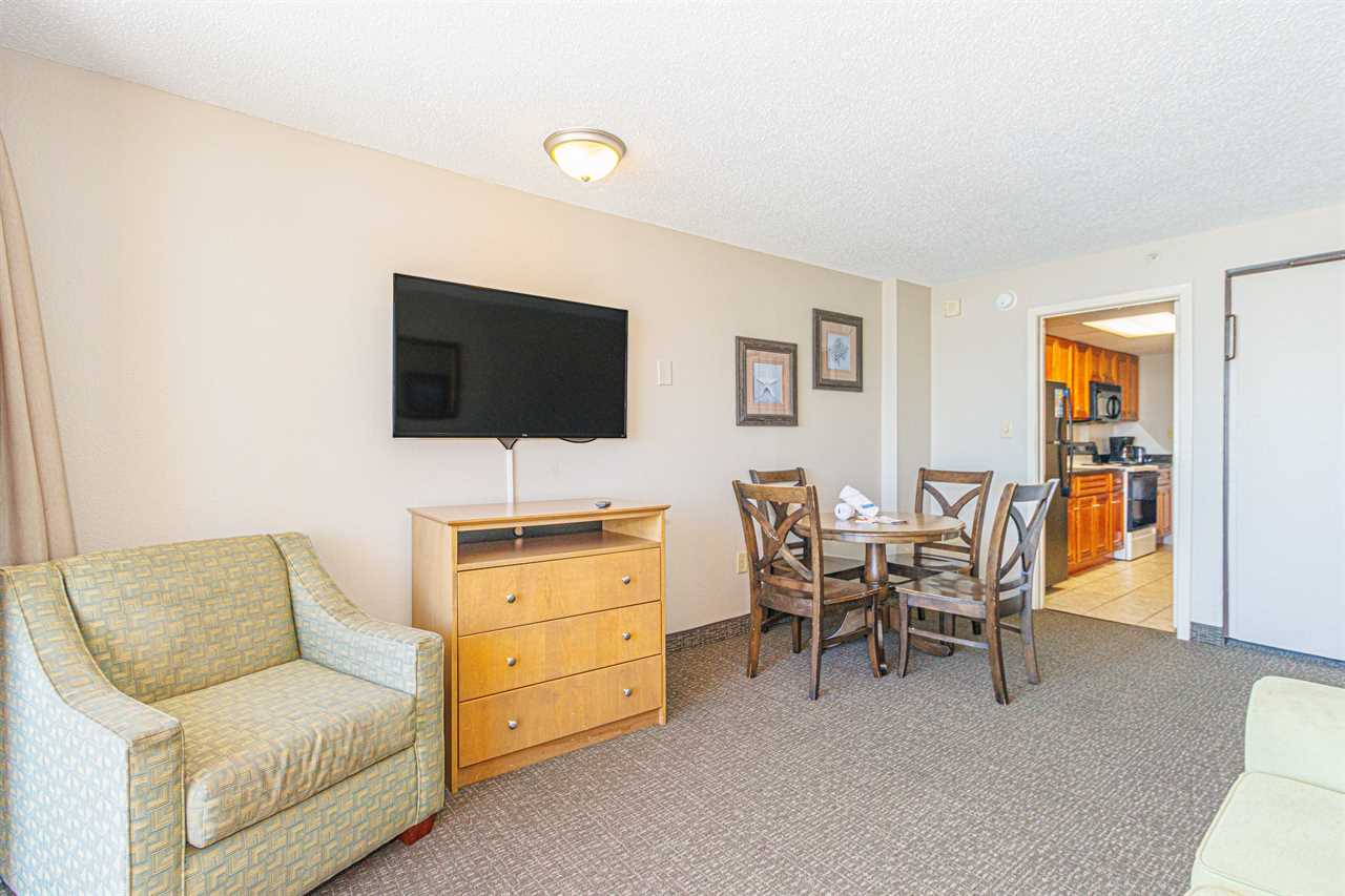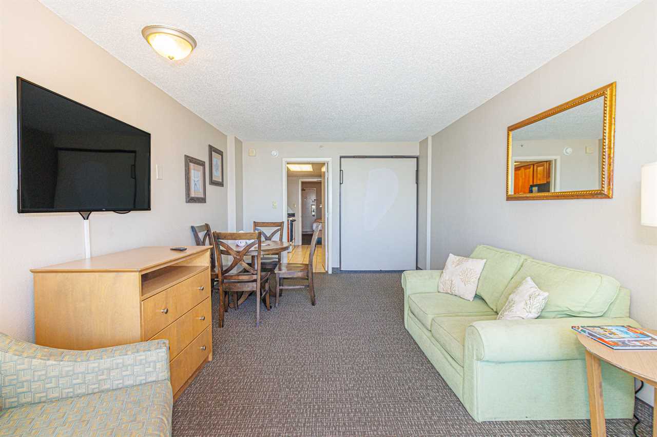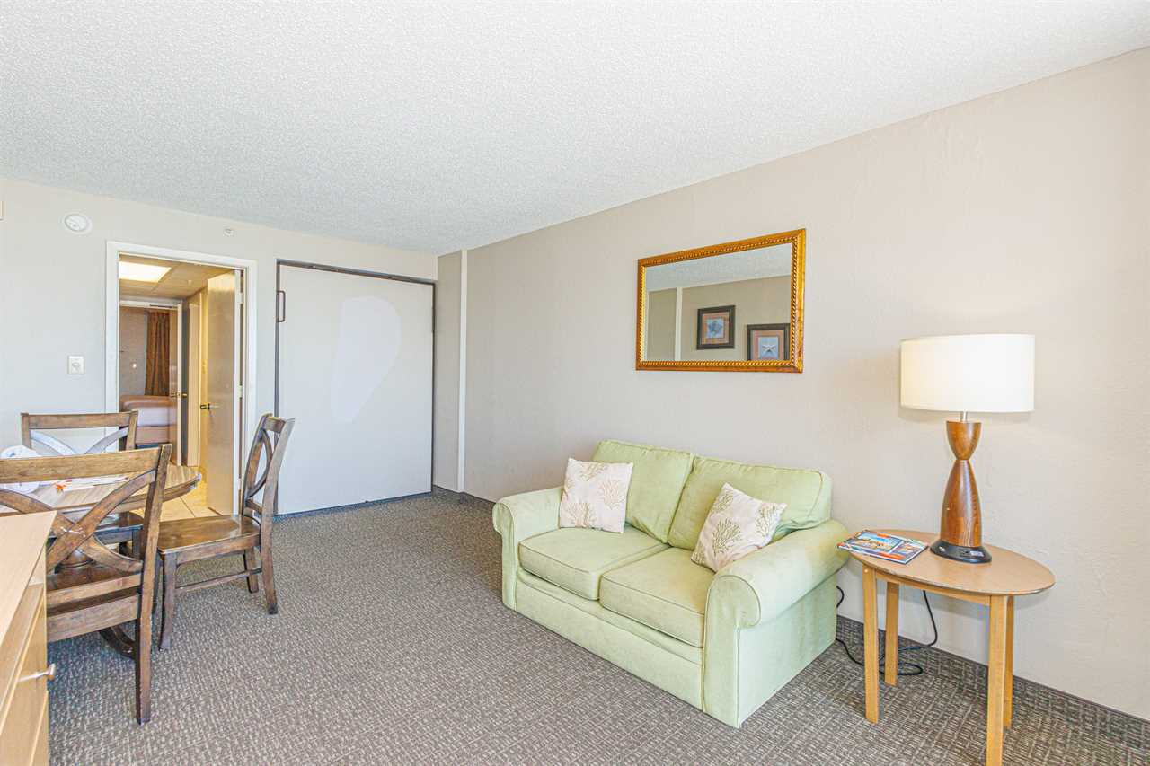Making your way into the living room, guests will find the most relaxing part of the condo! The living room features a full-size murphy bed (wall bed), love seat, TV, dining table with chairs, and access to the private oceanfront balcony!