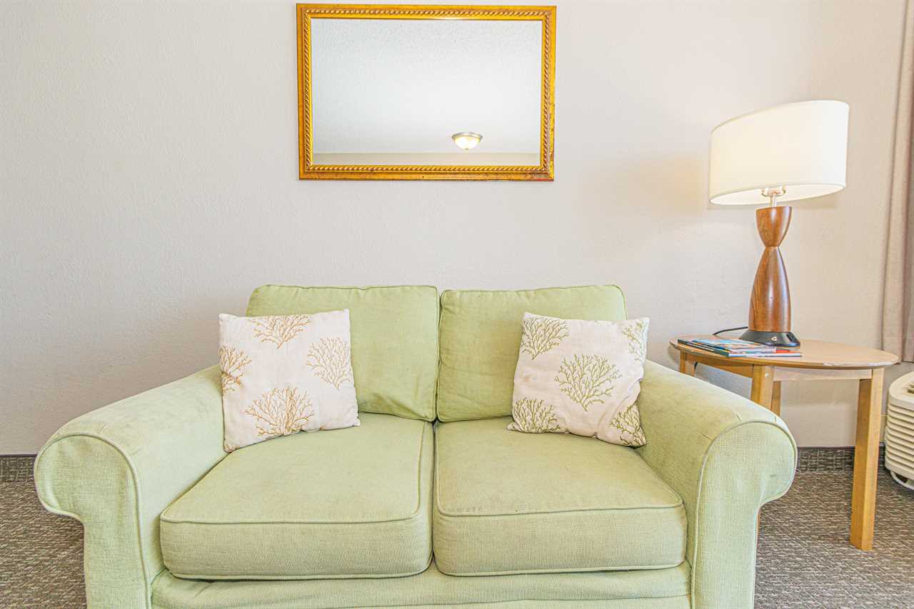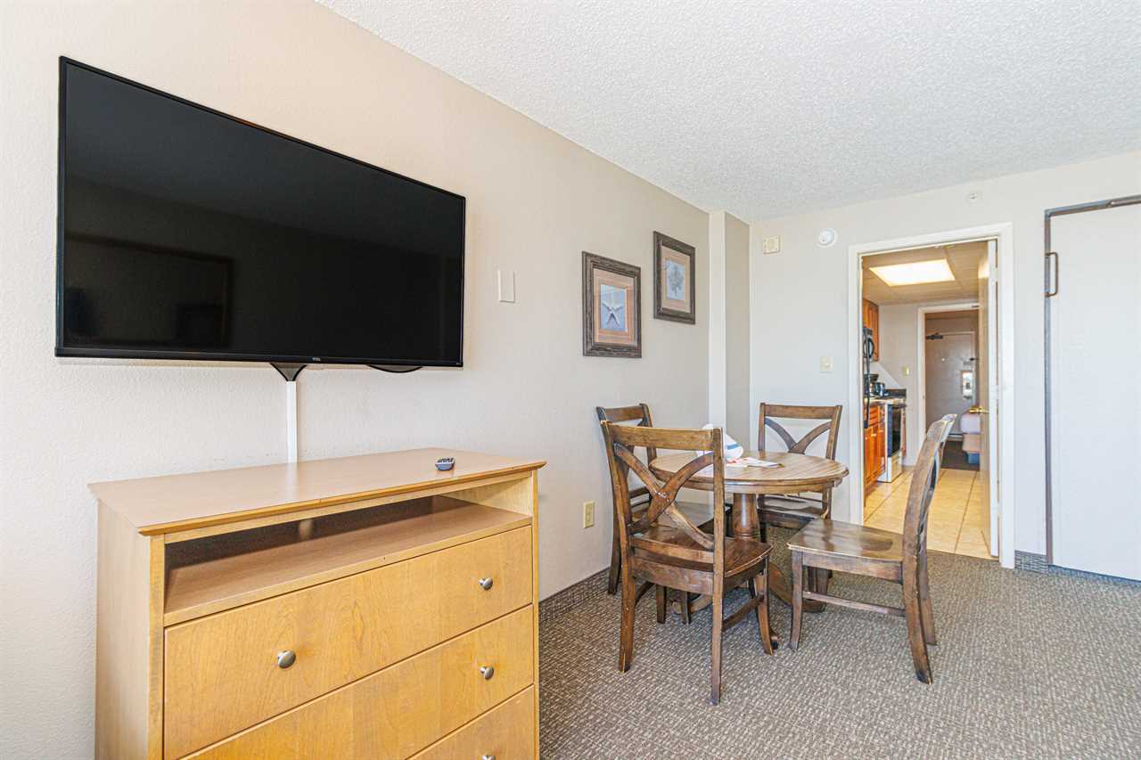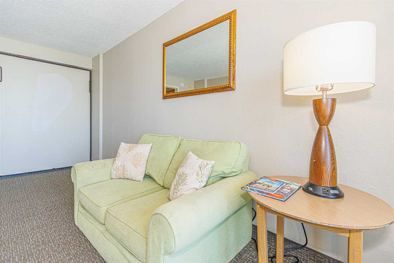 Making your way into the living room, guests will find the most relaxing part of the condo! The living room features a full-size murphy bed (wall bed), love seat, TV, dining table with chairs, and access to the private oceanfront balcony!