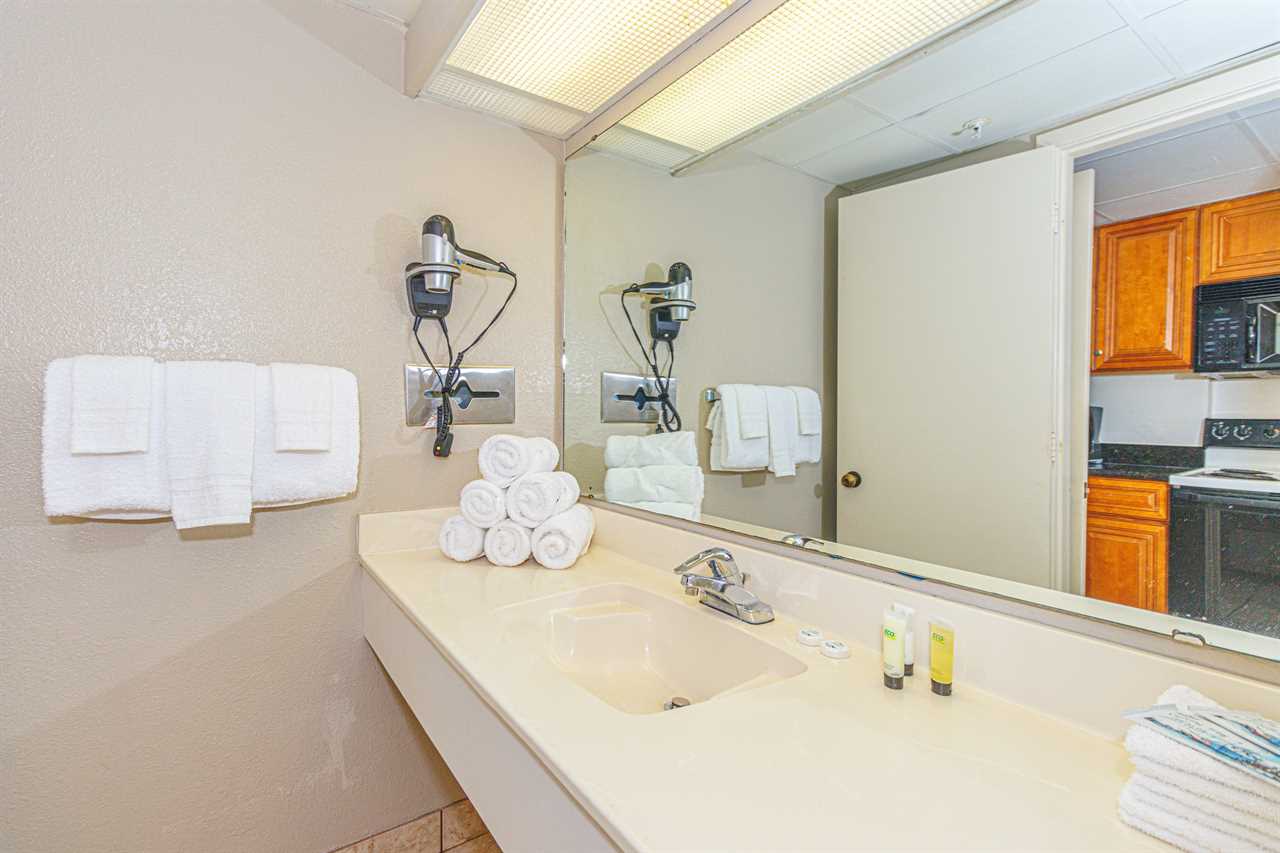 Making your way through the apartment, you will find the bedroom. The bedroom is furnished with 2 full sized beds, TV, and dresser. This space is perfect for 2-4 guests. The full-size bathroom sits right off the kitchen as well and features a tub/shower combo, vanity, sink, and mirror.