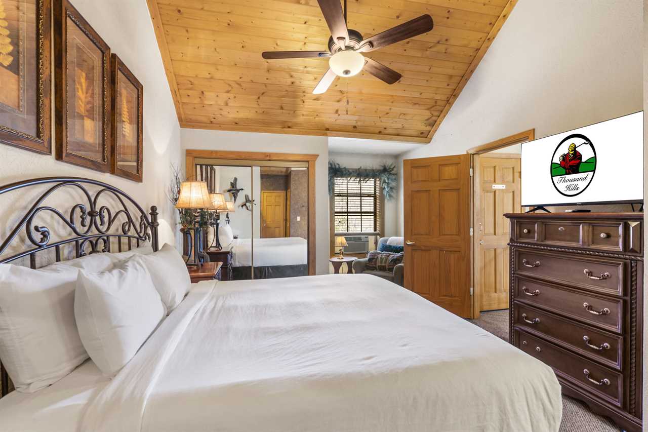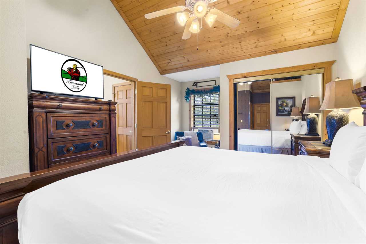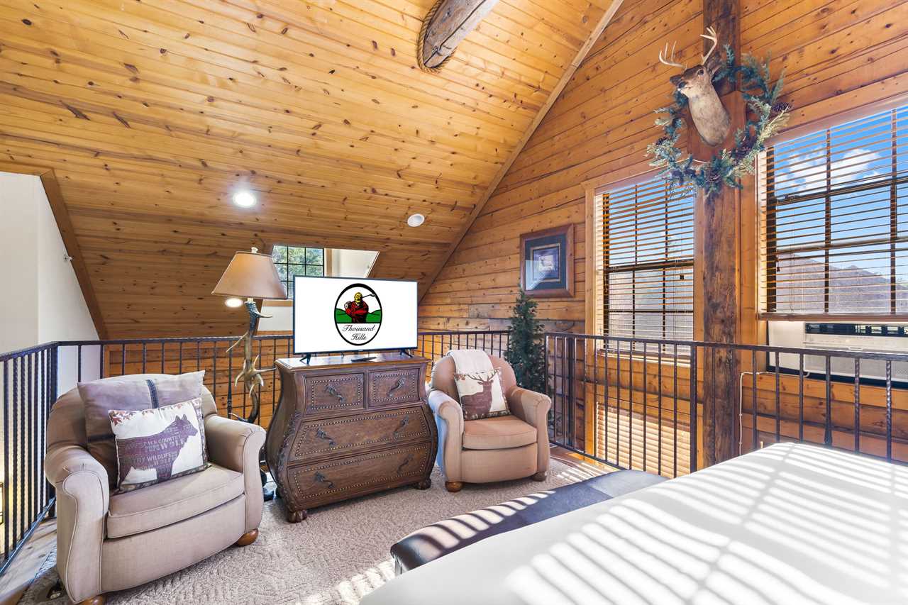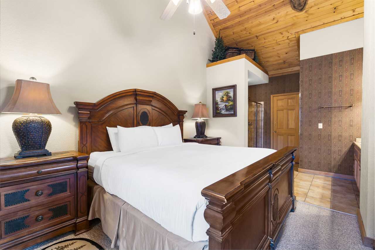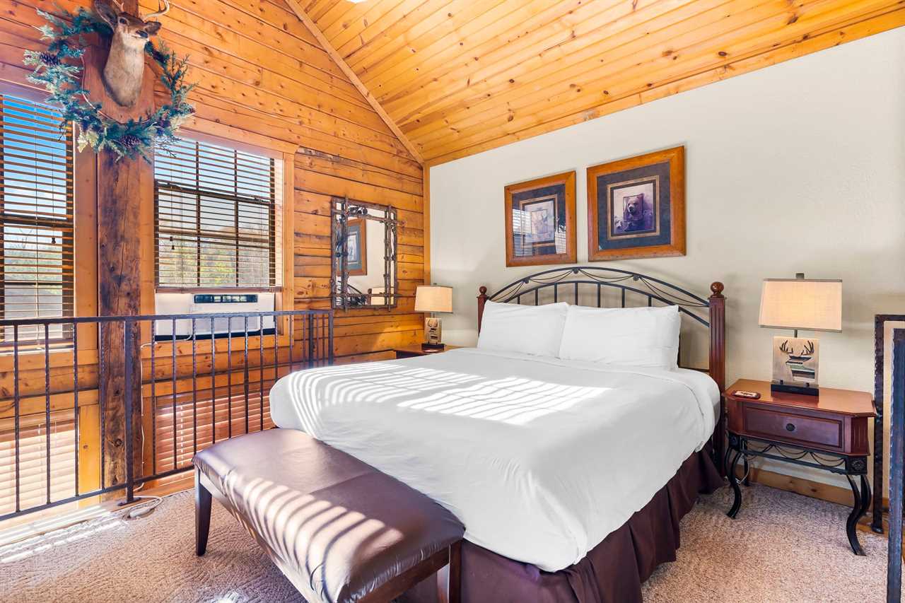 Cabin 302: Features a main-level king-sized bed with cable TV, a bathroom with a whirlpool tub, and a second-level open loft with a king bed and another TV. There's also another king bedroom with an ensuite bathroom, and note that these sleeping areas are open to each other.