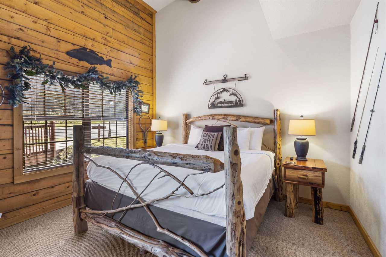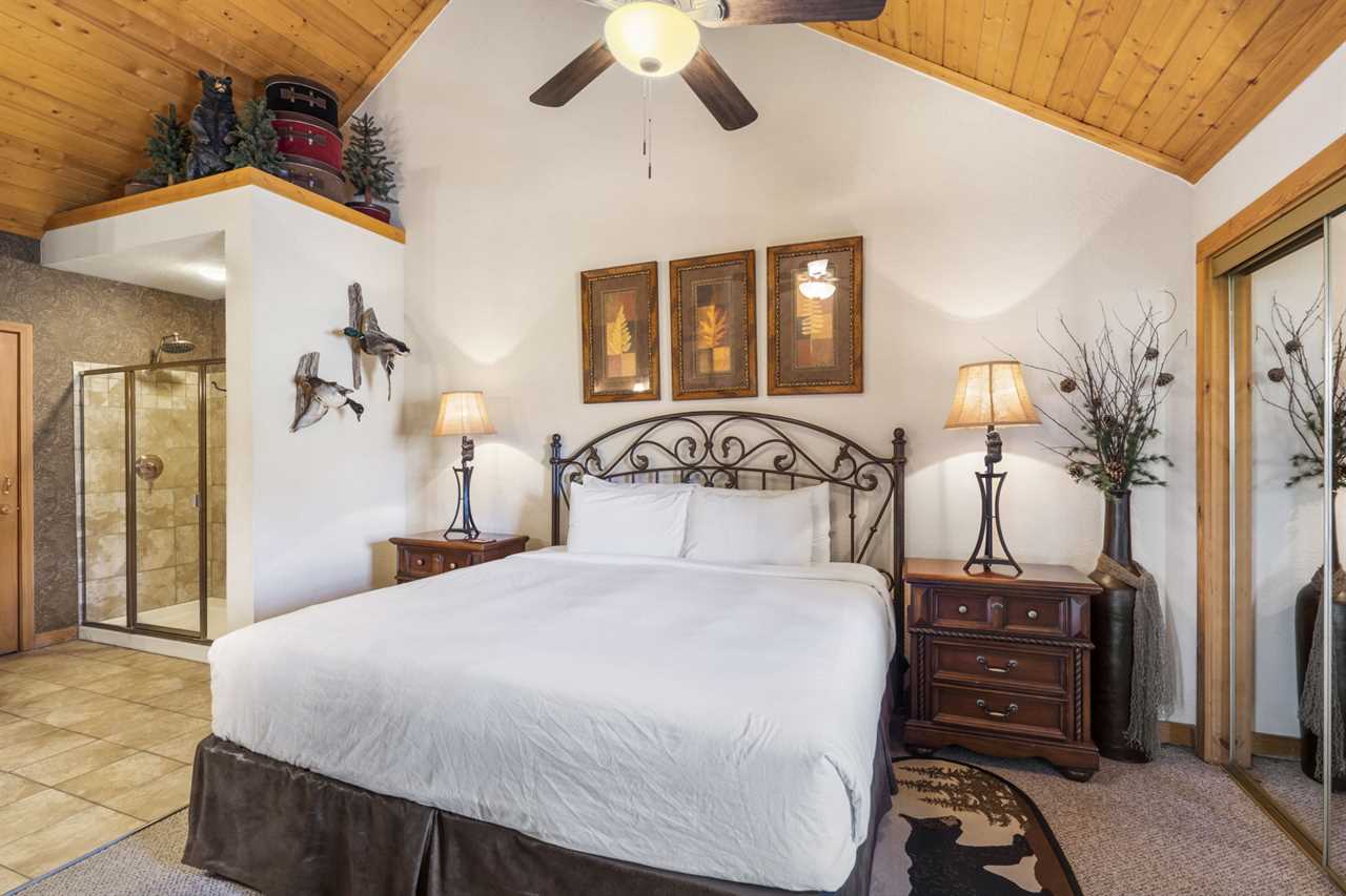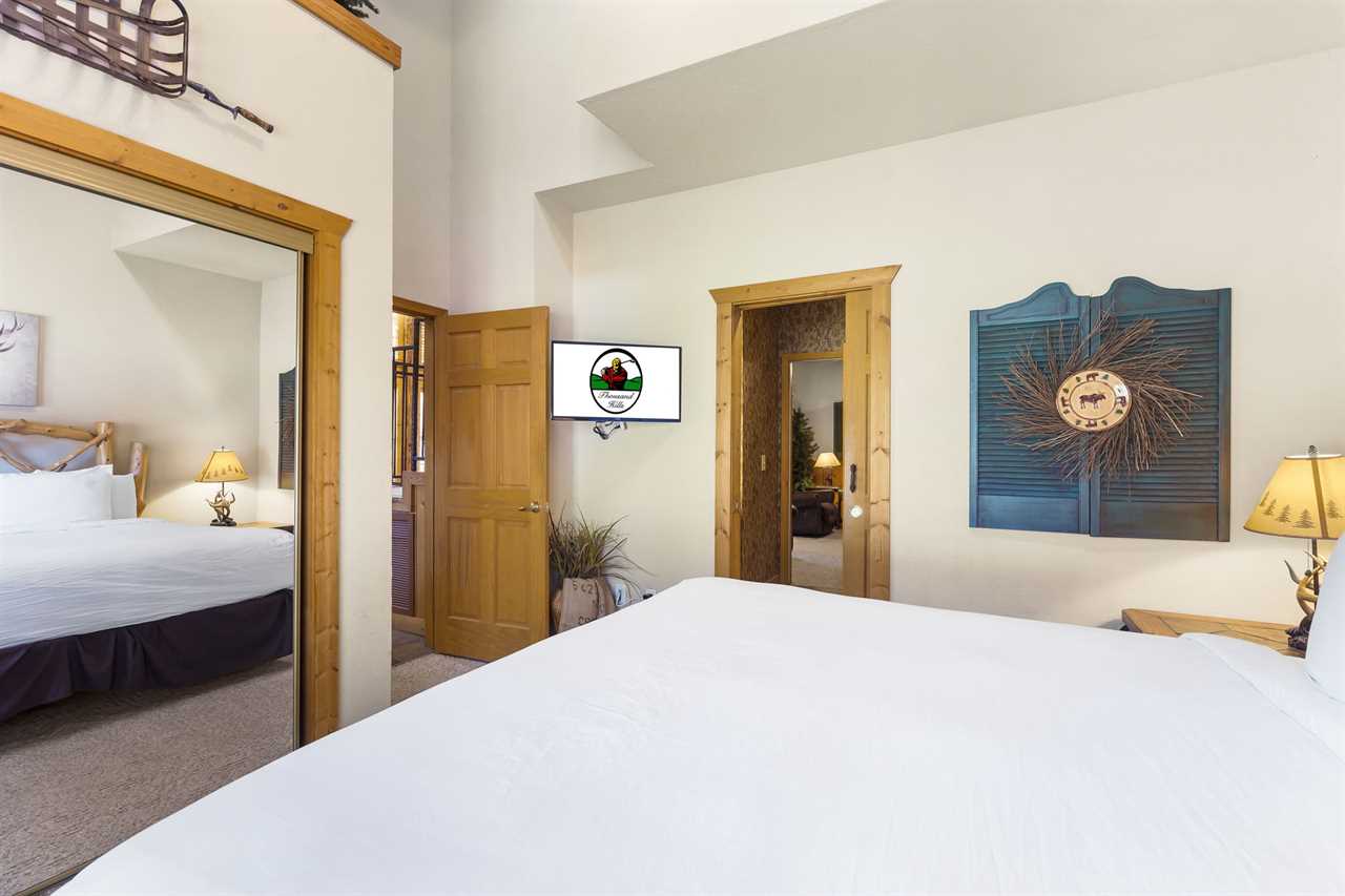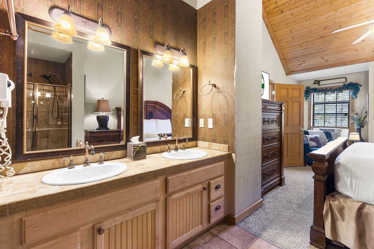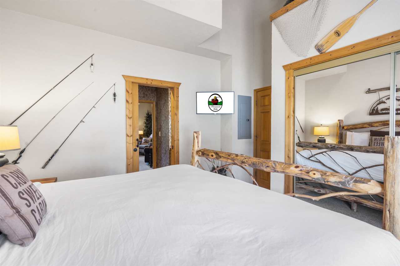 Cabin 302: Features a main-level king-sized bed with cable TV, a bathroom with a whirlpool tub, and a second-level open loft with a king bed and another TV. There's also another king bedroom with an ensuite bathroom, and note that these sleeping areas are open to each other.