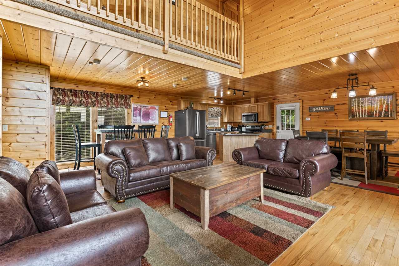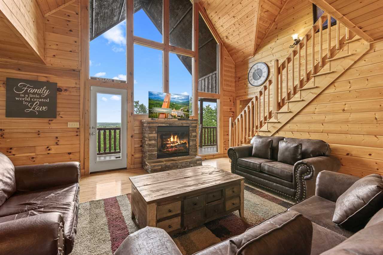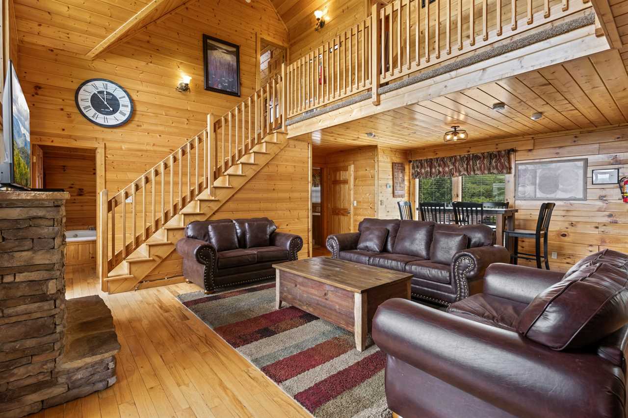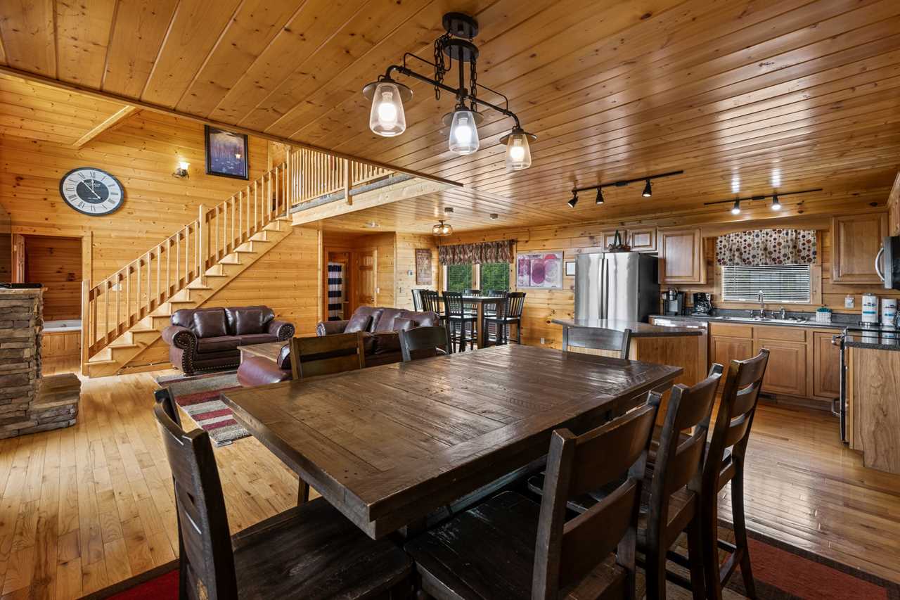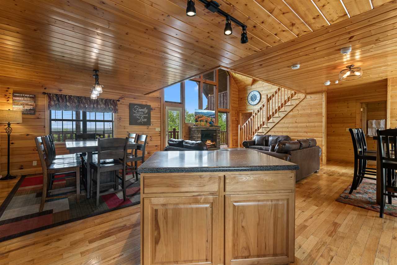 Panoramic View boasts 3 levels, each offering unique features and amenities. The main level is equipped with an open kitchen, complete with an island, and two dining tables, a cozy living room with ample seating, and a large 50 " Roku TV. & a gas fireplace, additionally, this level includes a luxurious king bed suite with a full shower and bath & in -room jetted tub, as well as a large covered porch that spans the entire back of the house, the mountain views are spectacular from each level of the cabin.