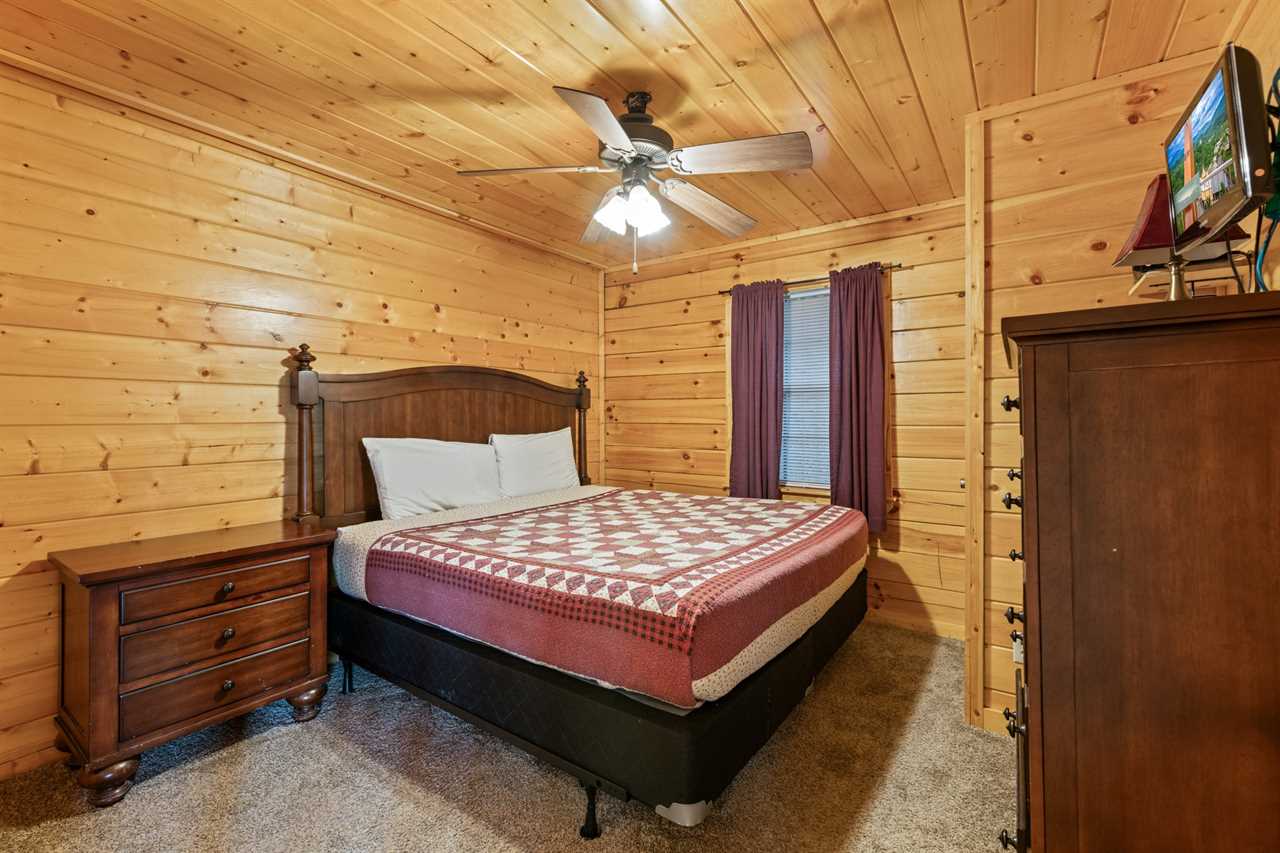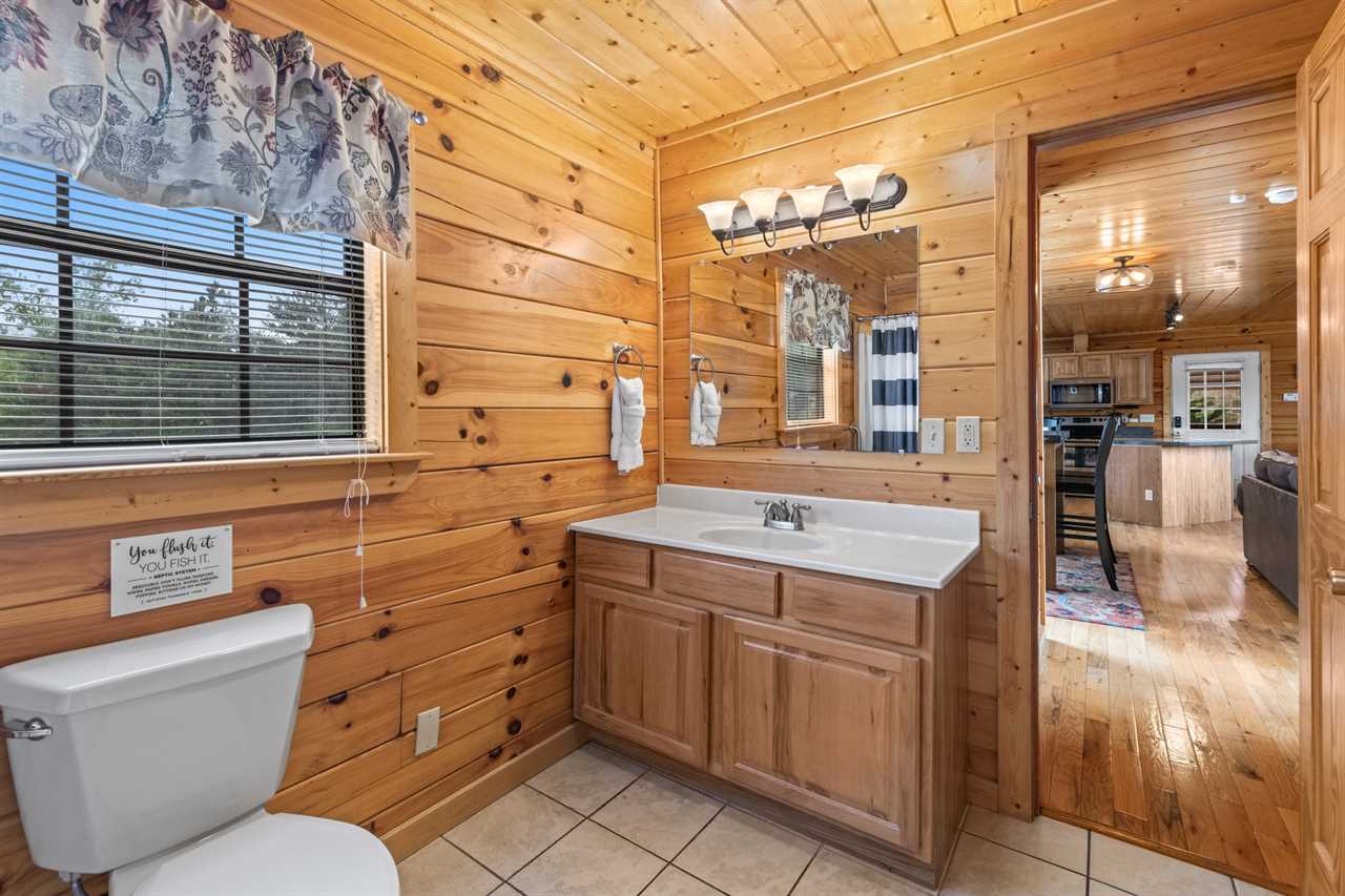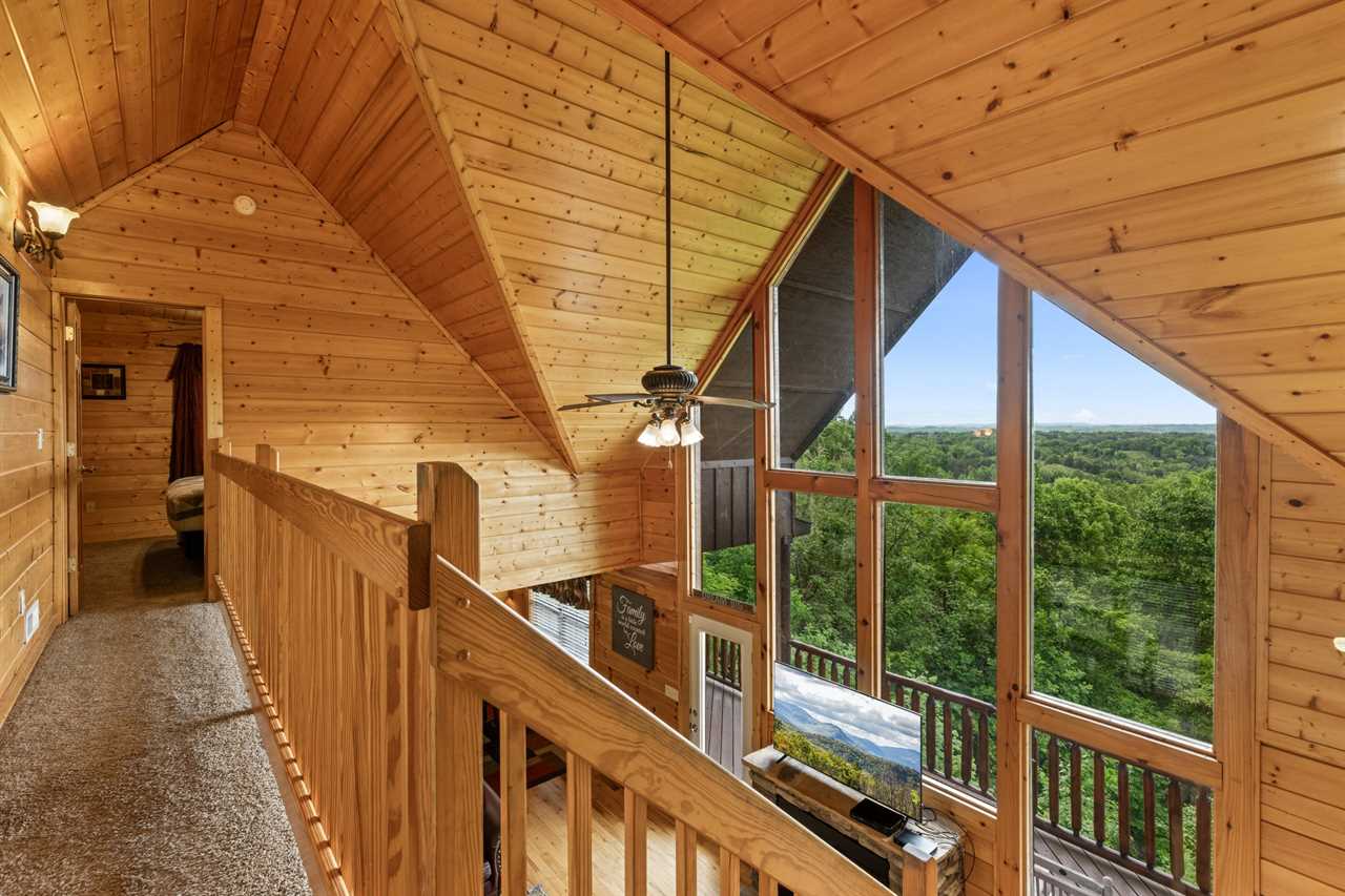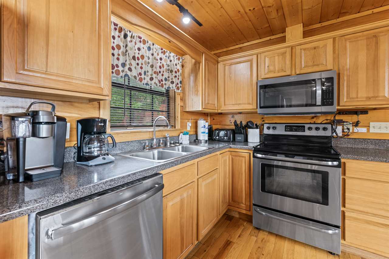 Panoramic View boasts 3 levels, each offering unique features and amenities. The main level is equipped with an open kitchen, complete with an island, and two dining tables, a cozy living room with ample seating, and a large 50 " Roku TV. & a gas fireplace, additionally, this level includes a luxurious king bed suite with a full shower and bath & in -room jetted tub, as well as a large covered porch that spans the entire back of the house, the mountain views are spectacular from each level of the cabin.