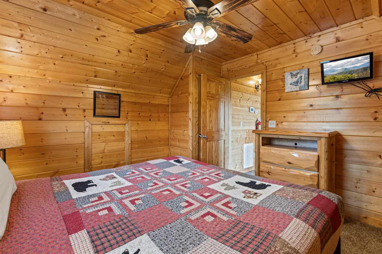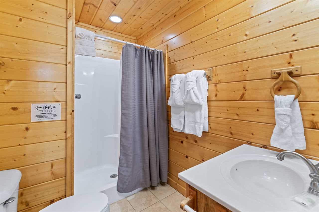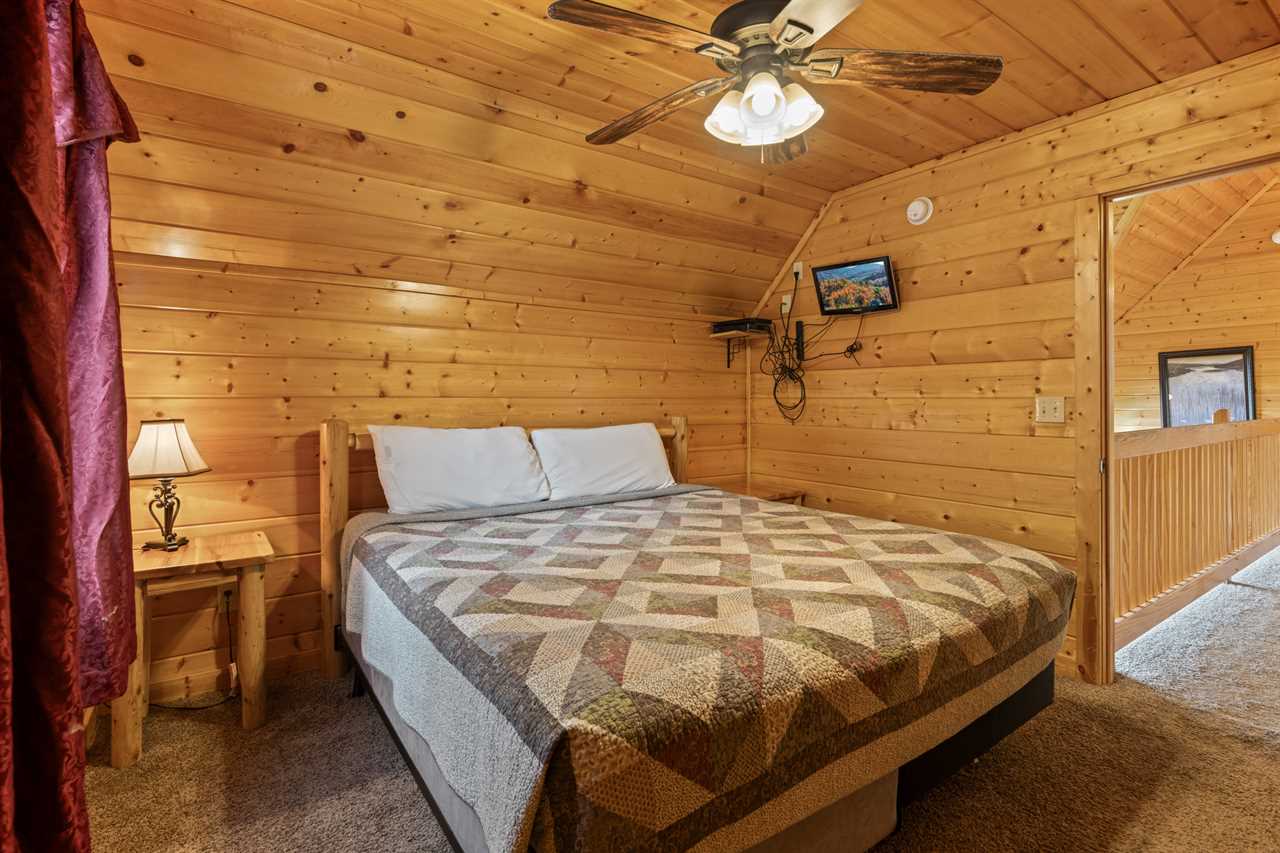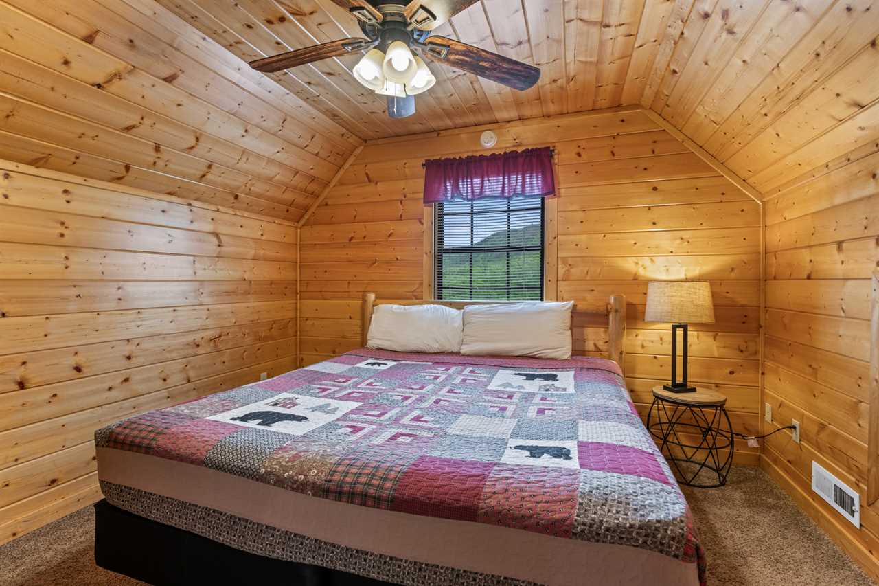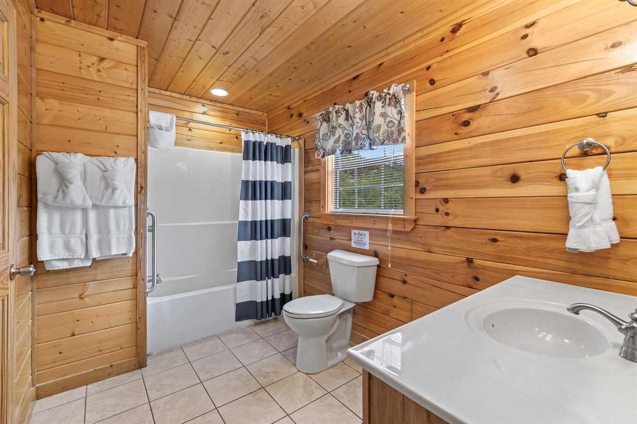 Panoramic View boasts 3 levels, each offering unique features and amenities. The main level is equipped with an open kitchen, complete with an island, and two dining tables, a cozy living room with ample seating, and a large 50 " Roku TV. & a gas fireplace, additionally, this level includes a luxurious king bed suite with a full shower and bath & in -room jetted tub, as well as a large covered porch that spans the entire back of the house, the mountain views are spectacular from each level of the cabin.