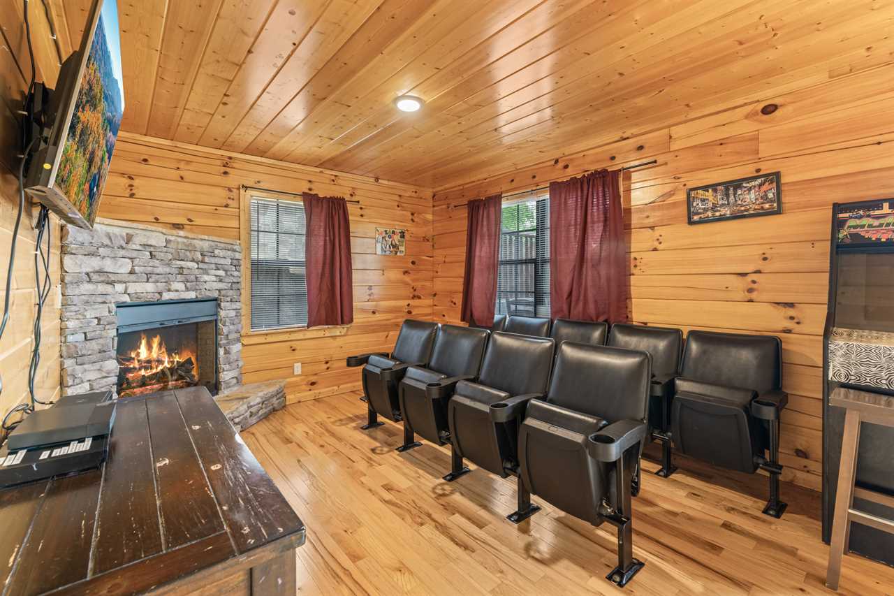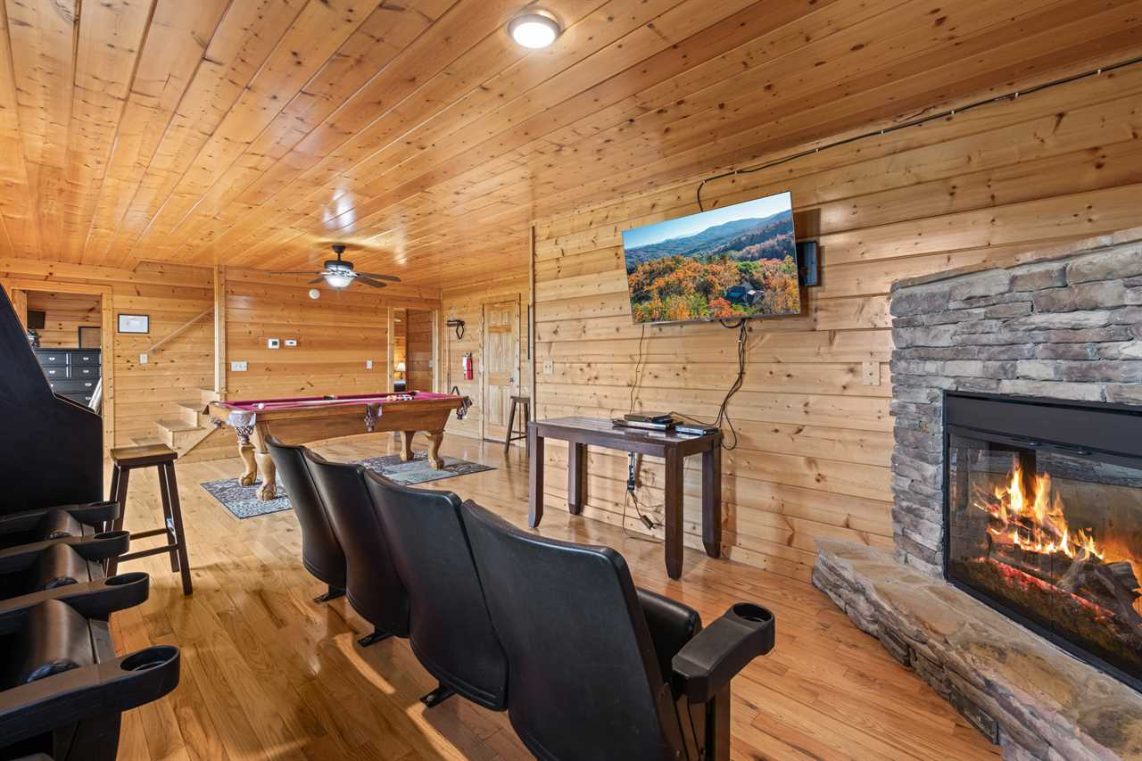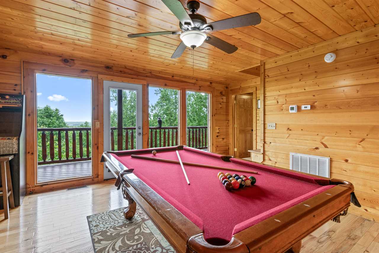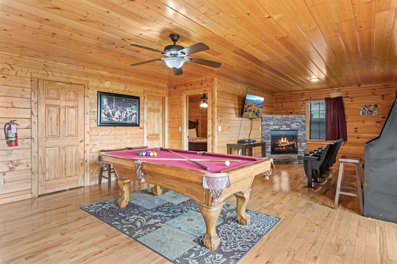 Moving up to the upper level, you will find 2 king bedrooms and a shared full bath, providing comfortable accommodations for guests. Descending to the lower level from the main floor, you will discover 2 more king bedrooms, a bedroom with a set of queen bunks, and 2 full baths. This level also features entertainment options such as a pool table, arcade game, and a sitting area with a 50-inch Roku TV,& a gas fireplace ensuring a fun-filled stay for all visitors, this game room also has access to another large covered deck with an ample size hot tub for relaxing water therapy.