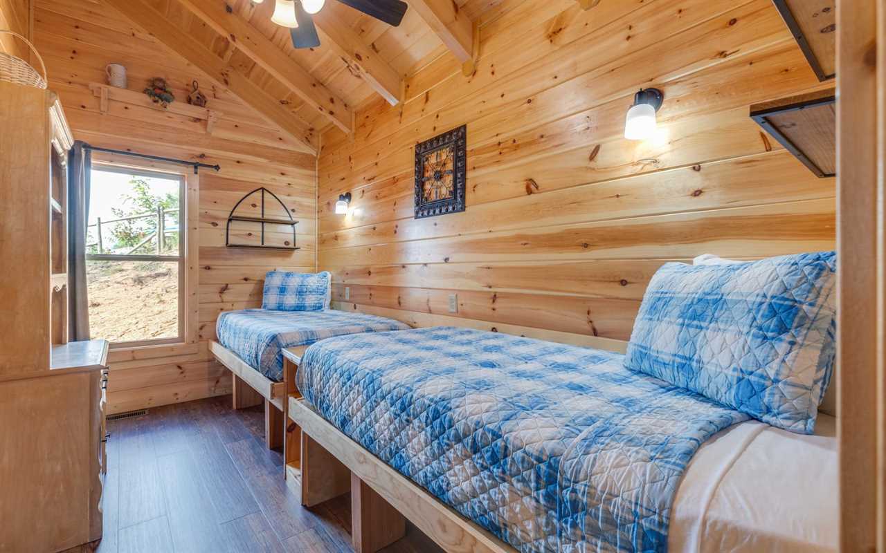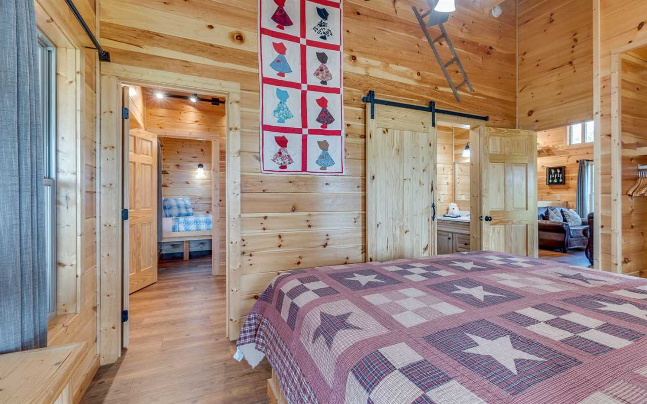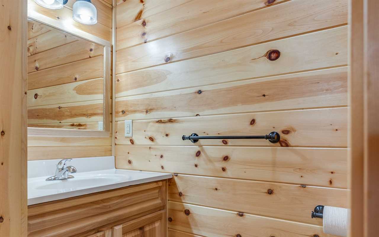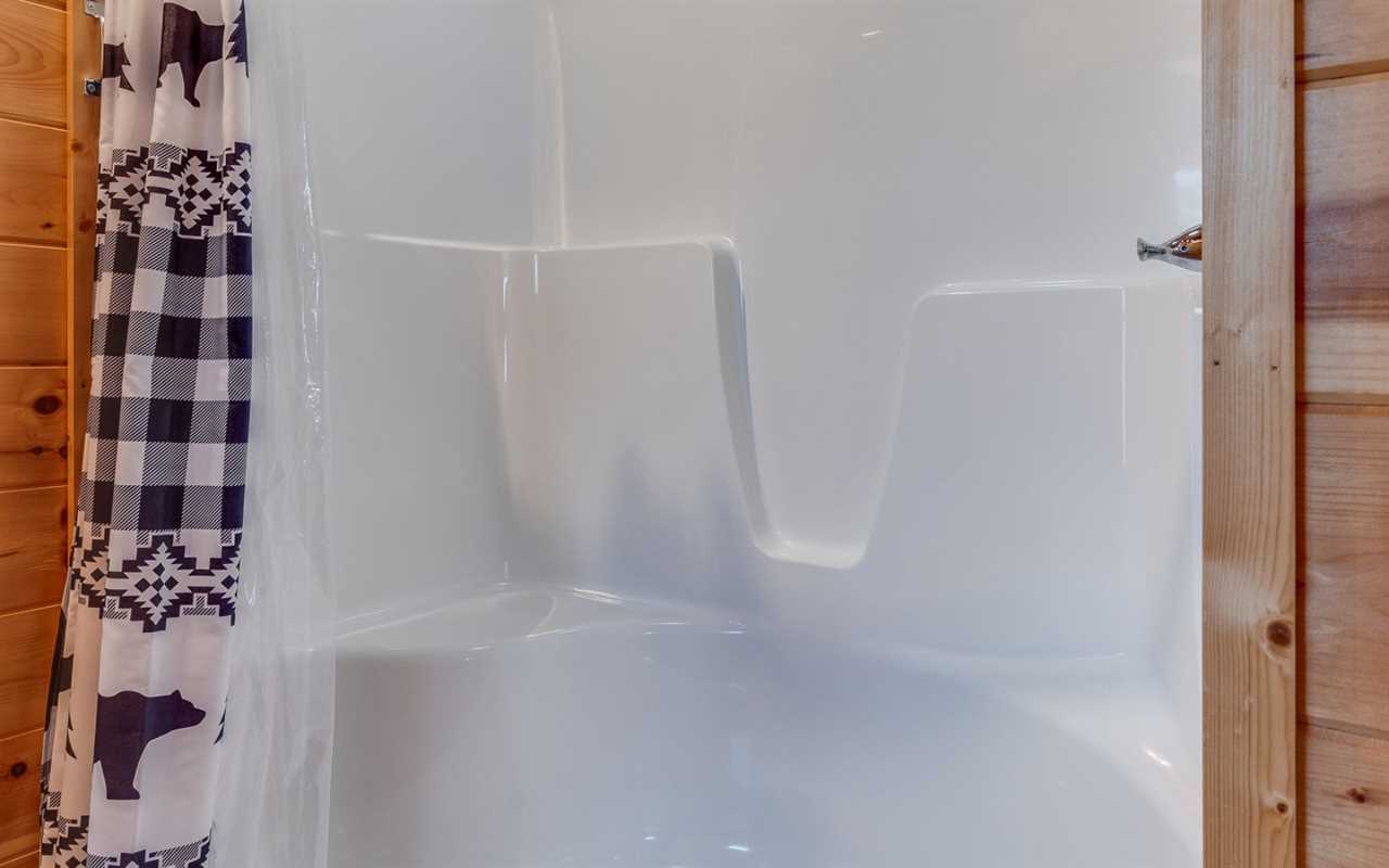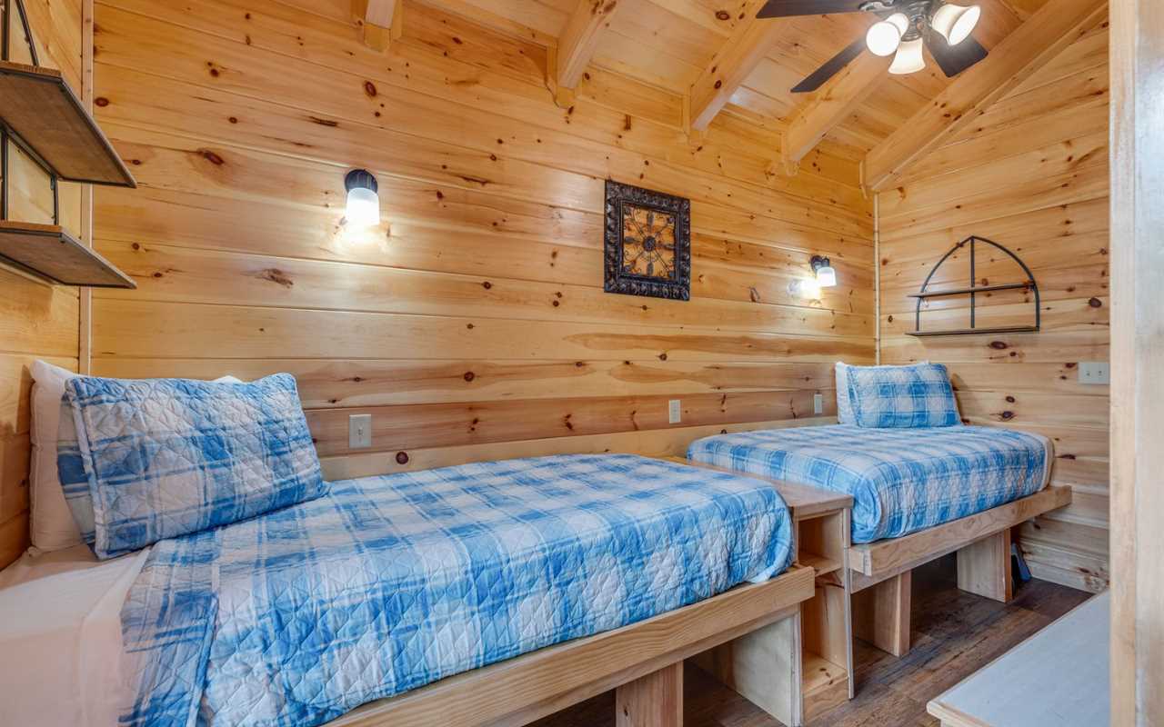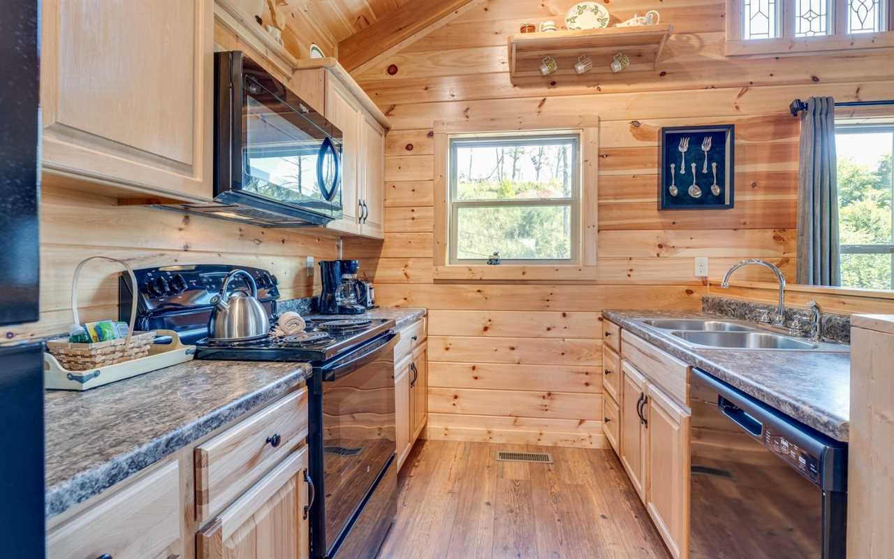 Life's a Bear is a 768 sq. ft. two-bedroom log cabin ideal for a short or long vacation away from the bustle of normal life. This cabin delights with its natural pine tongue-and-groove walls, exposed beams, and metal roof. The living area has a gas stone fireplace and large windows for an unsurpassed view of the expansive Smoky Mountains. Here, you can relax and watch the 50 in Samsung smart TV. The living room extends into the dining area and full kitchen. The washer/dryer unit is housed in an adjacent closet. Both bedrooms sleep two with ease and comfort. The master bedroom has a king bed and an open clothes closet. The second bedroom has two single beds elevated for storage space below. For added privacy, each bedroom has its own vanity (with toilet) room. Each has an entrance to the bathing room where the five-foot shower and the jetted tub are located.