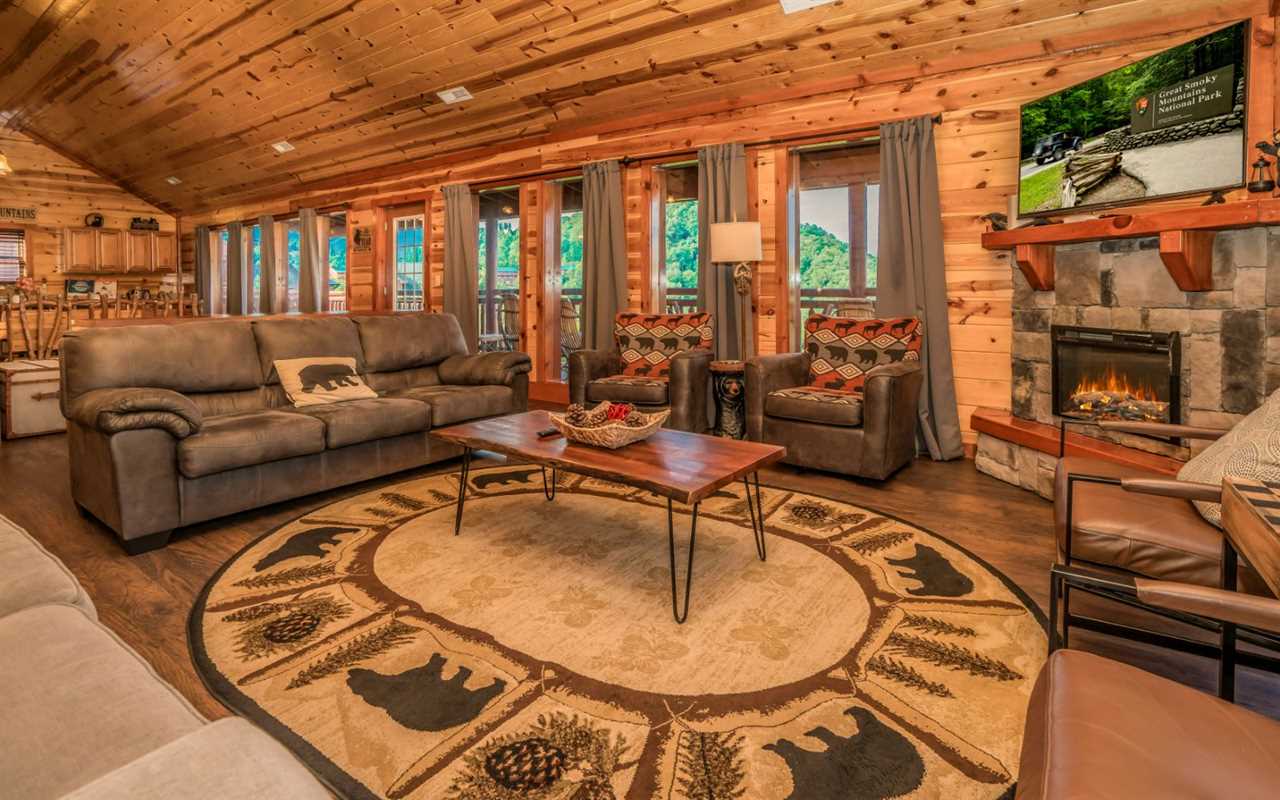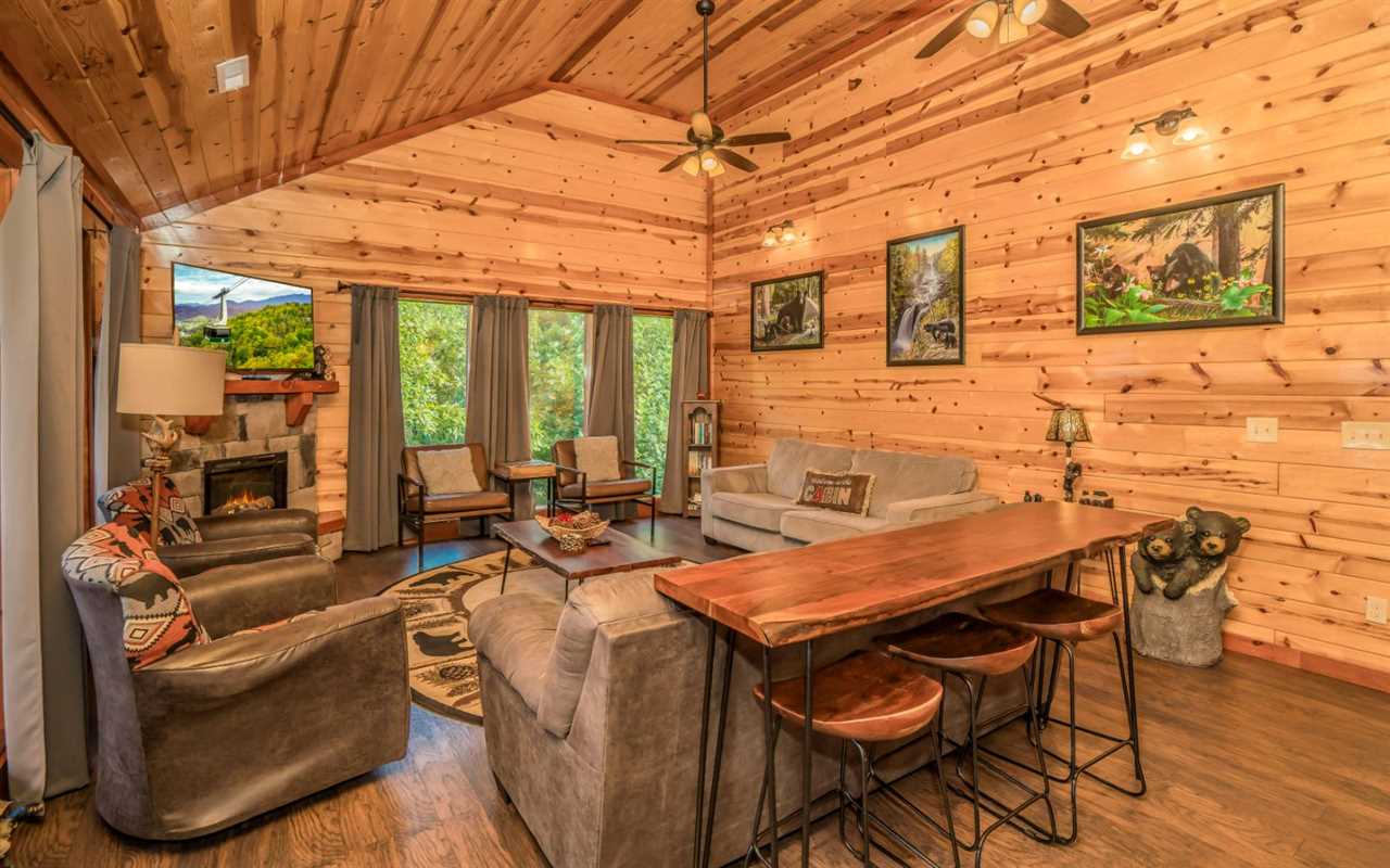 After exploring waterfalls, shops, and shows, return to unwind in this cozy living space. Floor-to-ceiling windows frame stunning mountain views and flood the room with natural light. Open to the dining and kitchen areas, it's perfect for group gatherings.
