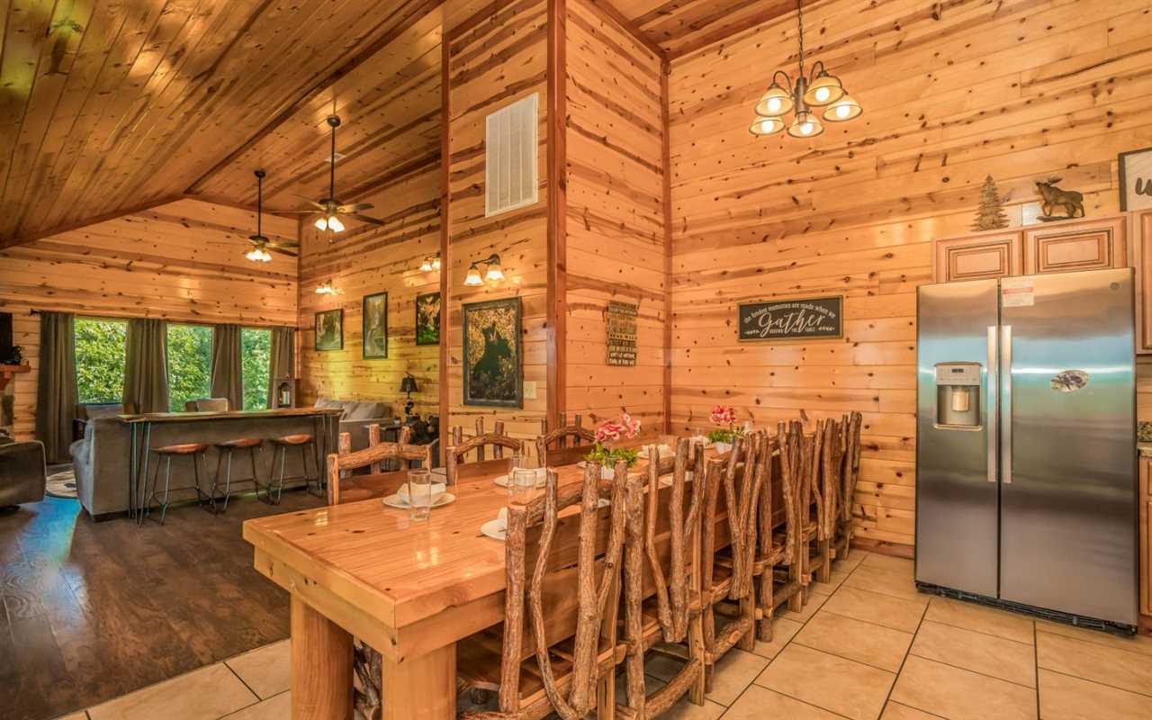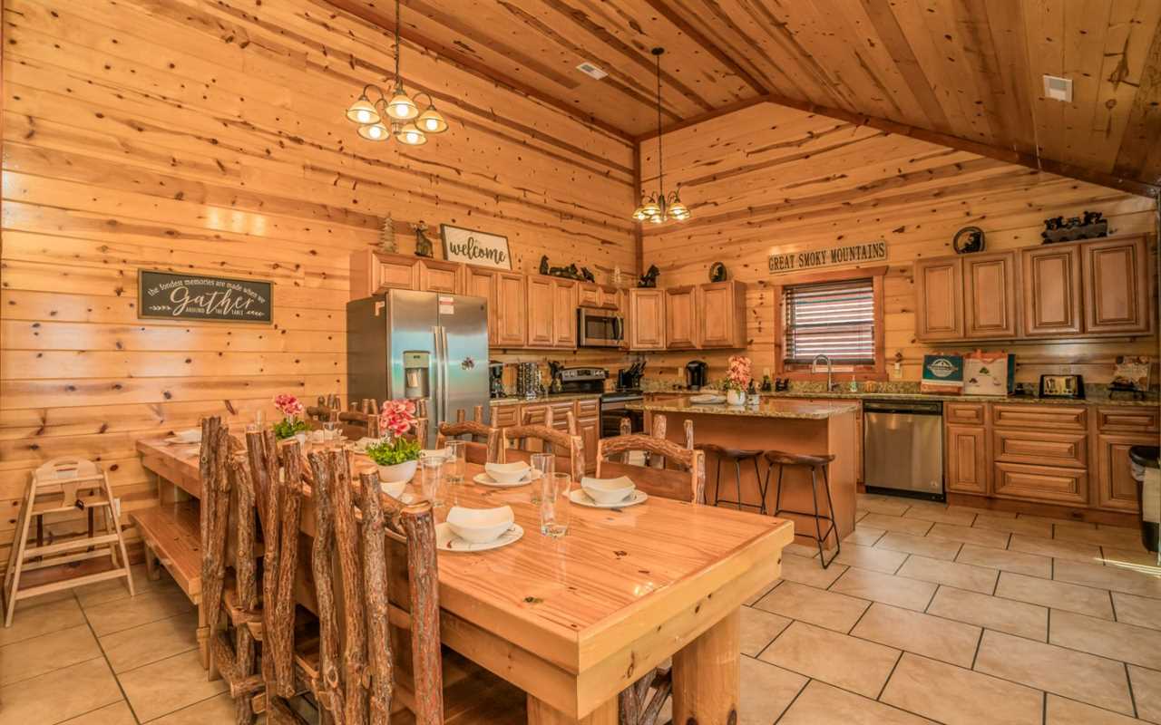Gather for meals or games at the spacious log-style dining table with additional seating nearby. Surrounded by windows, it's a warm, inviting space to spend time together.