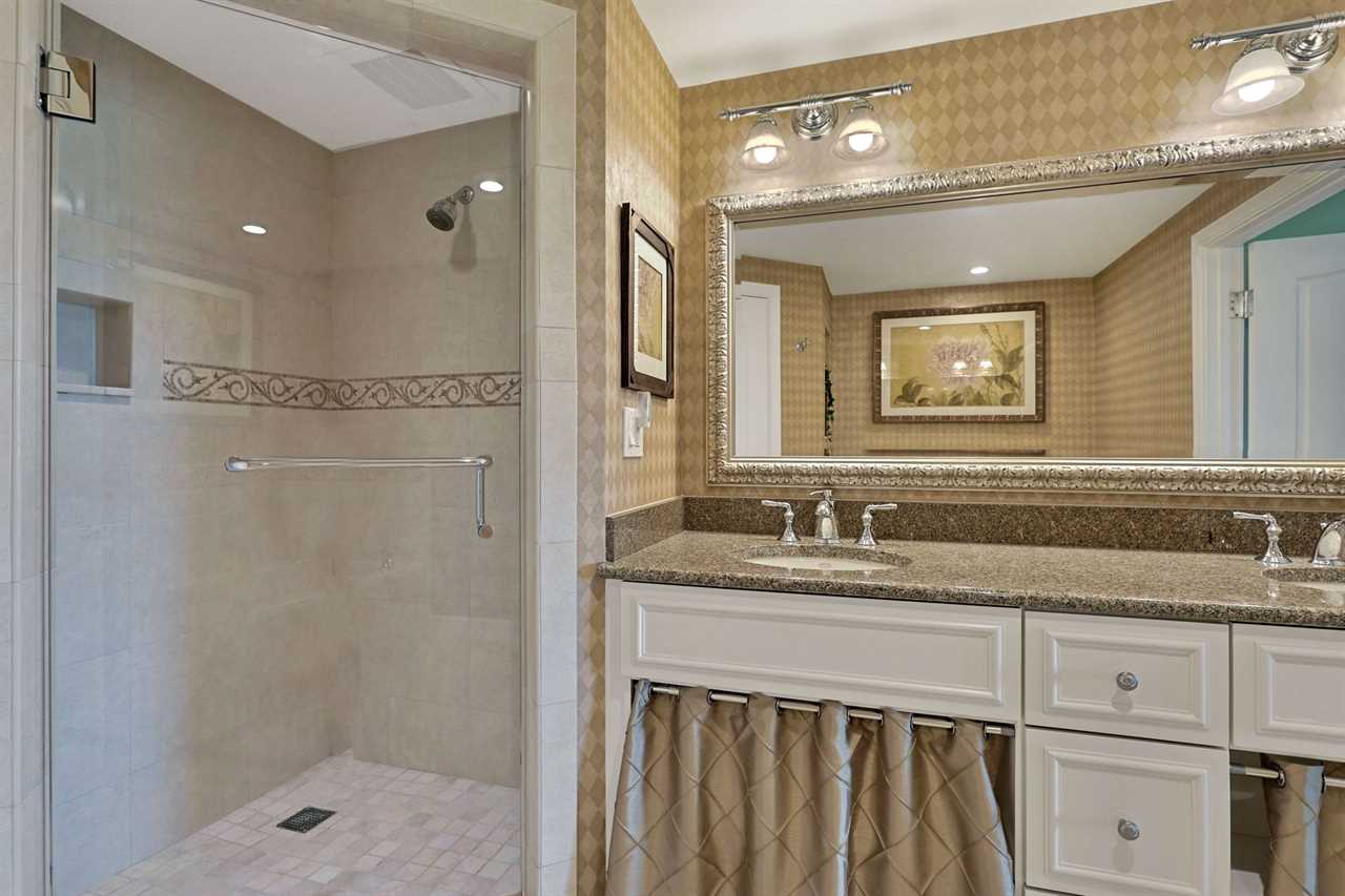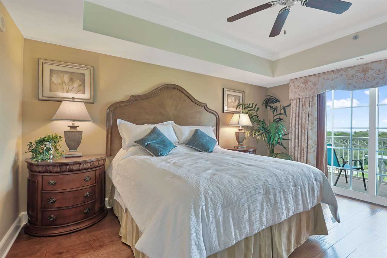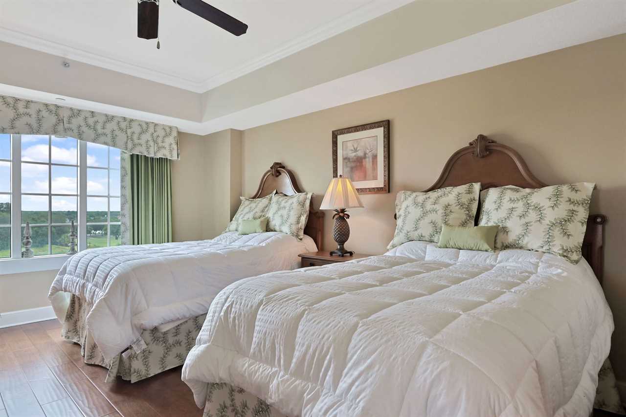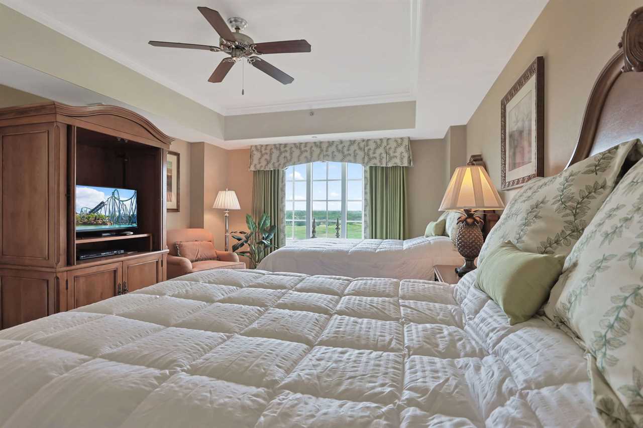 This exquisite condo boasts two master bedrooms for your comfort and privacy. To the left, the king master suite awaits, adorned with a ceiling fan, a cozy desk, and a smart TV for your entertainment. Step out onto the private balcony, where you can soak in the views while lounging on the provided table and chairs. The master bathroom features two vanities, a large tub, and a spacious shower, ensuring a luxurious experience.